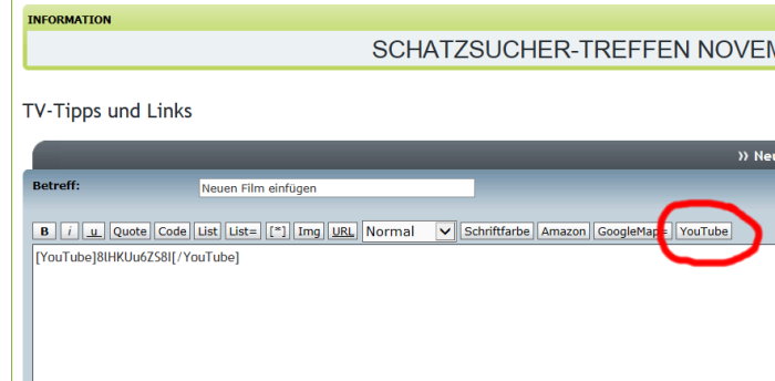 Zunächst kopiert man die Youtube-Filmnummer in das Einbgabefenster des Forums, markiert