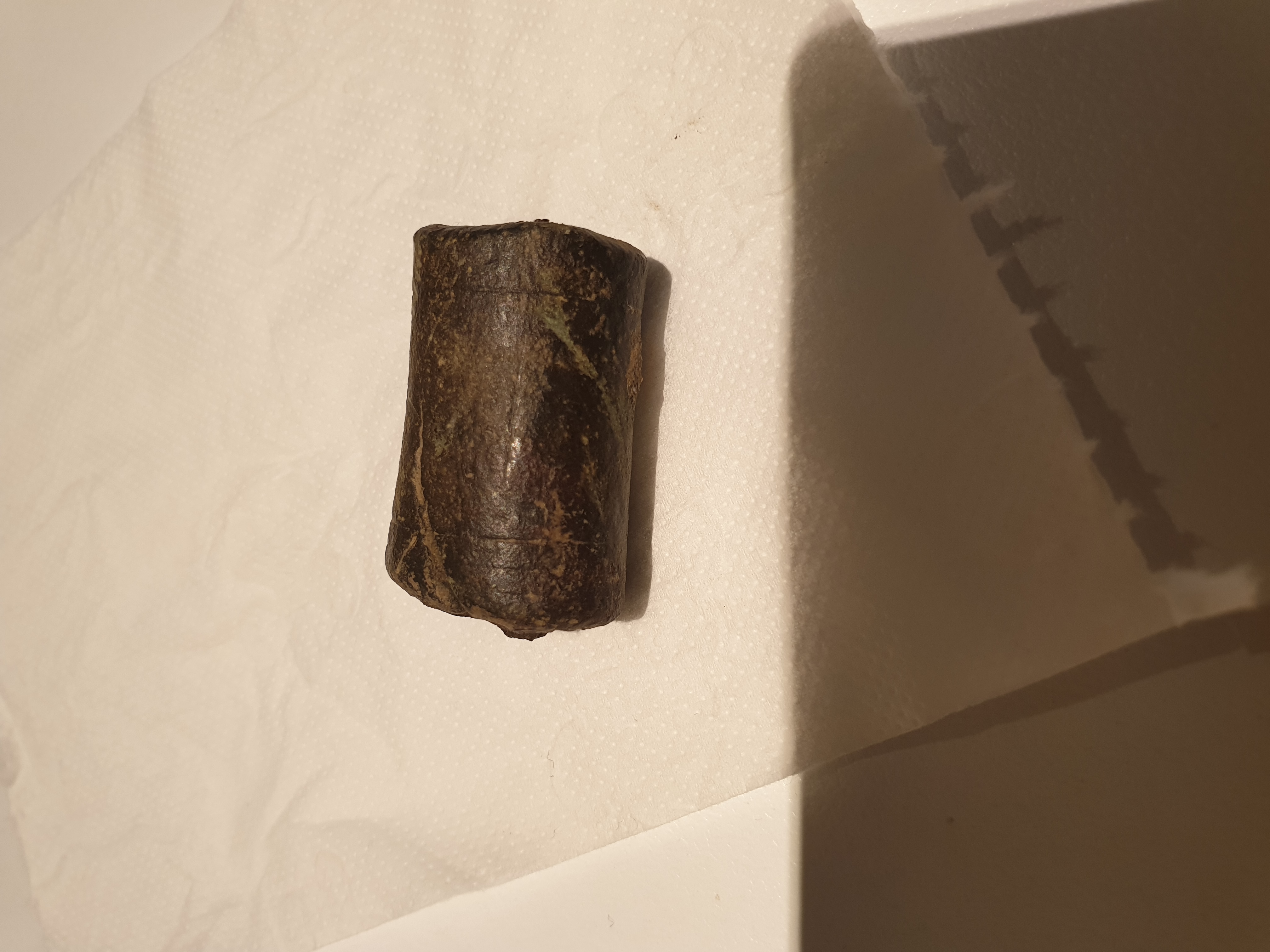 Hallo , vielleicht kann mir jemand von euch bei der Bestimmung behilflich sein. Maße ca.5x2 Zentimeter. Im Inneren scheint noch organisches Material zu sein und aufgrund der Linienartigen Verzierungen , erinnert es mich an einen Messerknauf. Vielen Dank im Voraus.
