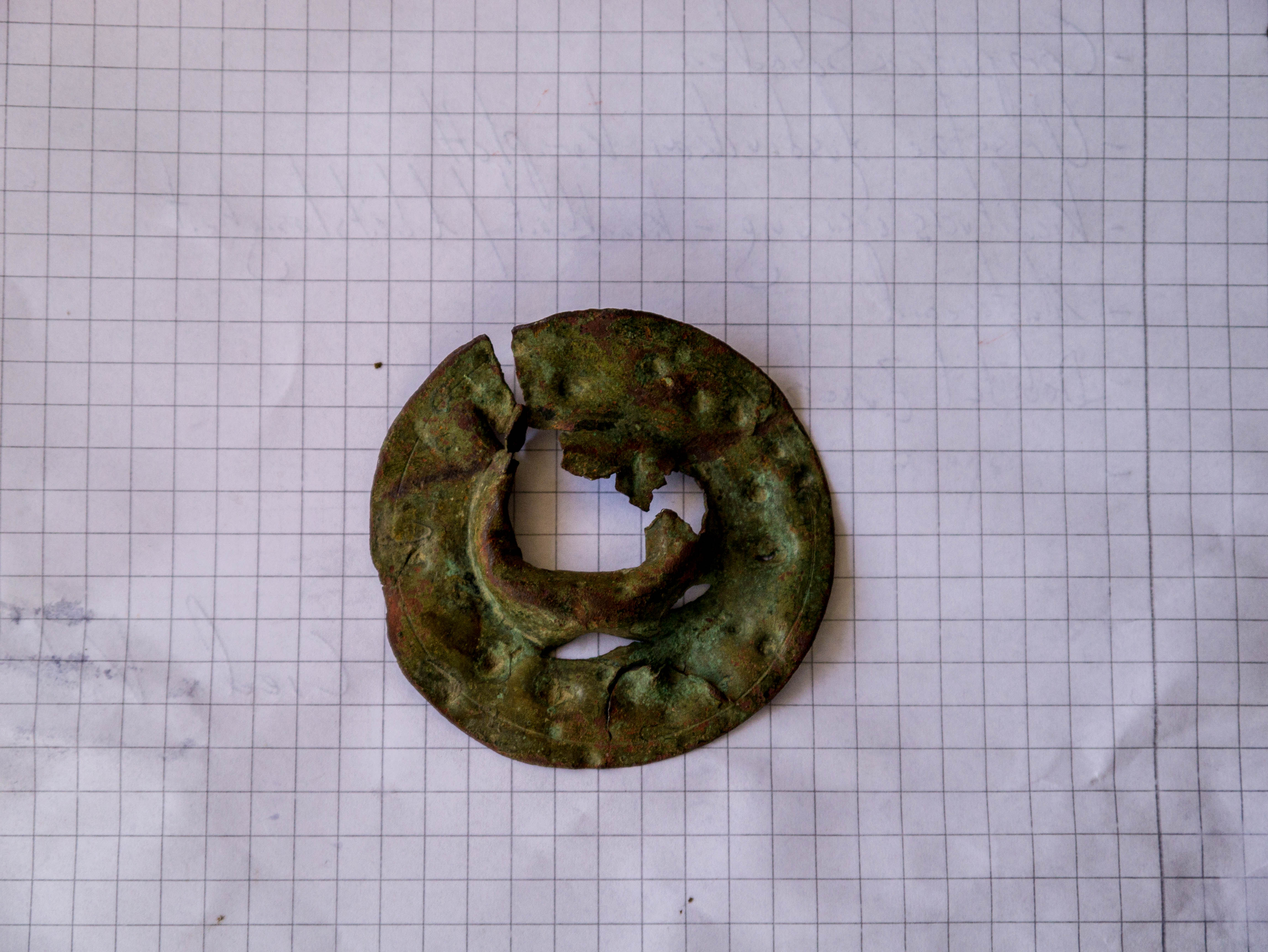 Es handelt sich vermutlich um Bronze. Ich vermute das es evtl Teil eines Schildes oder ein Handschutz einer Stichwaffe sein könnte.Interessant sind die vielen Ausbuchtungen unterschiedlicher Stärke. Ich bin gespannt was ihr dazu sagt.