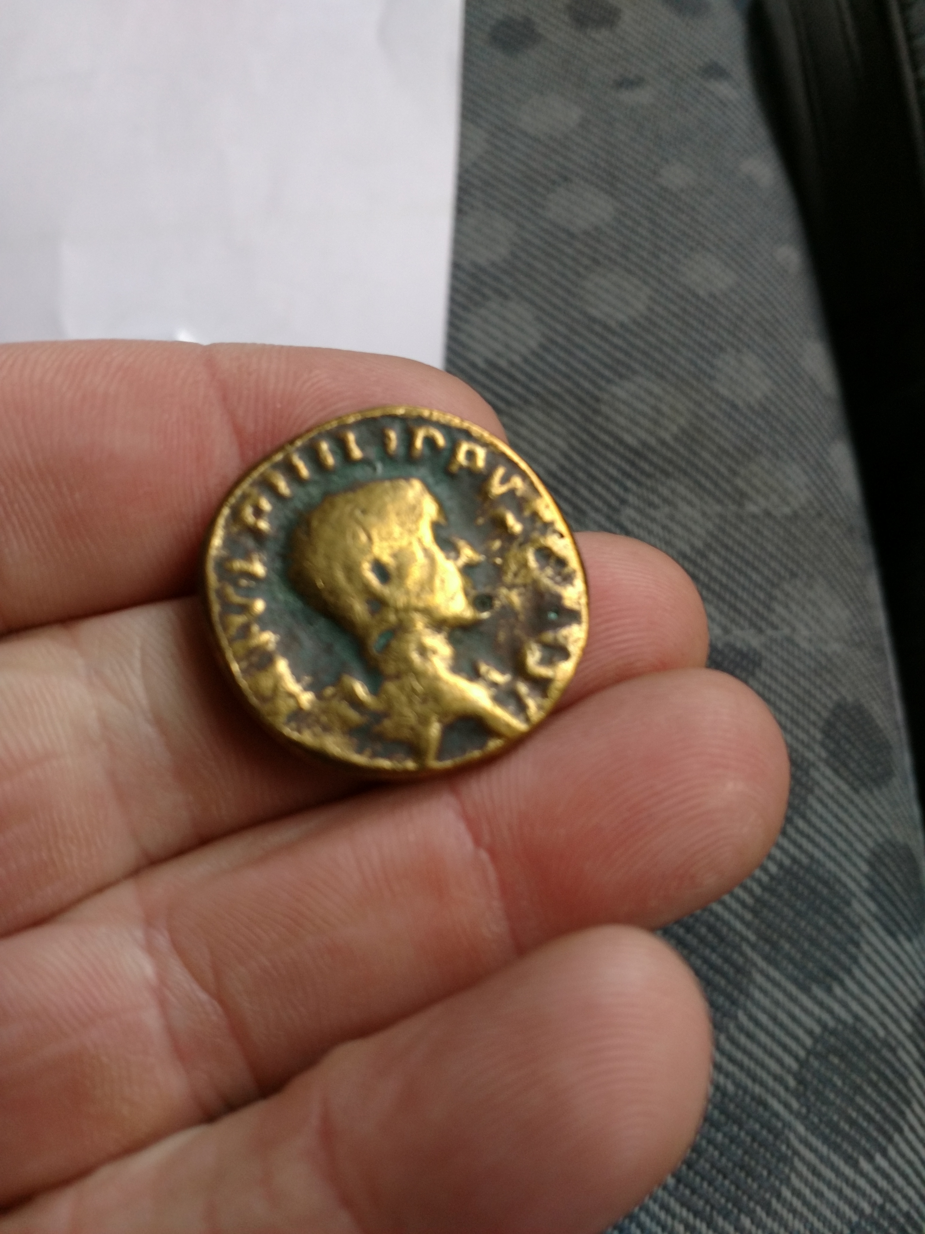 Münze lasse ich gerade vom Kumpel reinigen. Es schaut auch ob es eine goldene ist oder Art Gedenkmünze.