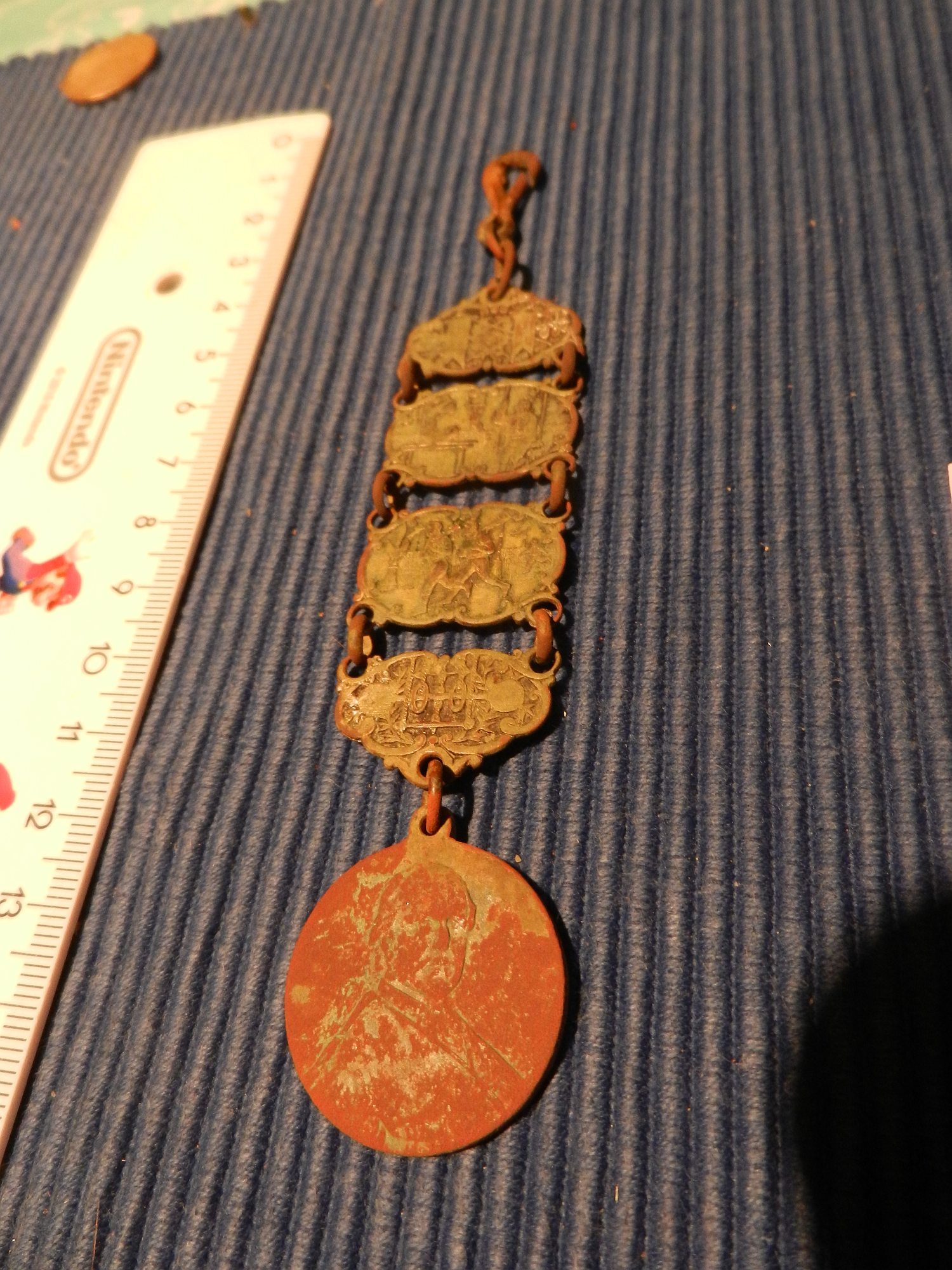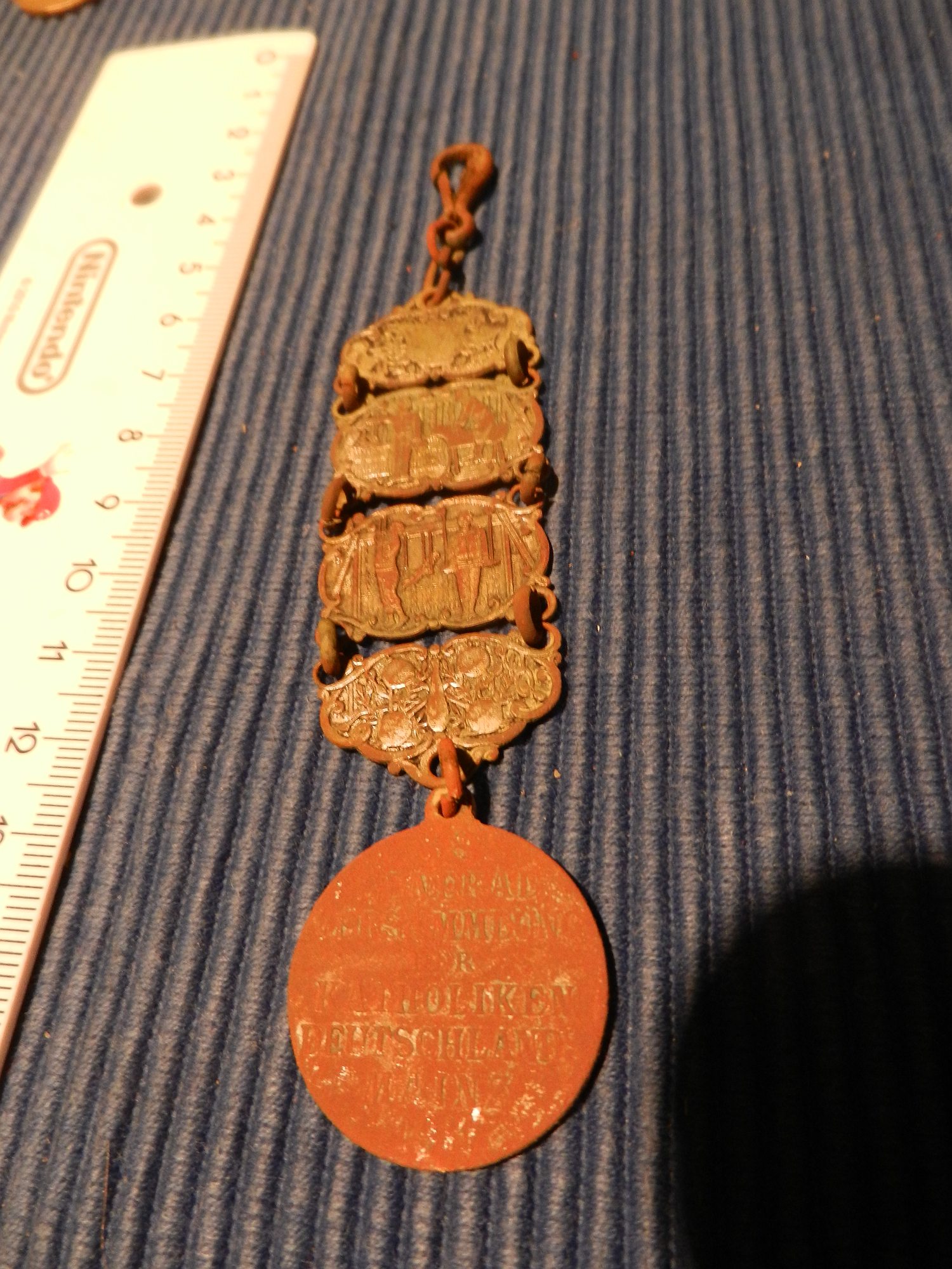 Zum Vorschein kam diese Medallie? sehr filigran gearbeitet, Inschrift Wetterau Versammlung der Katholiken Deutschland Mainz. Nach der verwendeten Schriftart (erinnert an DM) aber irgendwas neueres, und eine 10 Agorot (Israel), wurden gepraegt von 1960 - 75. Wie die auf ein Feld im tiefsten Hessen kommt.