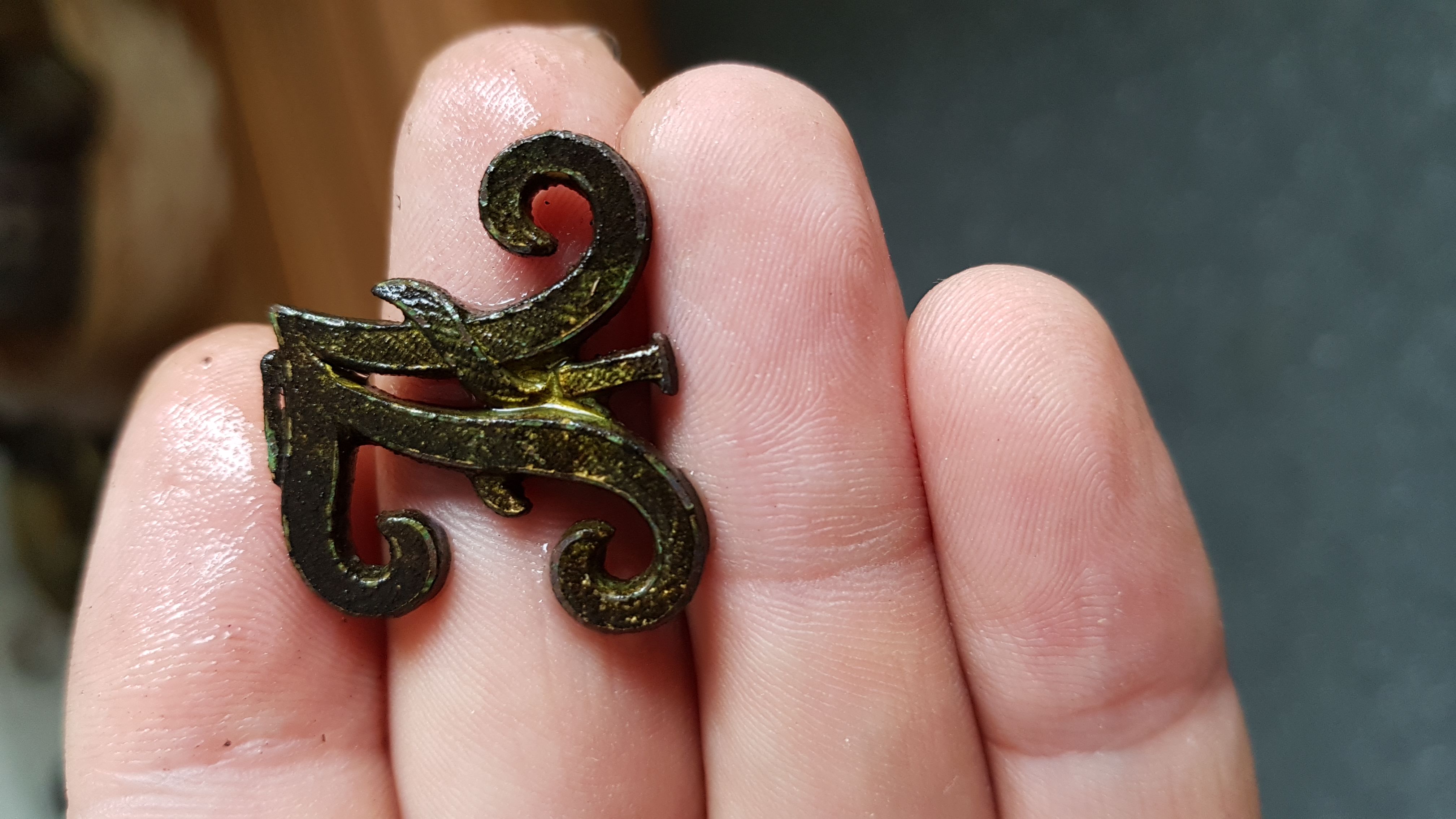 Hallo, ich habe dieses Schmuckstück in einer Waldlichtung nahe einer Dublosan- Kondom- Verpackung gefunden. Kann mir jemand sagen, ob dies ein Kettenanhänger, ein Teil eines Abzeichens oder ähnliches ist?