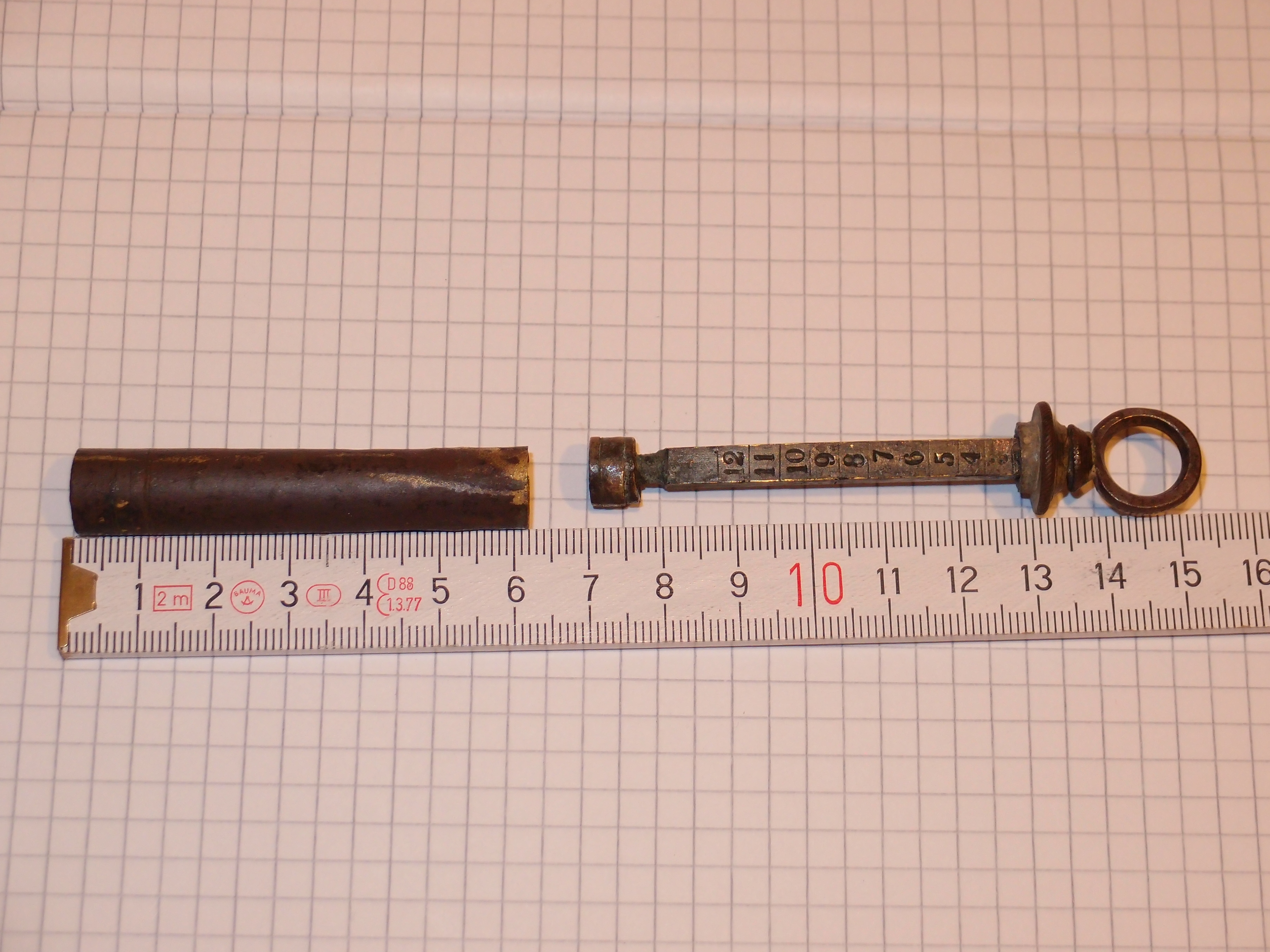Könnte ein Eingeber für pastöse Medikamente sein, Eingeber für Antiparasitika für Schafe sehen heute noch genau so aus, nur halt aus Plastik.