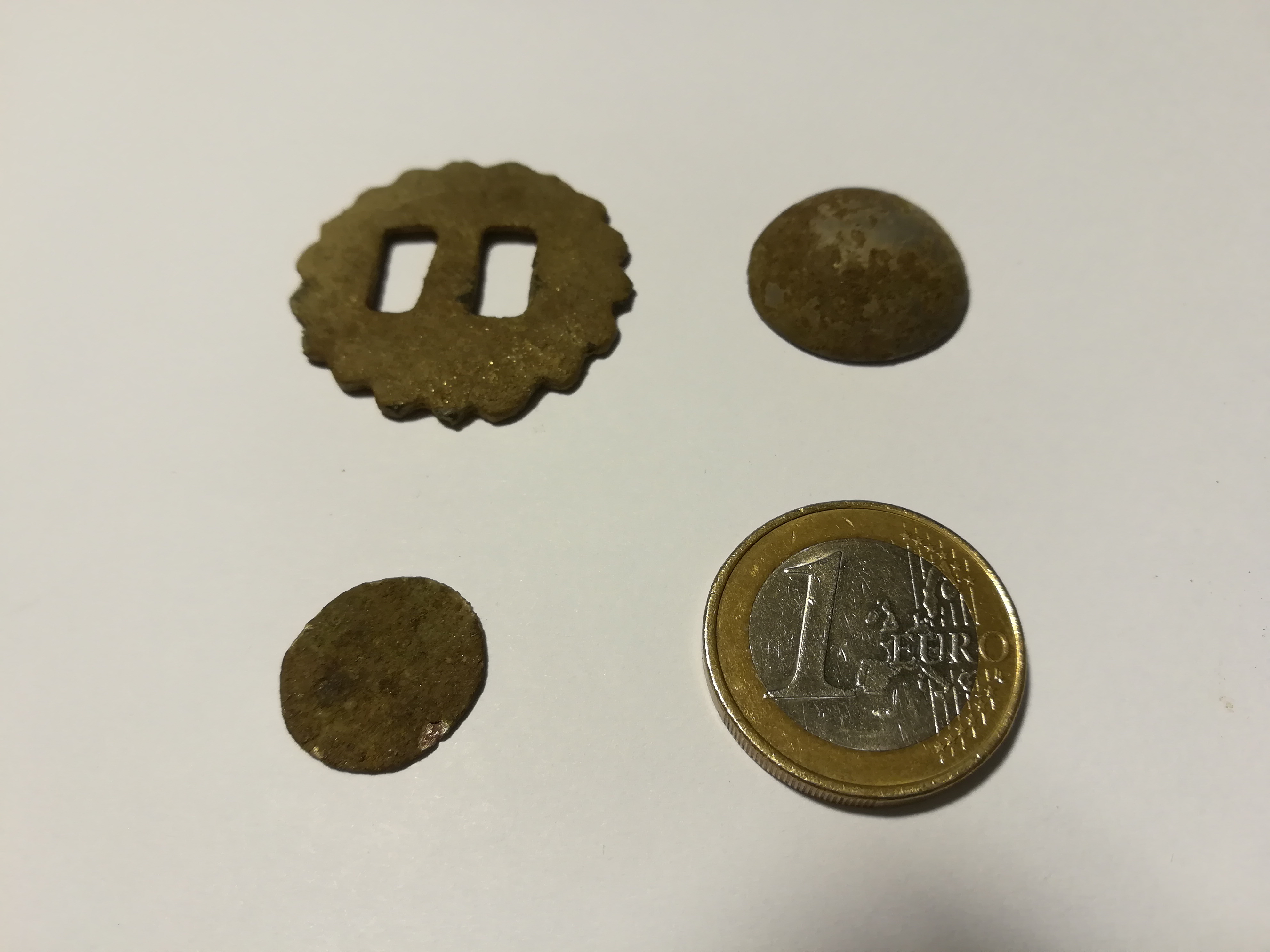 3. eine Schnalle, Material könnte Bronze sein.