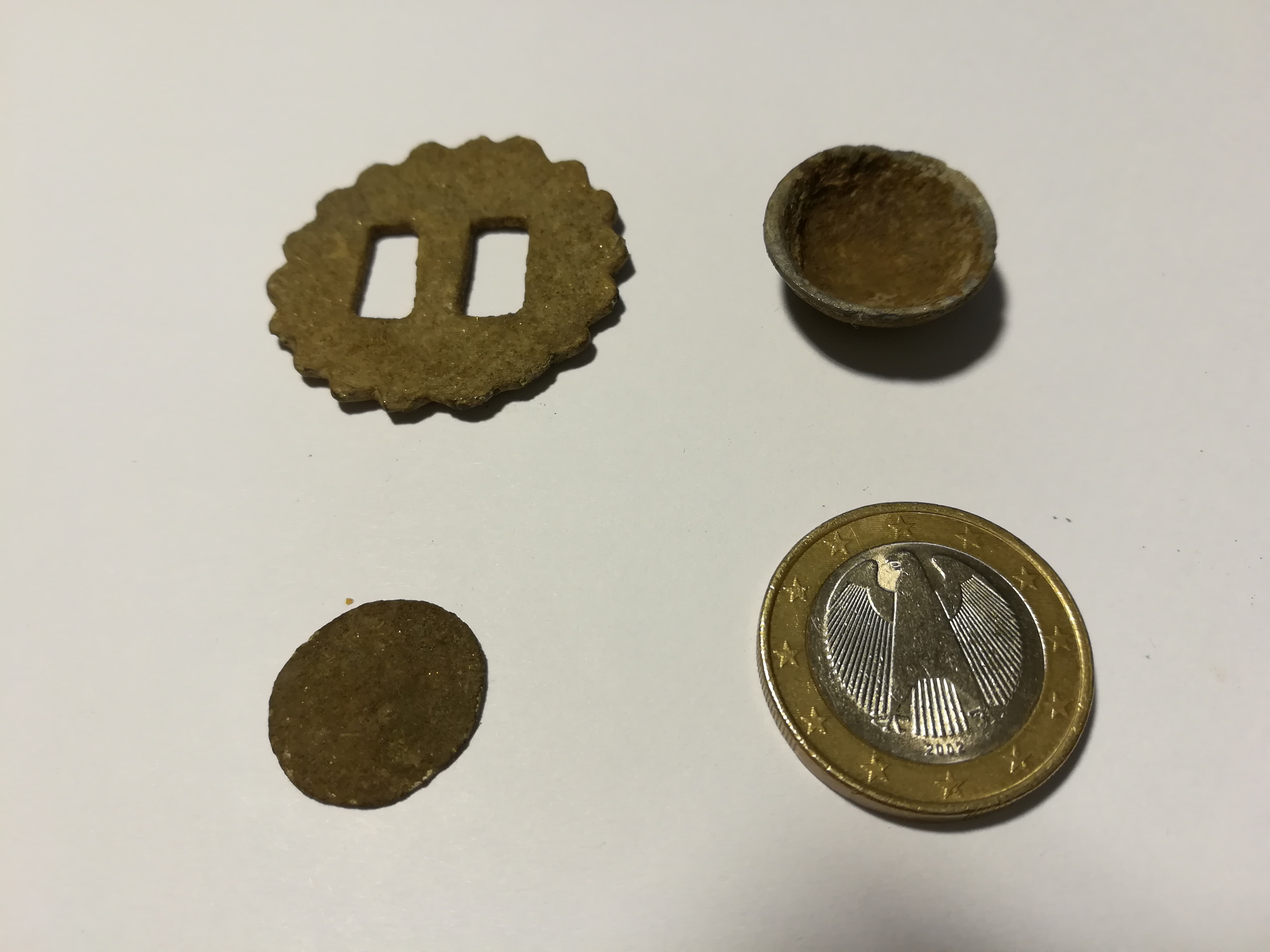 1. Ein flache (wahrscheinlich) Münze, die am Rand leicht silbrig glänzt