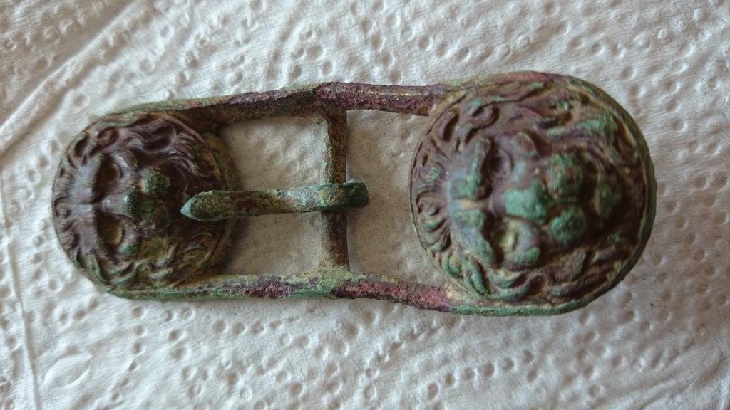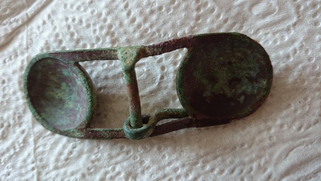 Habe diese schöne Schnalle gefunden. Vermute das sie für Hosenträger oder sowas in der Art war. Versilbert müsste sie auch gewesen sein. Man erkennt kleine Silberreste.