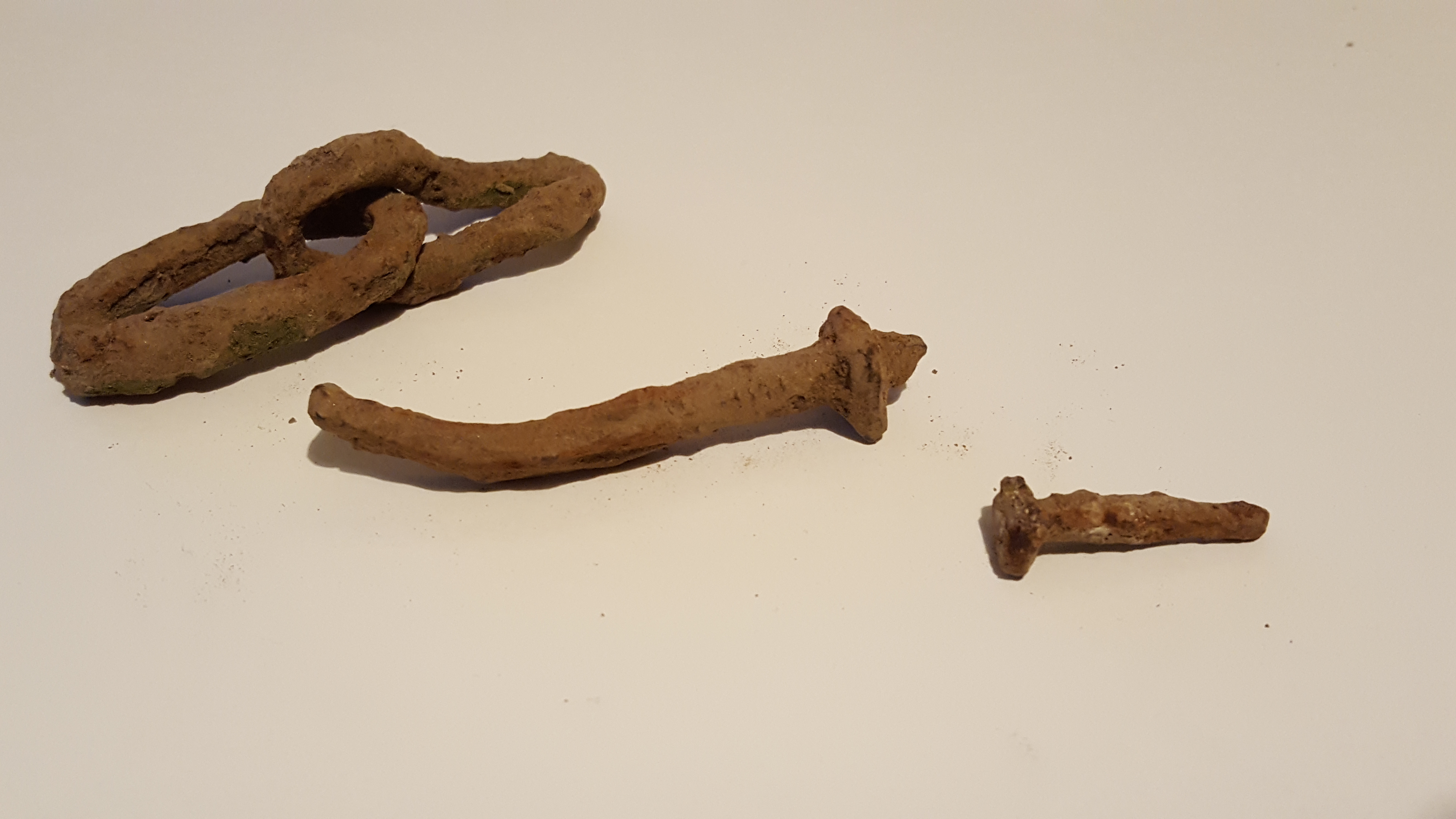 ich bin derzeit nur mit einem Pinpointer ausgestattet unterwegs und habe am Feldrand heute erstmalig etwas gefunden: Kettenglieder und 2 Nägel. Kann man diese Form der Nägel datieren? Zu was könnten sie gehört haben?