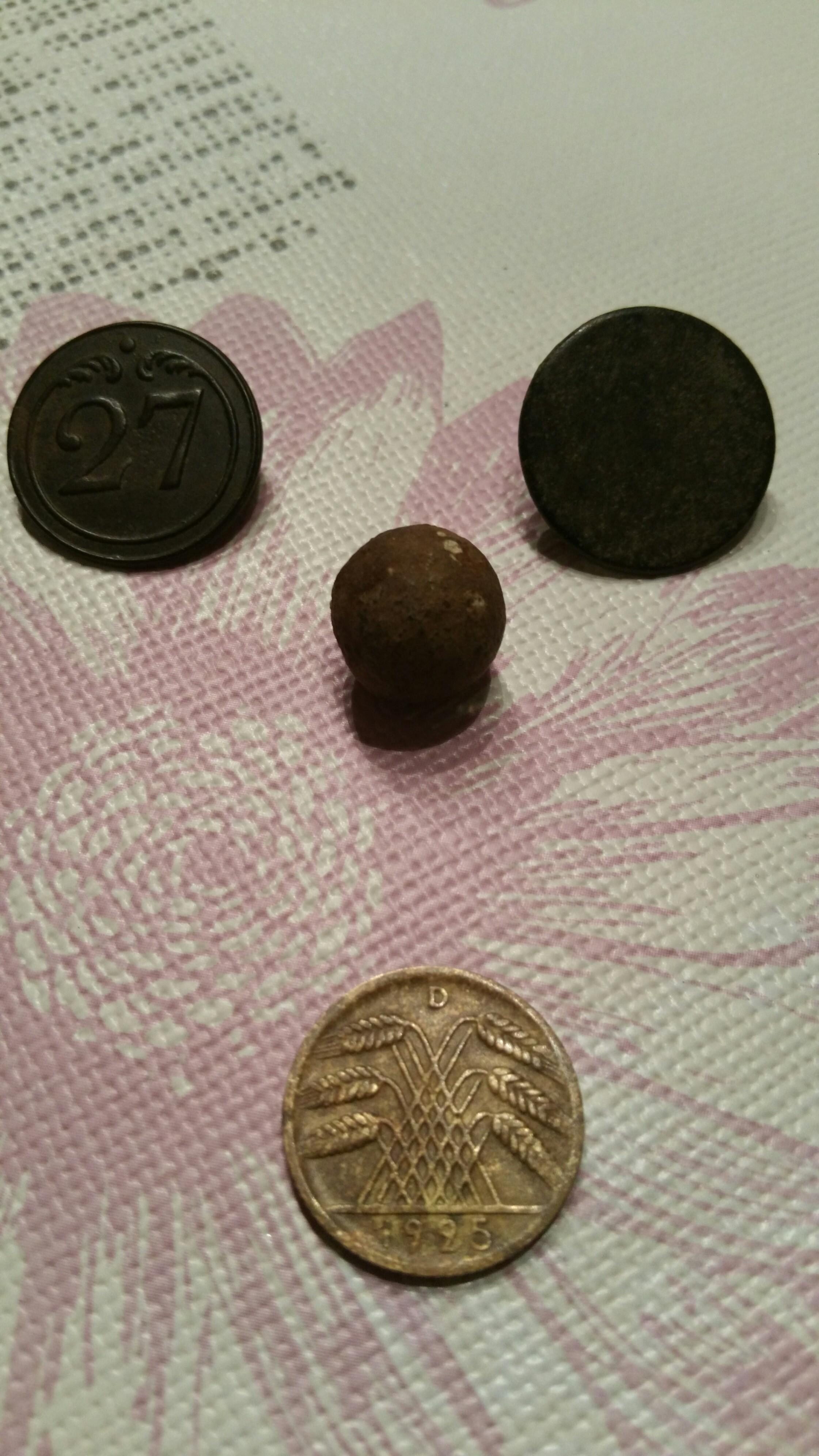 Außerdem habe ich noch einen sehr gut erhaltenen Knopf von der 27. Linieninfanterie gefunden. Habe schon herausfinden können, dass es ein großer ist (22mm) und daher von einer Uniformjacke stammt. Der gute Zustand rührt sicherlich daher, dass der Ring in sandigem Boden lag