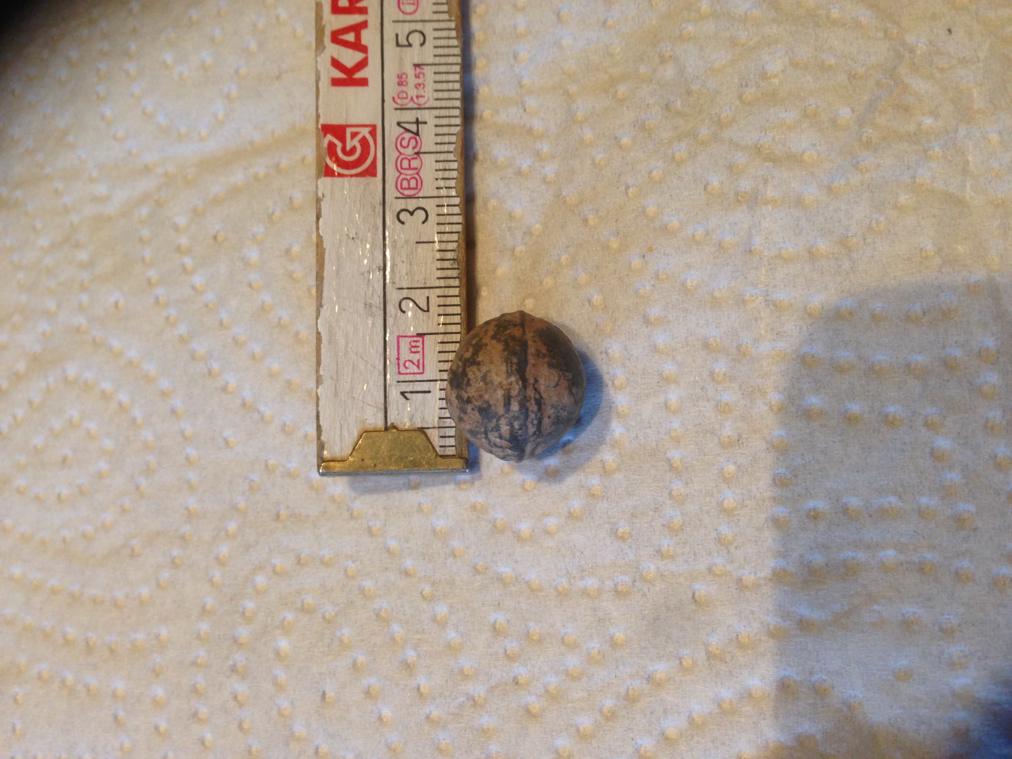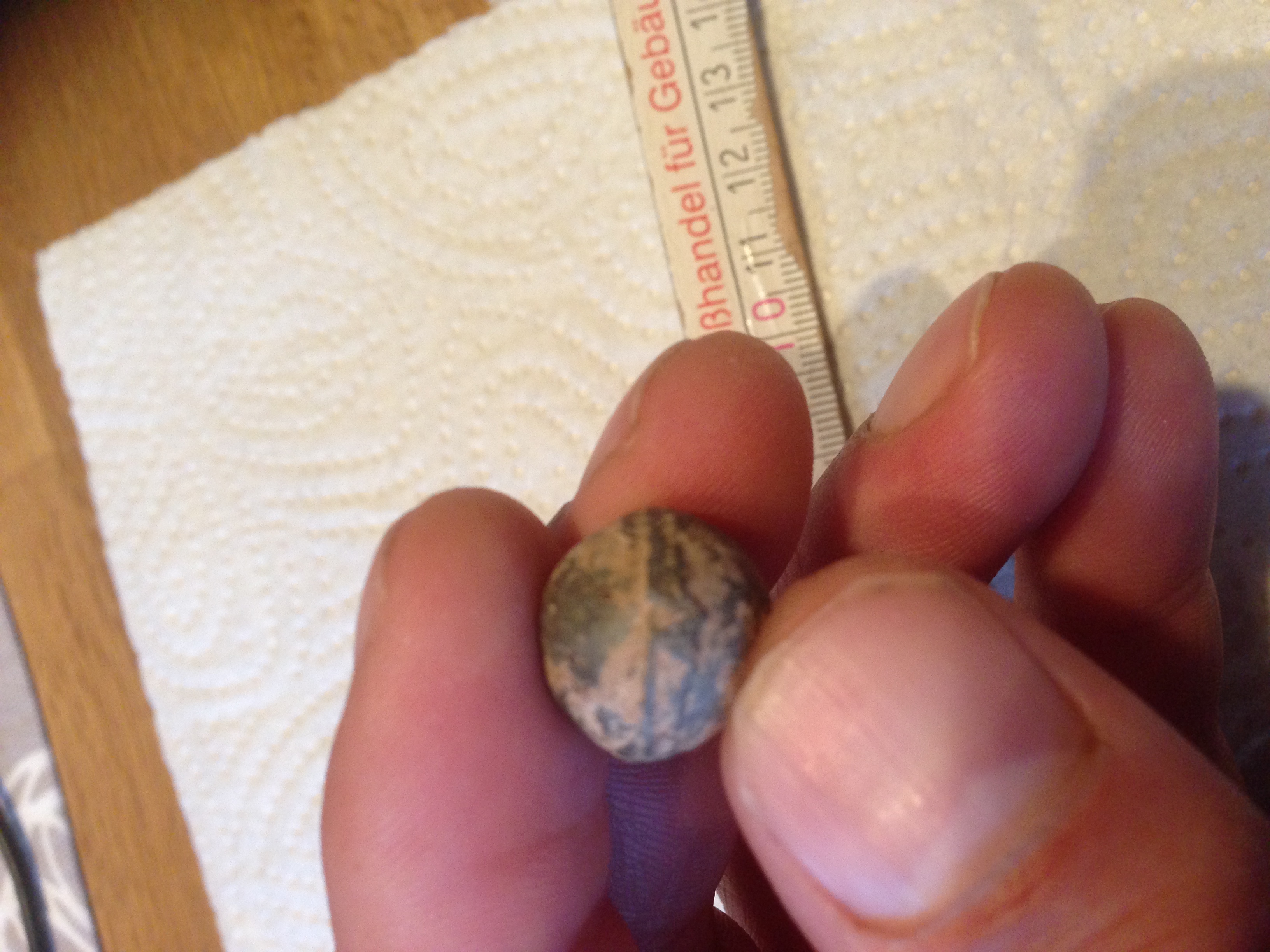 hab sie von gleichen acker wie die beiden grösseren Kugeln gefunden.an einem alten Wasserschloss aus dem 11.Jhrt.