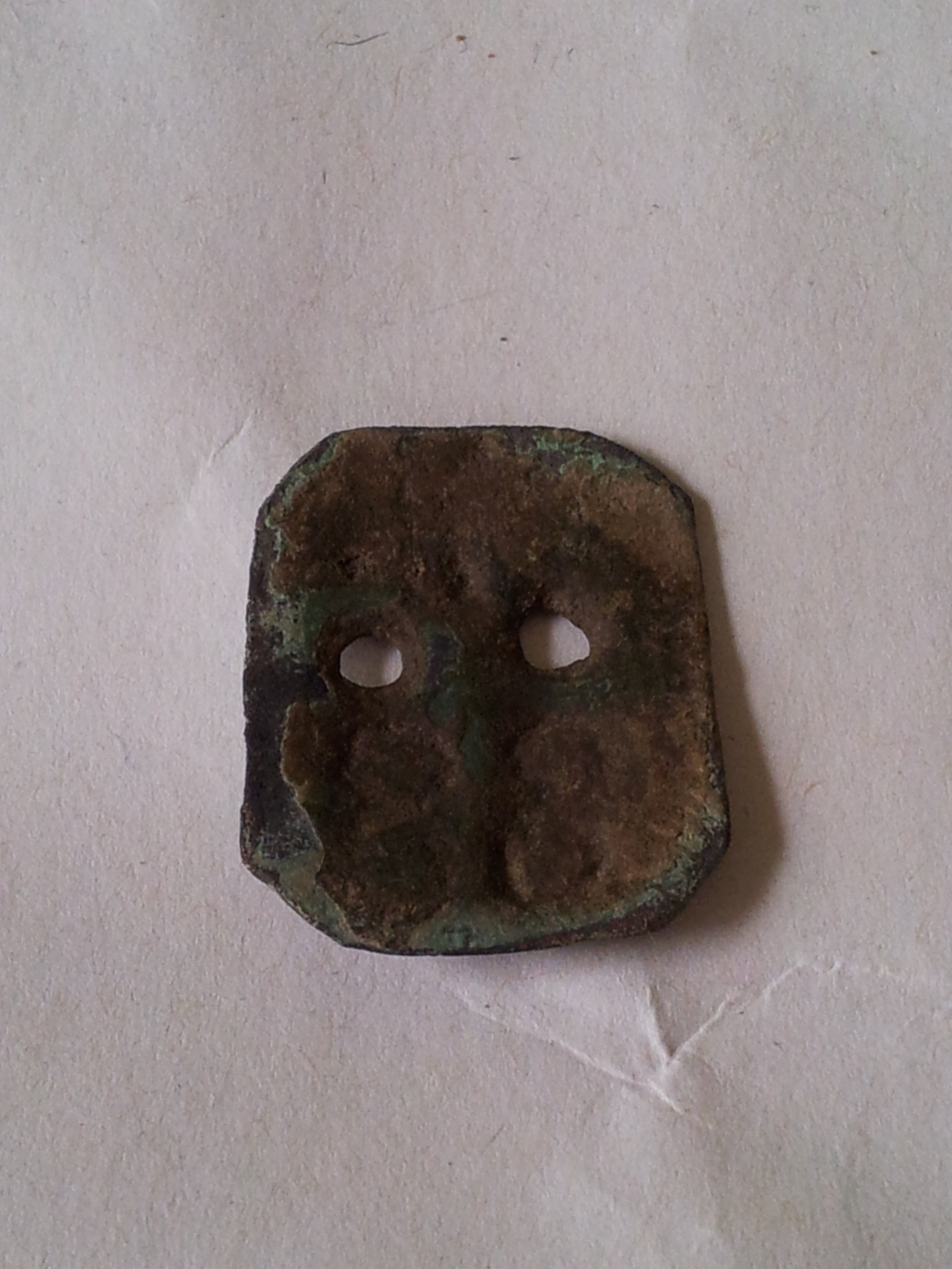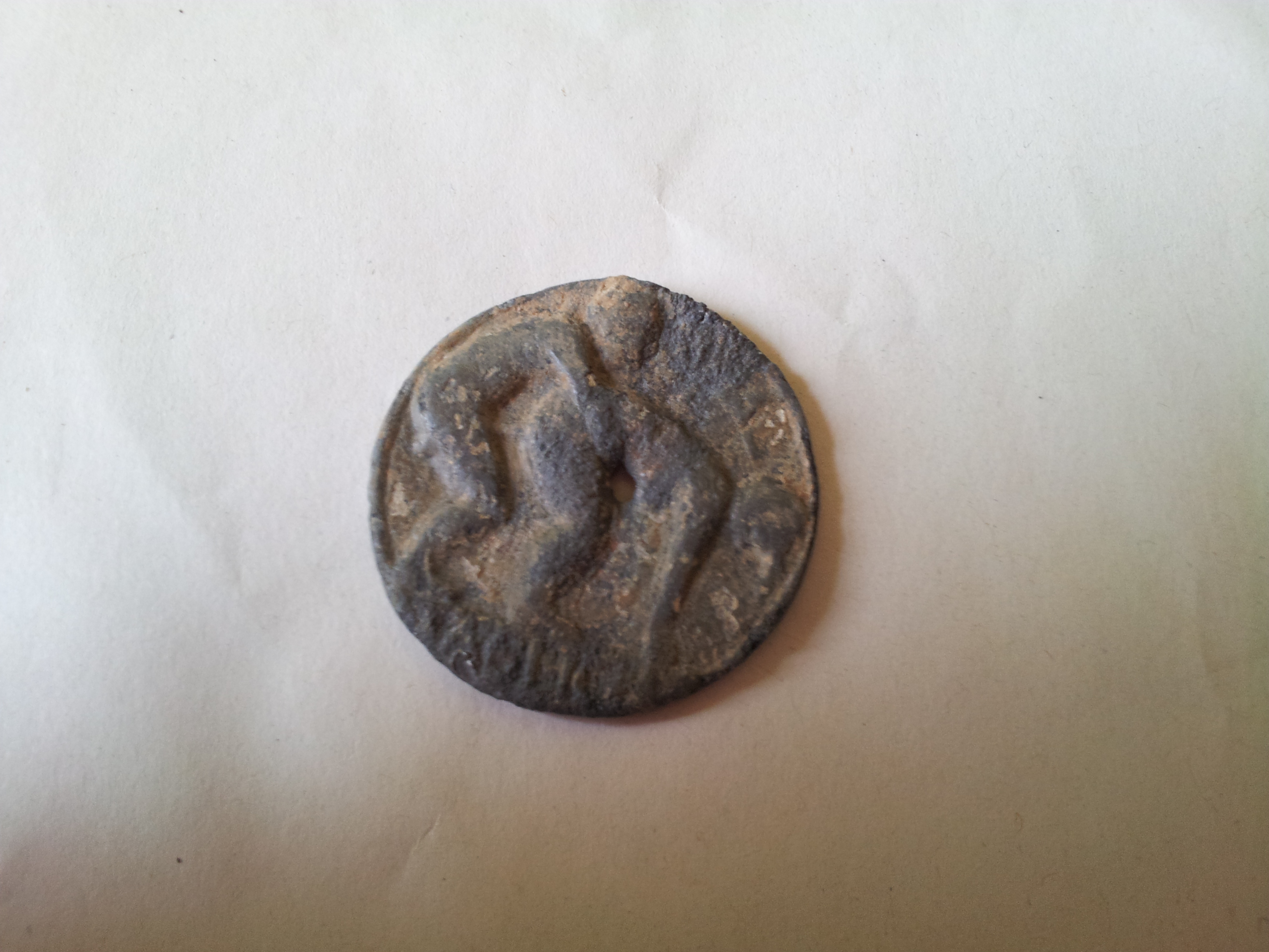 ich fand am Wochenende diese Münze. So groß wie ein 5 DM Stück und schwer. Die Rückseite ist platt. aber die Vorderseite ließ mich staunen, nachdem ich die Münze sauber hatte. Die Reste der darauf befindlichen Schrift ist nicht mehr zu erkennen. Seht euch einfach mal das Bild an, vielleicht weiß jemand etwas dazu?