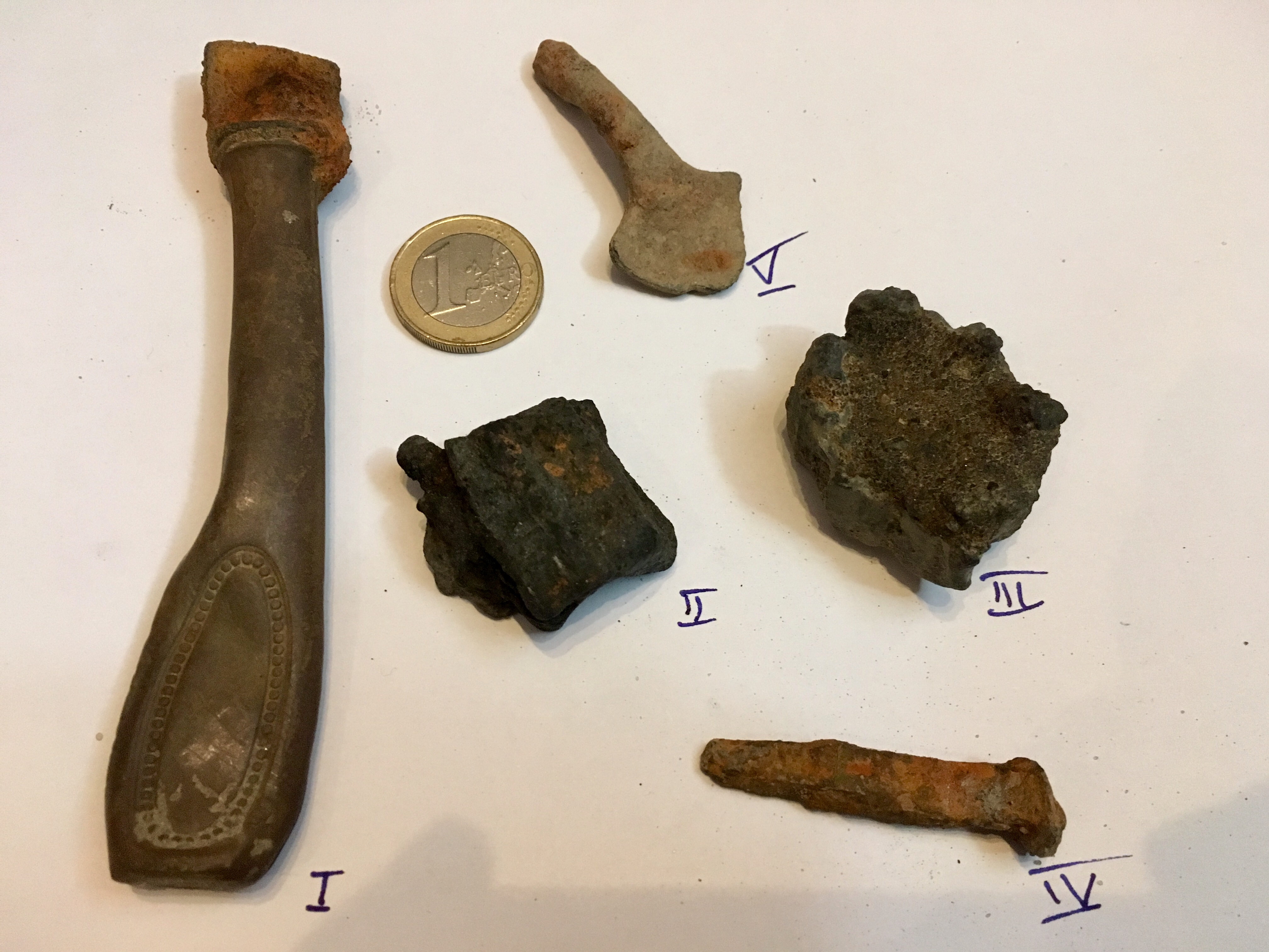 Mit Messergriff stimme ich bei I zu. II und III ganz sicher keine Meteorite (evt Schlacken). IV wahrscheinlich ein Nagel. Bei V habe ich keine Ahnung aber sieht nach Zink aus.