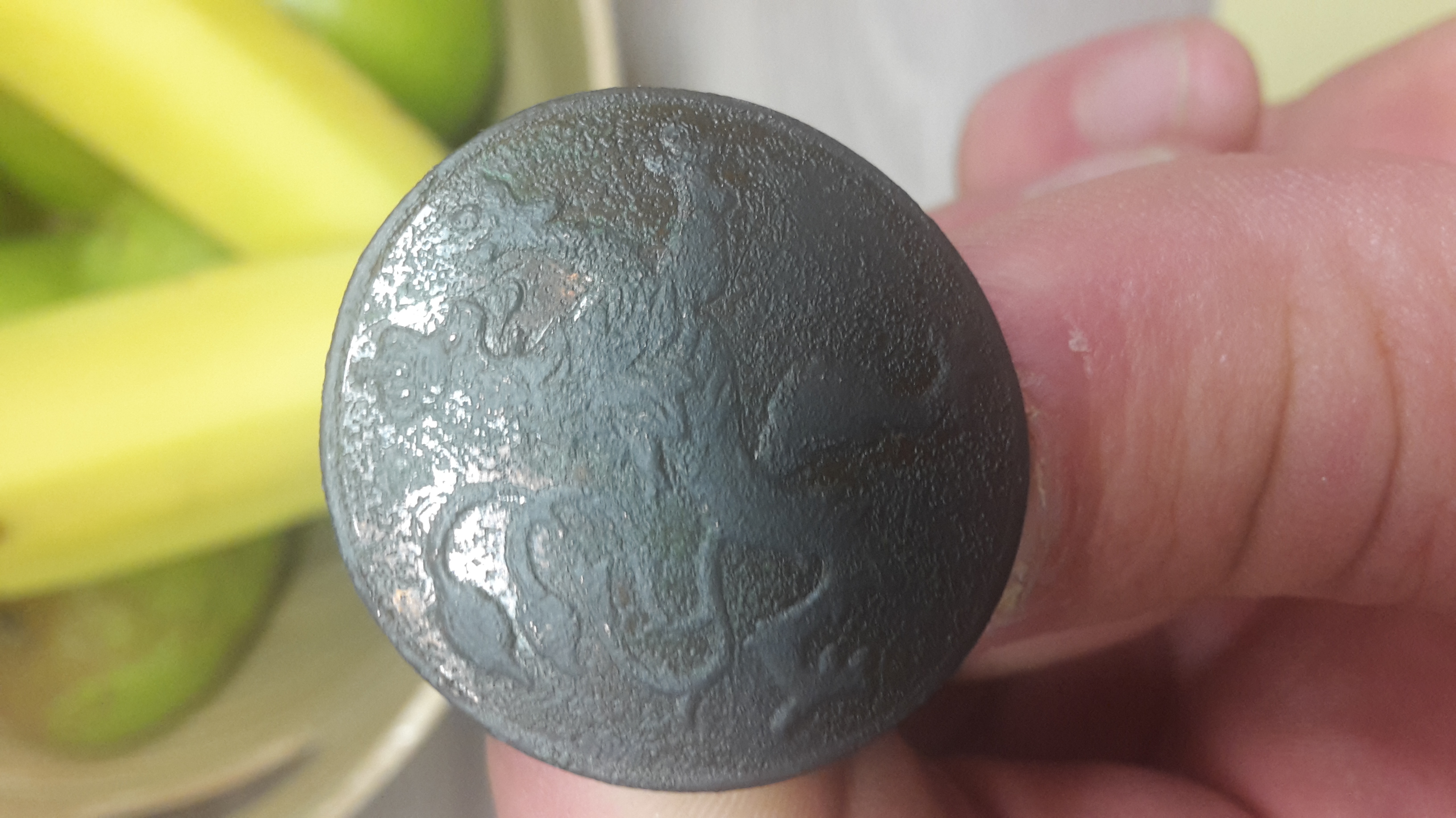 Der Knopf schimmert auf der Vorderseite Bronze Farben, wie eine Legierung wo mal drauf war.