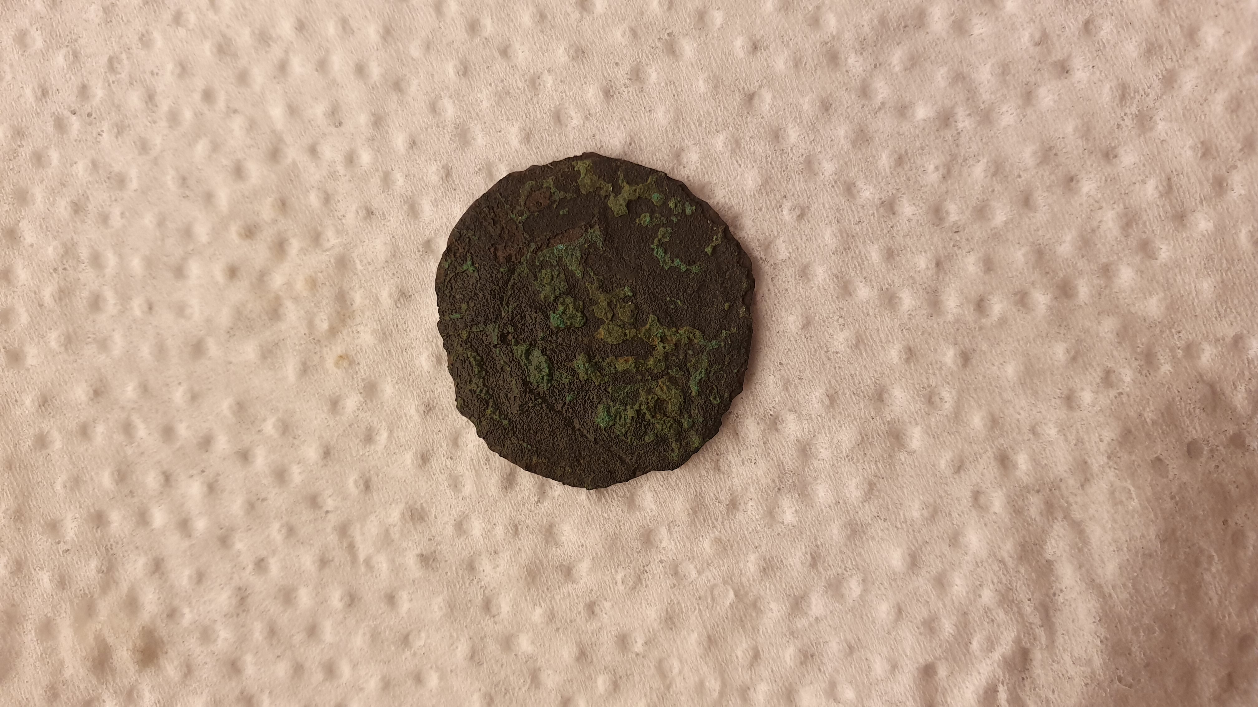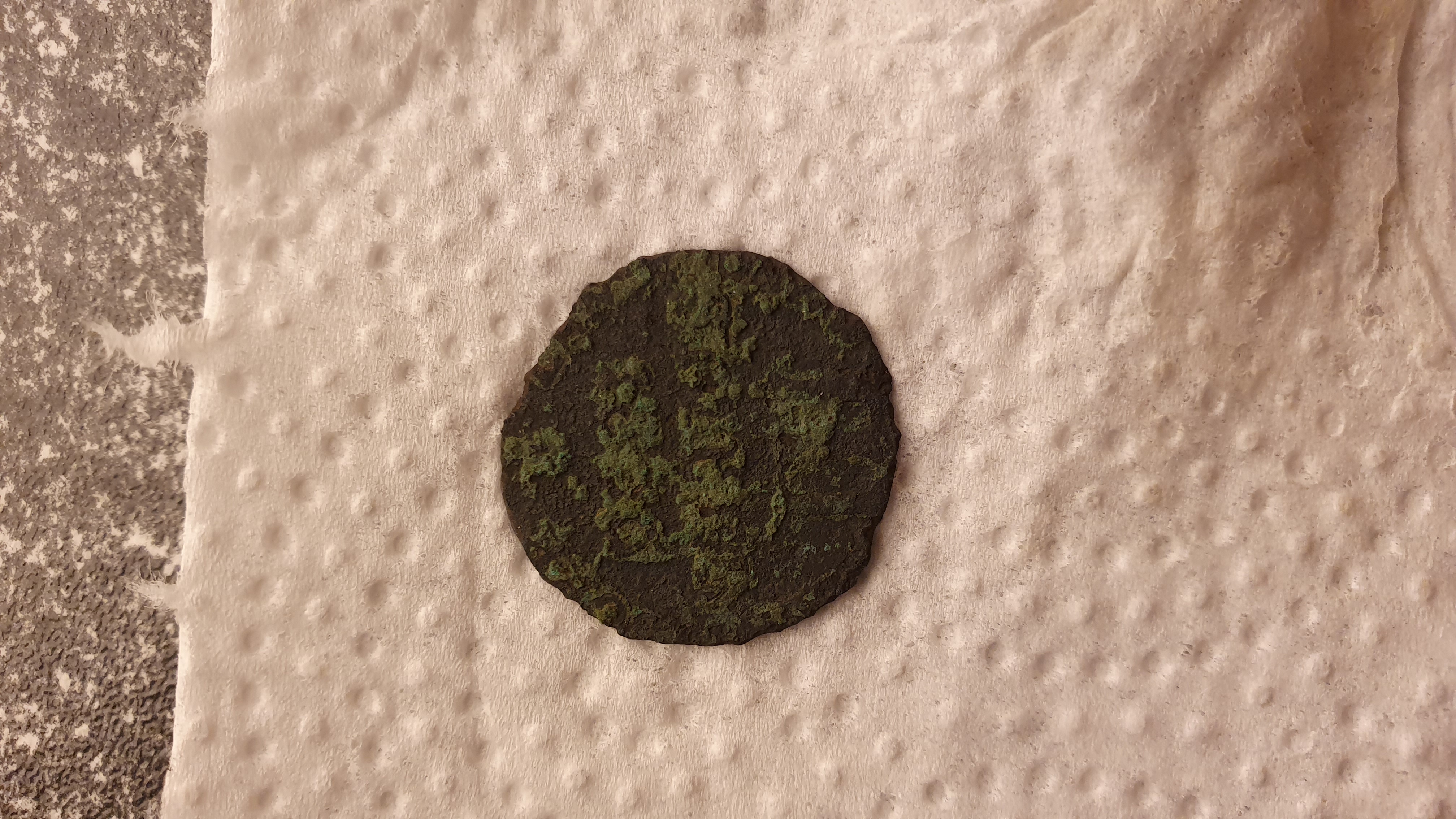 Könnte 1 oder 2 Pfennige um 1860 rum sein. Das aber nur anhand dem überlegt weil die Münze so dünn ist. Sehen kann man nichts mehr drauf. Ich würde Kupfermünzen nicht nass machen. Nur trocken abbürsten.