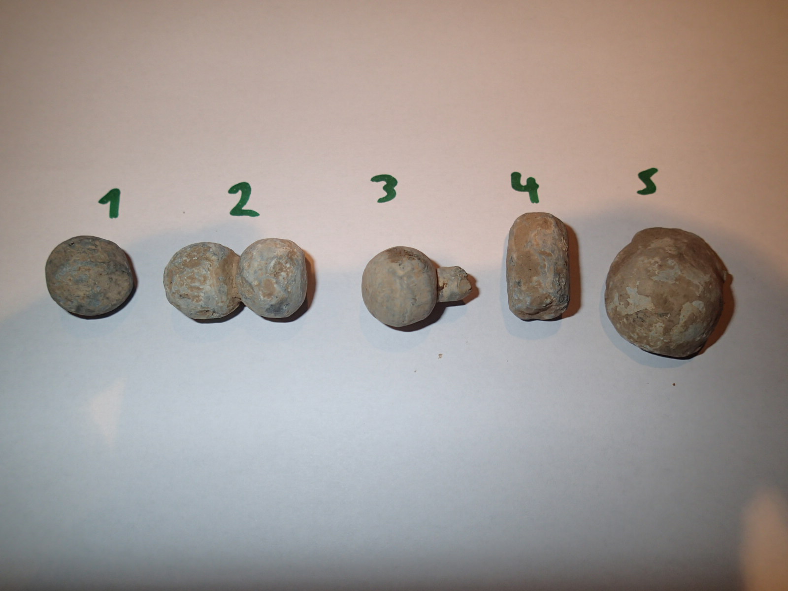 Nr. 3 ist eine Musketenkugel, bei der der Anguss nicht entfernt wurde -----) das passierte schon mal im Eifer des Gefechts