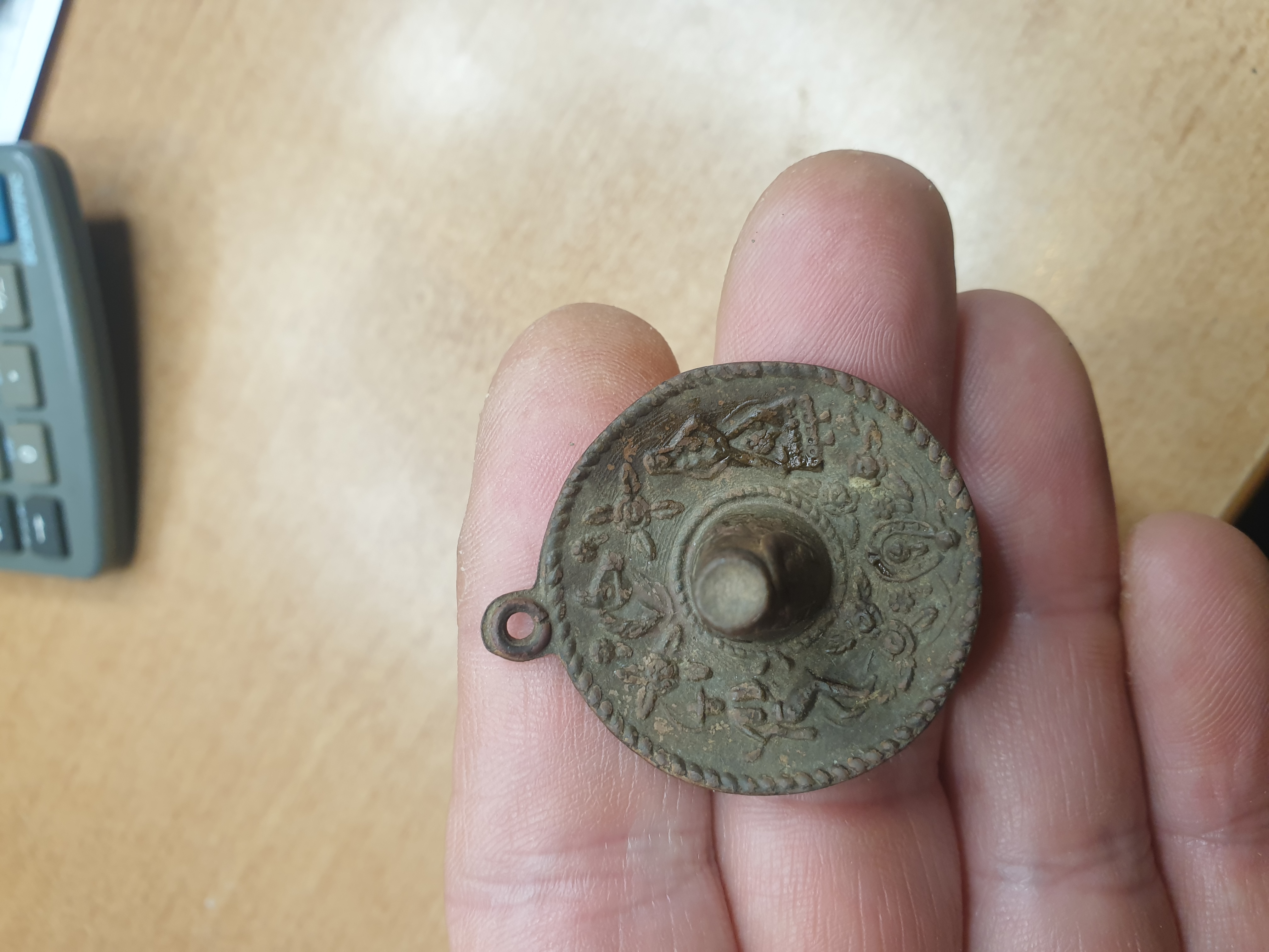 Habe dieses Teil heute beim umgraben gefunden, vielleicht kann mir einer helfen, was es sein könnte. Anfangs dachte ich es wäre eine Art Pfeiffenkopf, aber da wäre die Öse vöverkert. Es hat einen Durchmesser von 3 cm, und hat echt schöne Verzierungen. DANKE VORAB FÜR EURE Hilfe