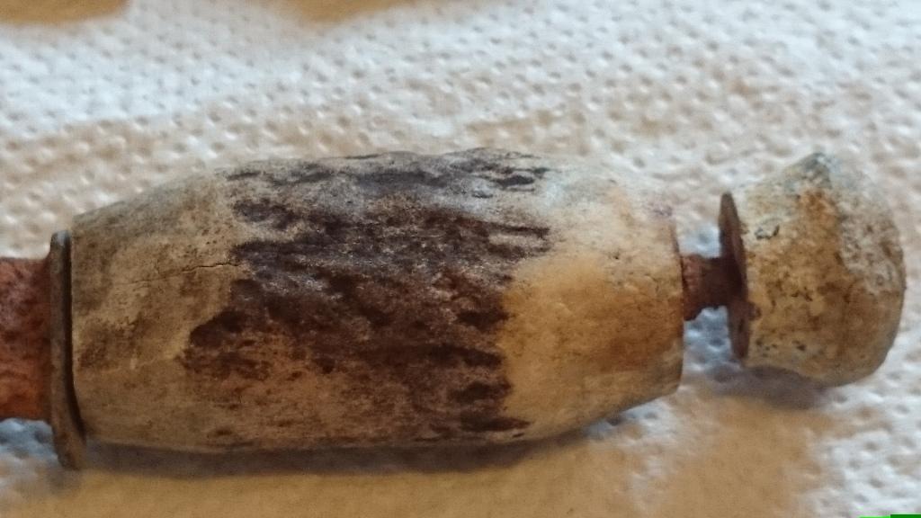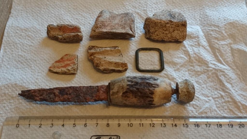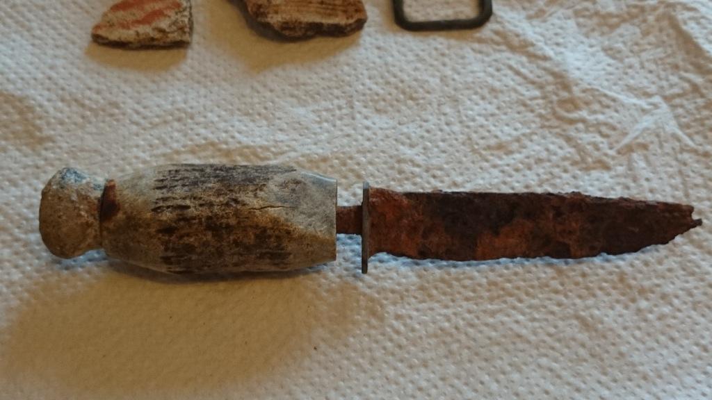 Es kam dieser kleine Hirschfänger mit Hirschhorn zum Vorschein, ne Schnalle und Keramikfragmente.