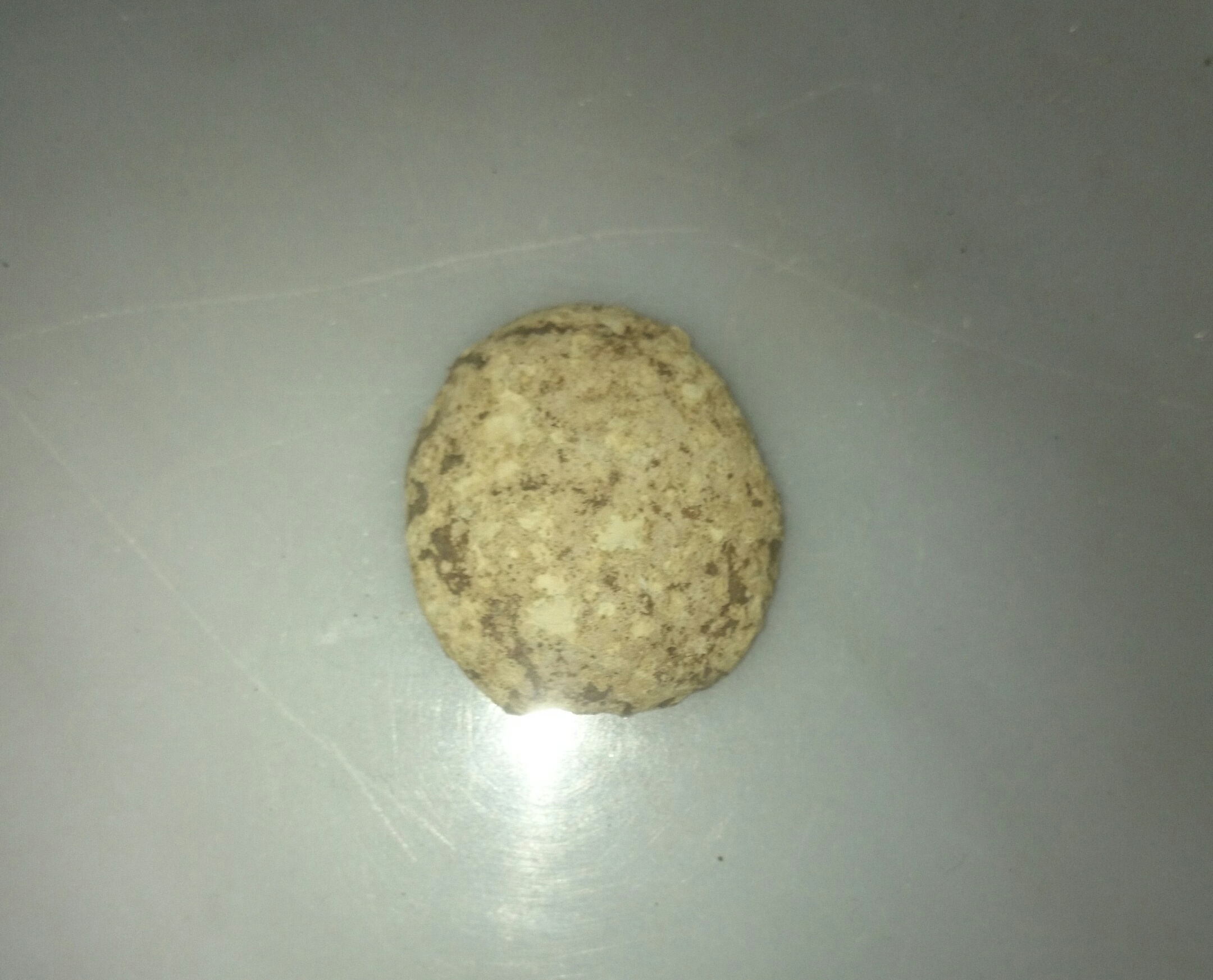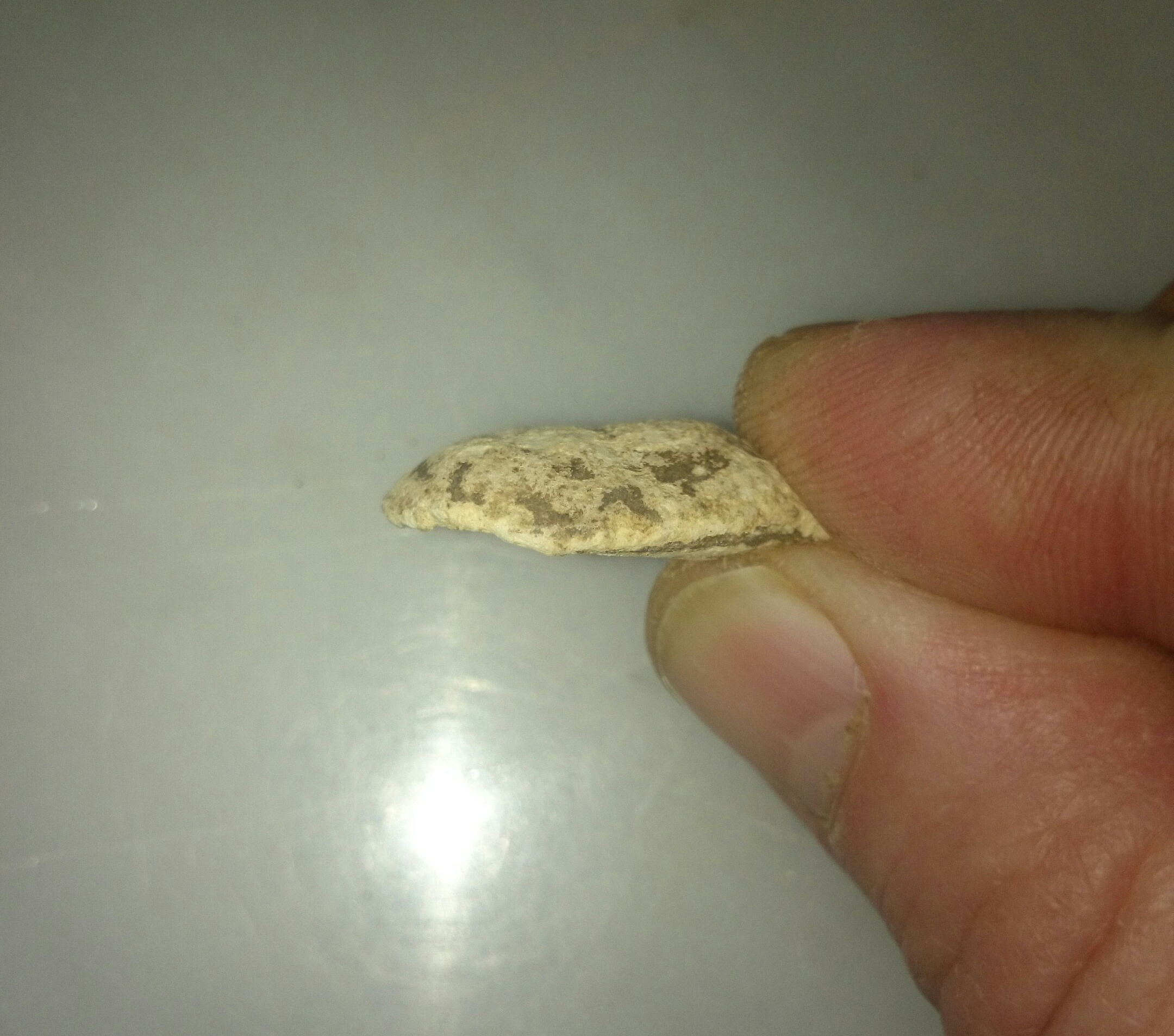 Die Rückseite ist im Zentrum leicht eingedellt. (Eventuell vom Abkühlen des flüssigen Bleies in der Gussform.) Der Gegenstand wiegt 69g.