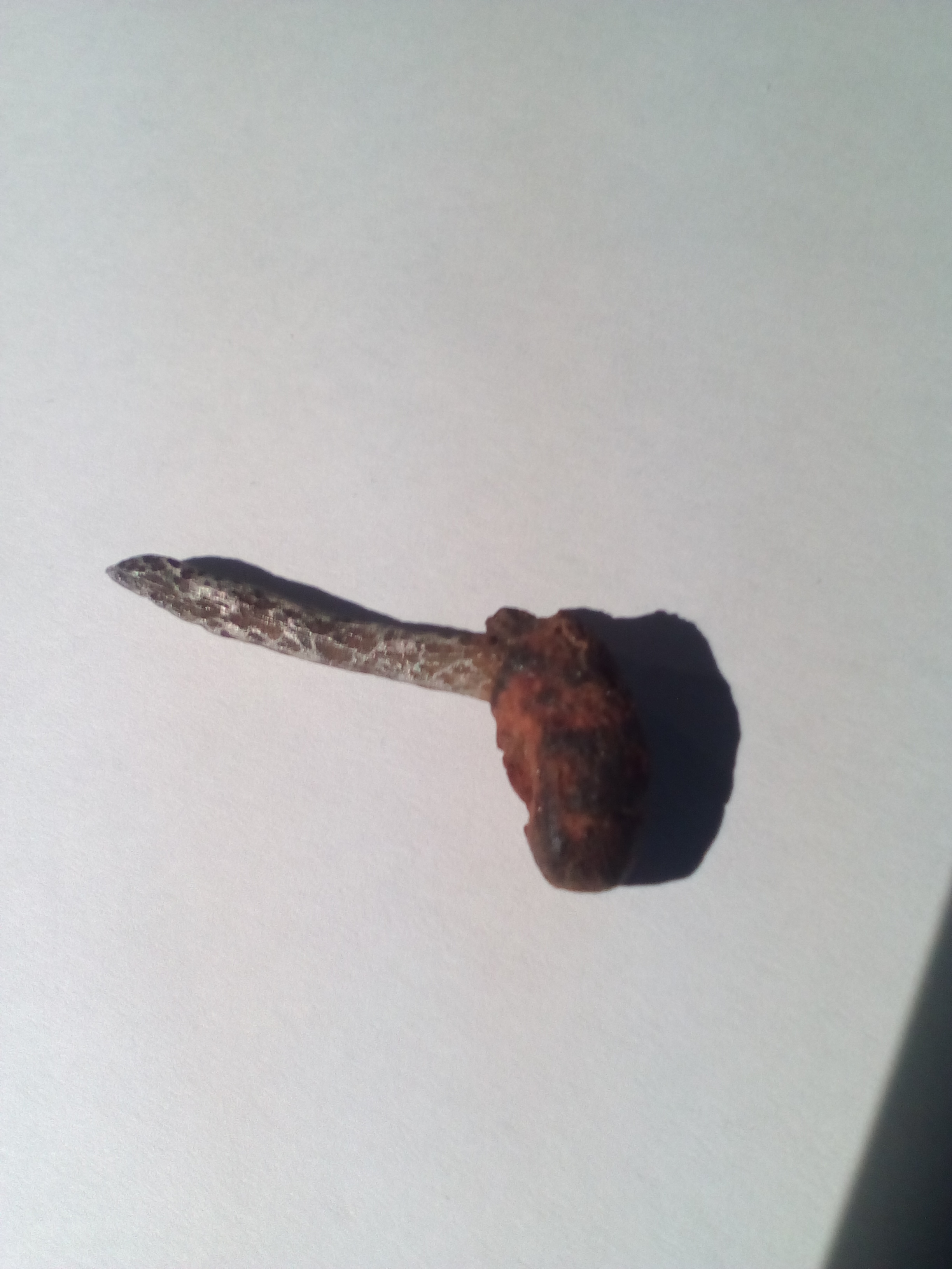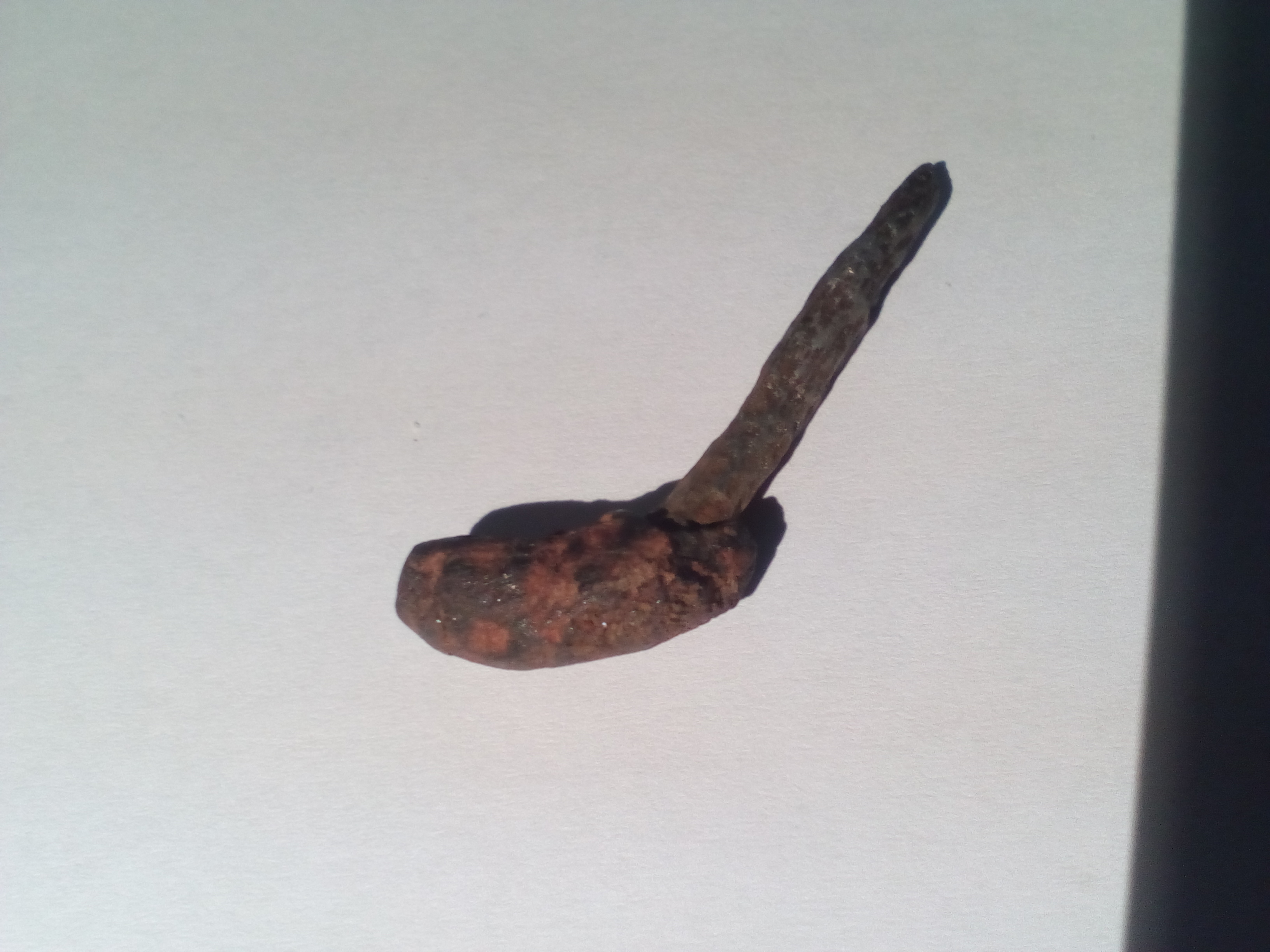 Das Fundstück ist wie gesagt 30 cm tief im Boden gelegen, dort unten war schon gelber Sand, vorher sehr viele Wurzeln. Es muss also schon sehr lange dort gelegen haben. Der Stift ist merkwürdig in seiner Oberfläche, wie Hammerschlag, er ist auch leicht magnetisch, aber nicht verrostet, der Schmutz lies sich mit dem Fingernagel abkratzen, am Ende sehr spitz, nicht biegbar. Die "Bohne" am Ende ist nicht magnetisch aber verkrustet. Bin mir nicht sicher, ob das alles Verkrustung ist oder ob das zu dem Gesamtkunstwerk gehört.