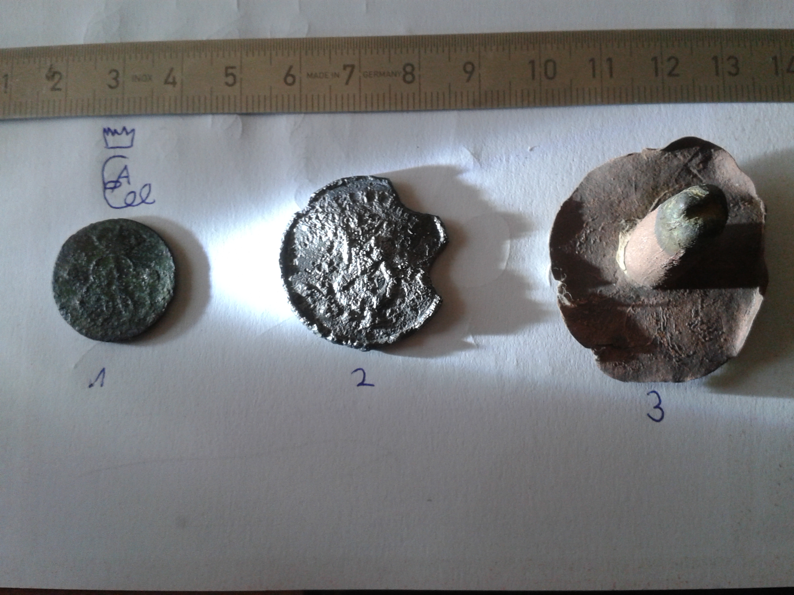 Zu 1-eine Münze aus Kupfer mit einen A welches mit einen E umrandet ist mit einer Krone oben drauf.Leider ist die Rückseite blank