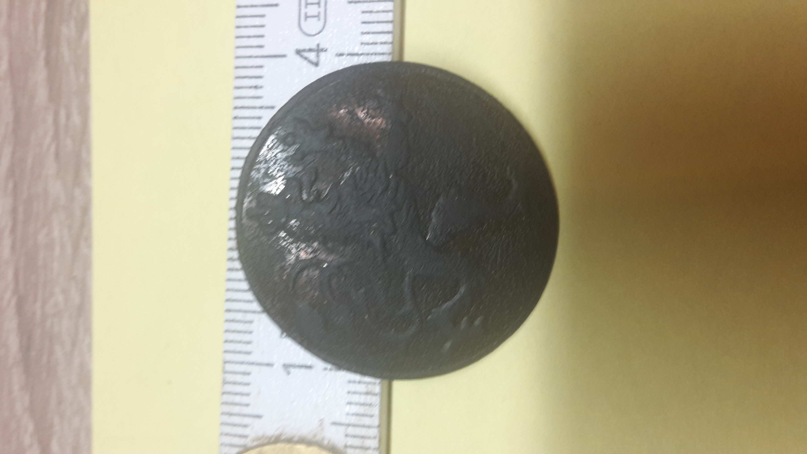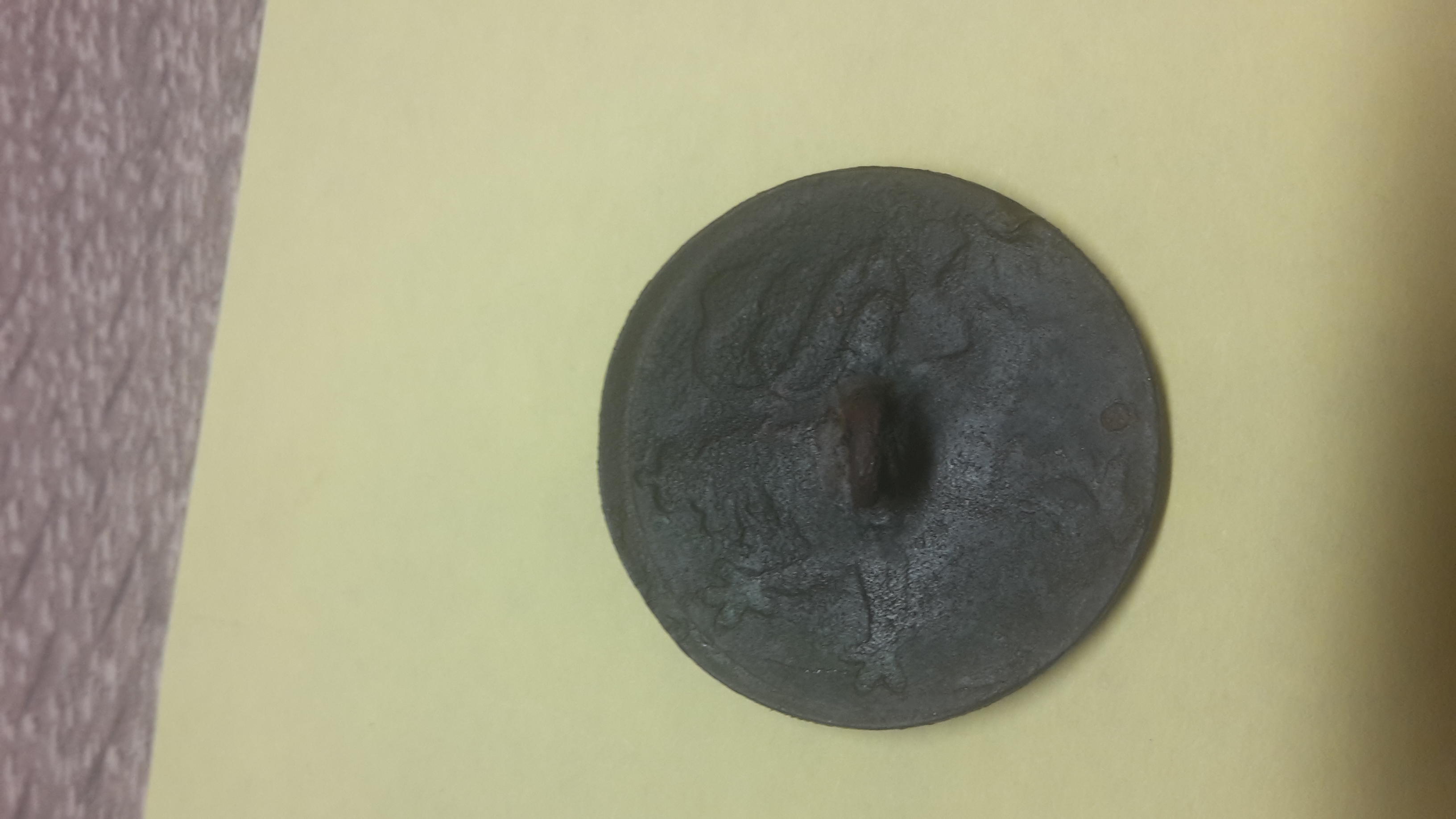 Der Knopf schimmert auf der Vorderseite Bronze Farben, wie eine Legierung wo mal drauf war.