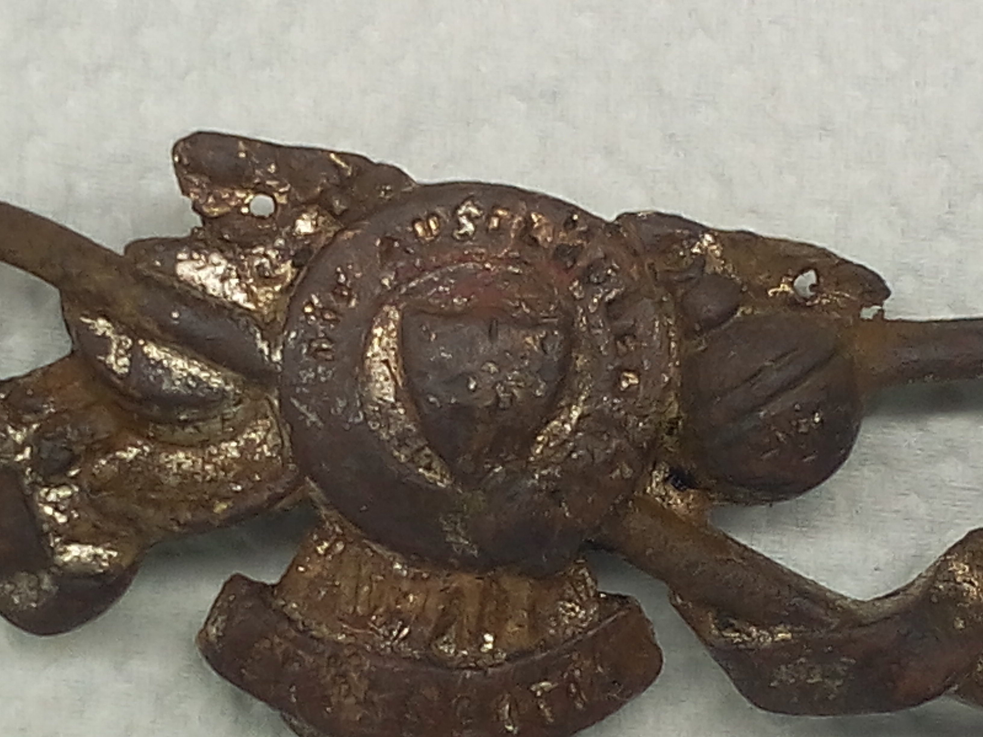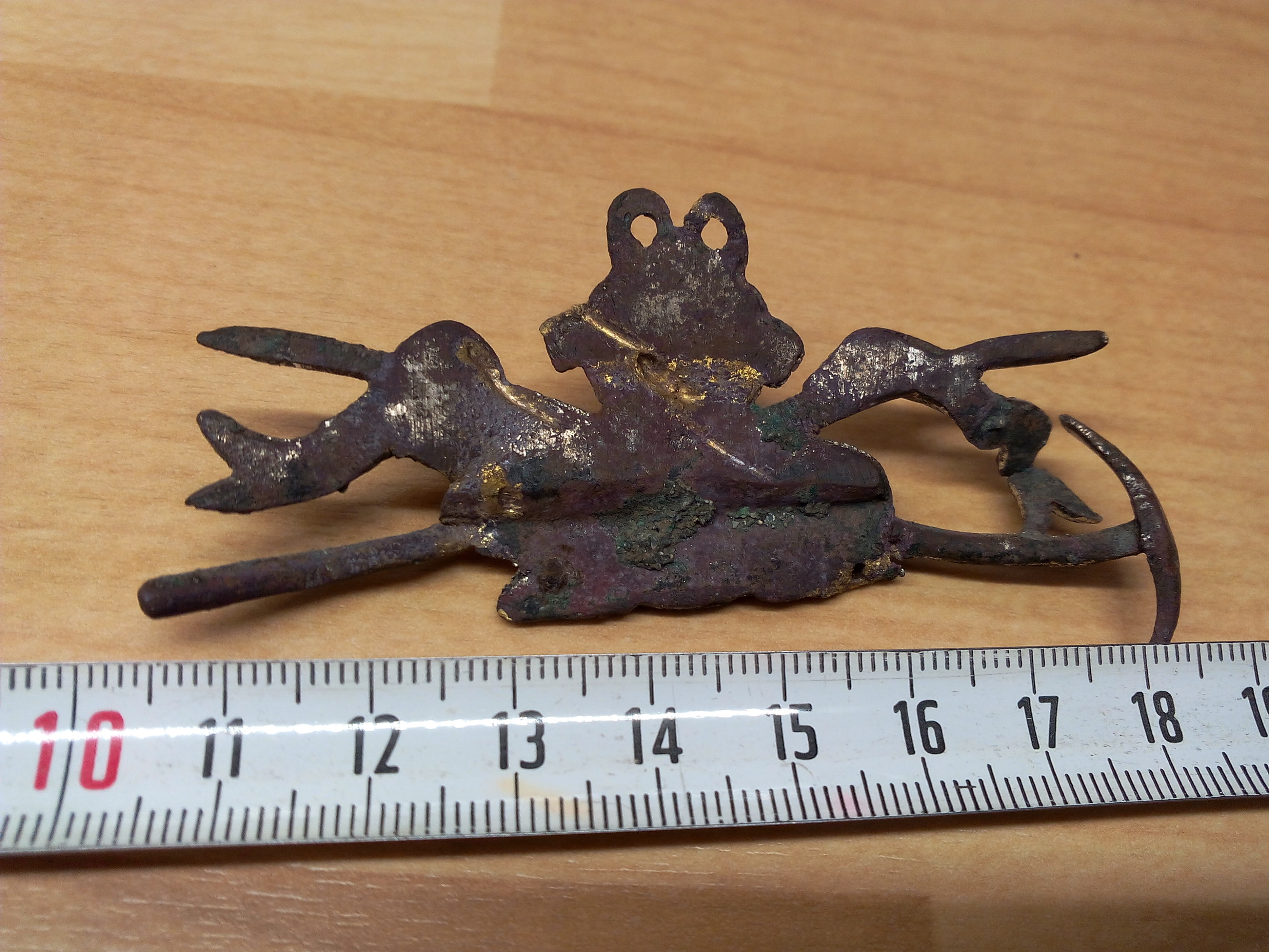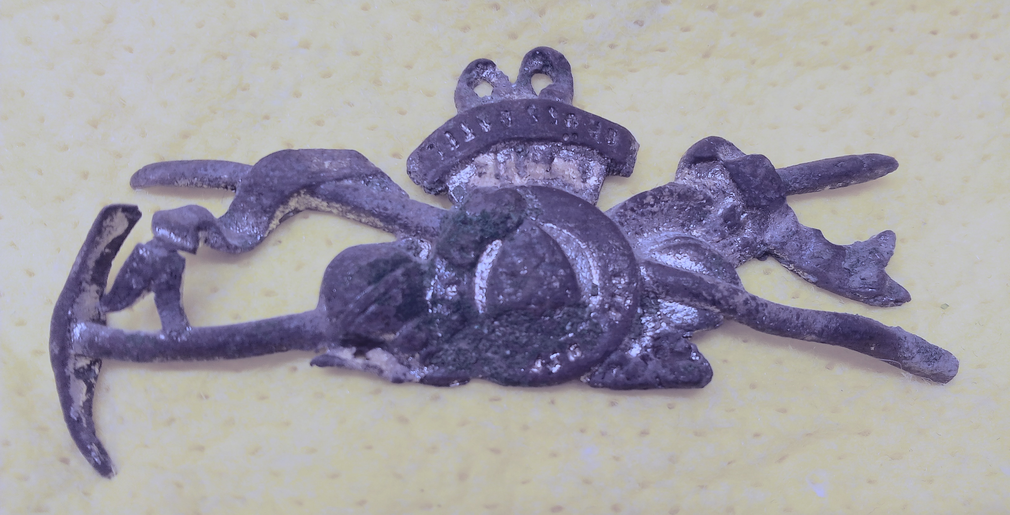 Dieses Abzeichen habe ich an einem angrenzenden Bundesheergelände gefunden. Dachte deswegen zuerst an ein altes Bundesheerabzeichen - Gebirgsjäger oder so. Aber ein selbst ein alter Bundesheeroffizier a.D. konnte mir nicht weiterhelfen. Mit der Spitzhacke und könnte auch auf der anderen Seite eine Schaufel dargestellt gewesen sein, wobei von der Schaufel nur mehr der Stiel vorhanden sein könnte. Dann würde es eher für ein Bergarbeiterabzeichen sprechen. Oben in der Mitte sind zwei Löcher oder Aufhänger. Darunter und im kreisförmigen Emblem befindet sich ein Schriftzug, der sich leider nicht entziffern lässt. Das Teil dürfte aus Messing sein (von der Schwere und Klang her) und war zumindest teilweise goldfarben. Würde dieses Abzeichen professionell reinigen lassen, um wenigstens die Schrift zu entziffern. Wer macht so etwas?