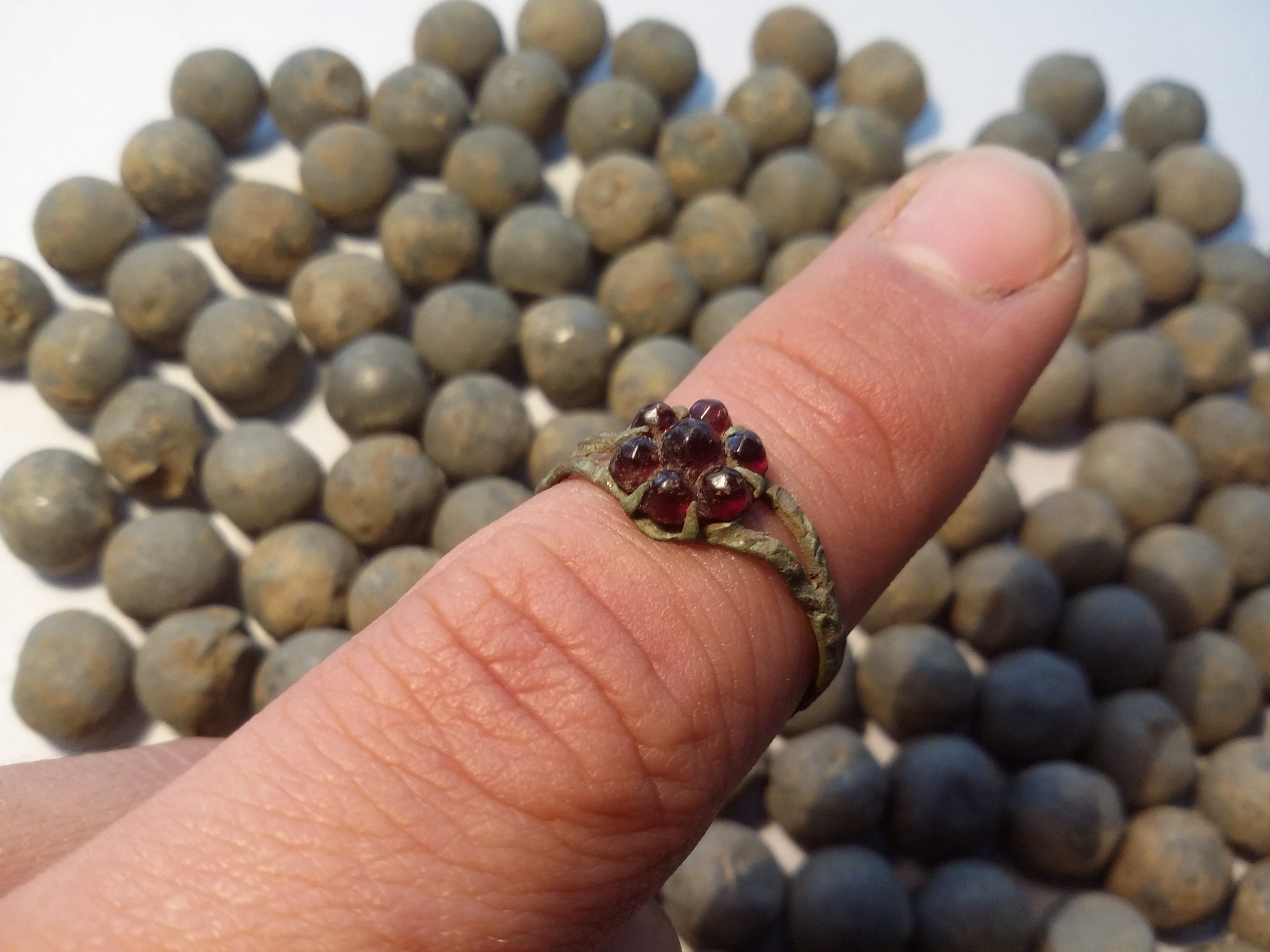 Weiß jemand vielleicht diesen Bronzering zeitlich eeinzuschätzen?Und hat vielleicht irgendwer ne Idee warum auf dem Acker so viele Kugeln liegen? Hab schon an Schrapnellkugeln gedacht, da auf dem Acker auch noch solche Splitter lagen, die ich als Granatenteile eingestuft habe.Könnte das sein?