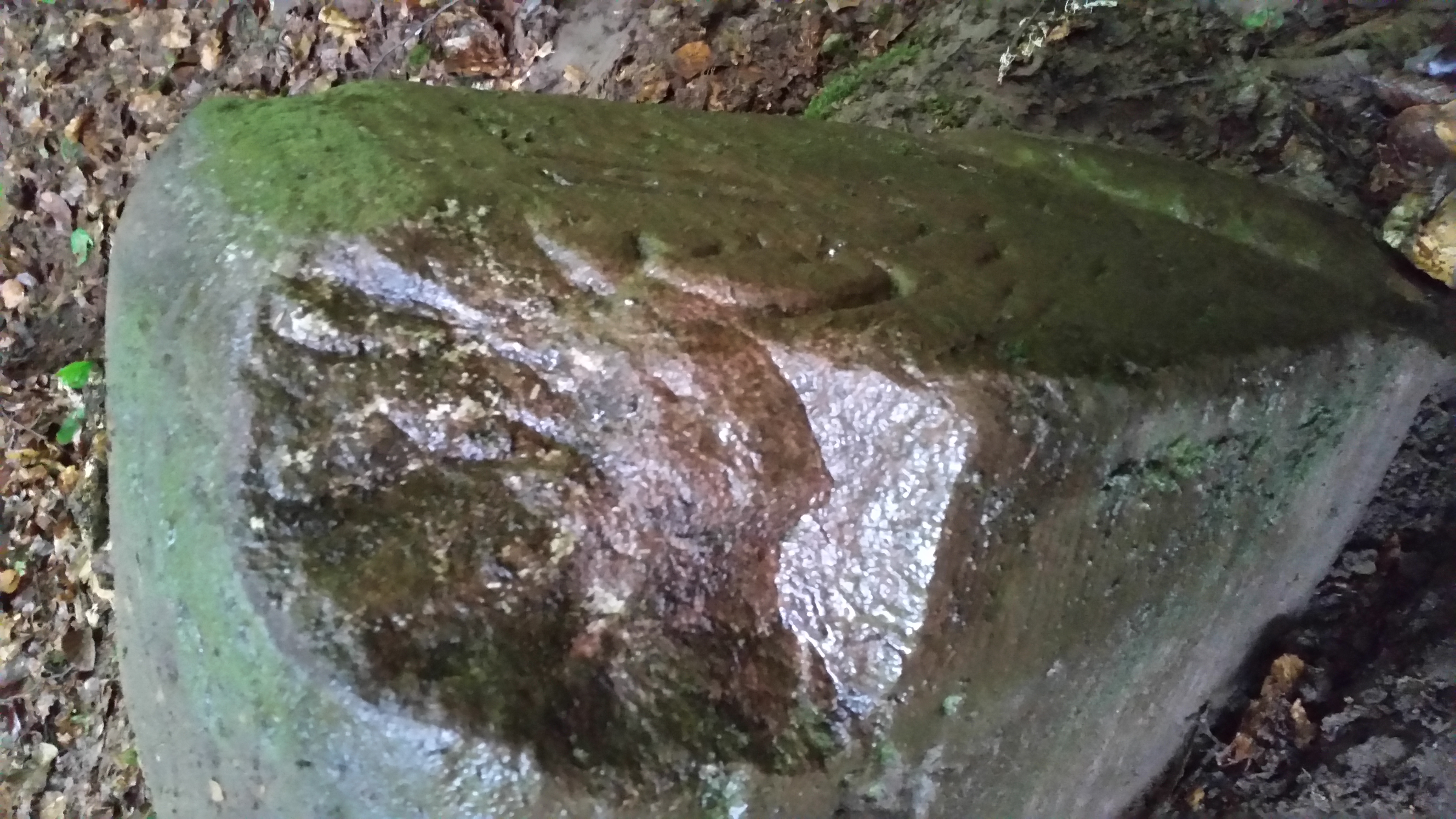 Steht oberhalb eines kleinen Bachlaufes und war mit Moos überzogen. Nachdem wir das Moos entfernt hatten kam dies zum Vorschein.