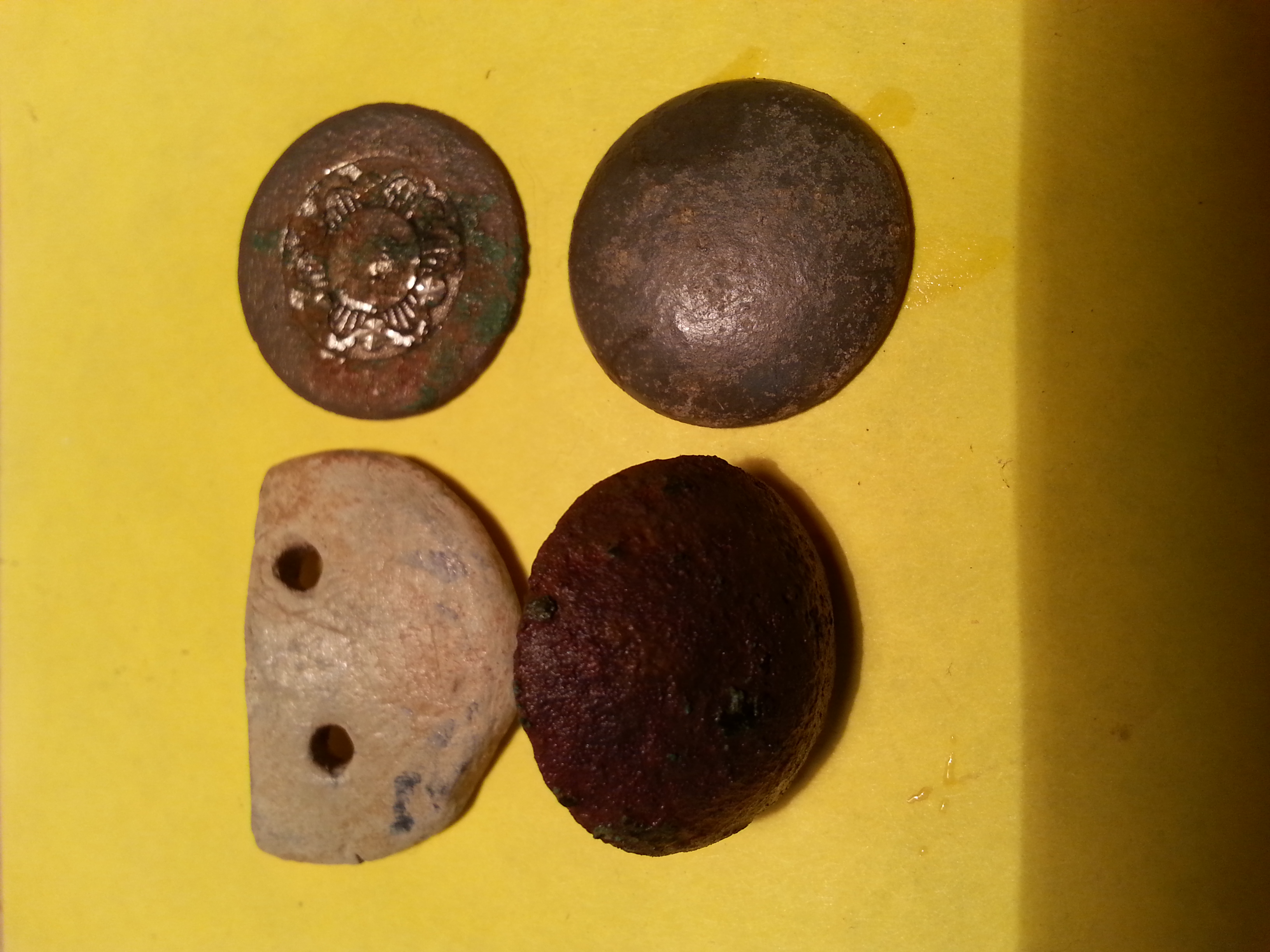 kann jemand sagen ob der linke untere "Knopf" ein Knopf sein könnte. Er ist sehr schwer und scheint aus Blei zu sein. Wenn ja wie alt könnte er sein. Der Knopf mit der Blume hatte wohl eine silberne Verzierung.