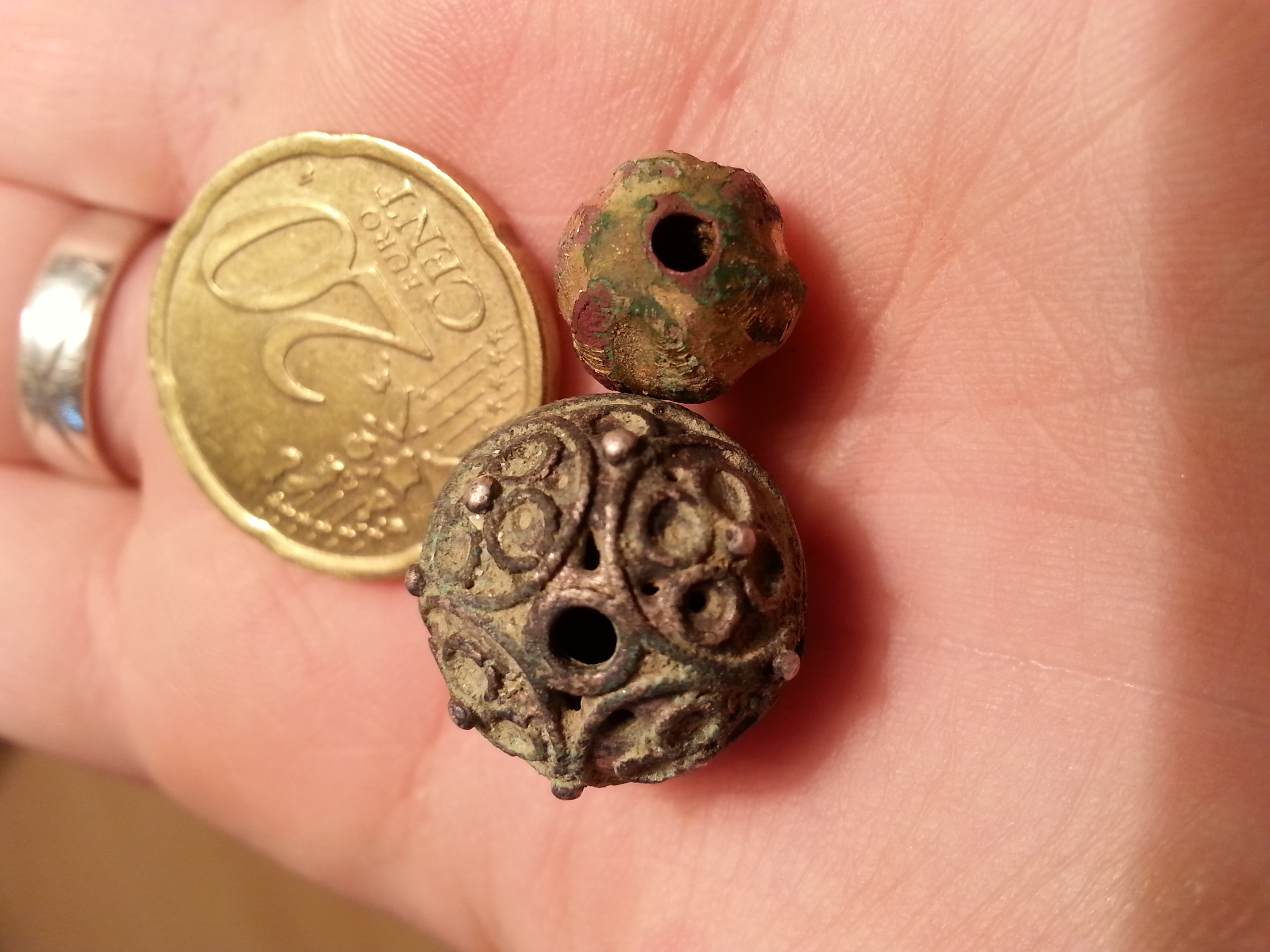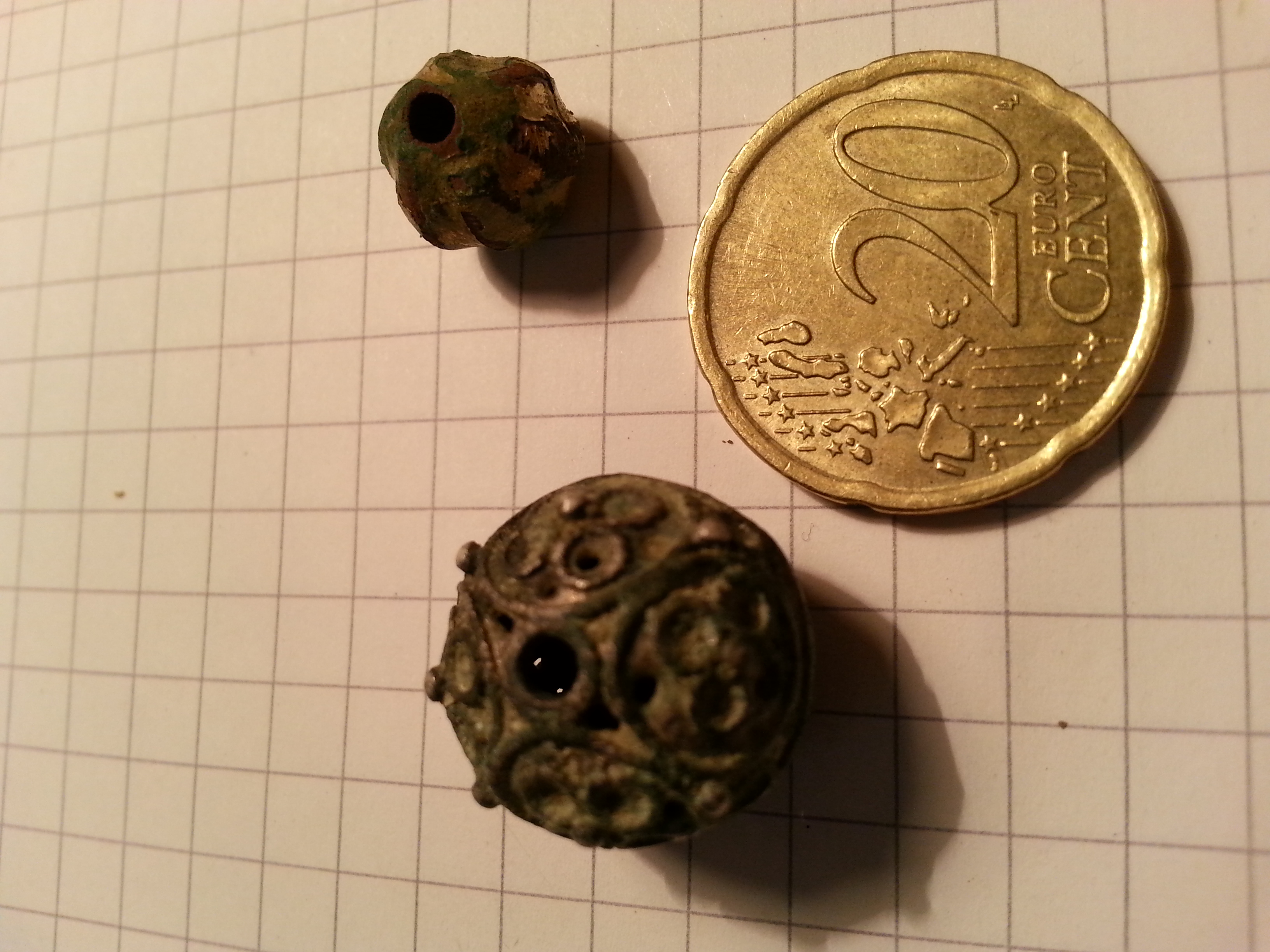 heute waren auch diese beiden Kugeln/Perlen dabei. Sie sind sehr leicht. Beide innen hohl und haben ein Loch auf beiden Seiten. Die größere schimmert Silber mit grüner Patina und hat relativ gradlinige Löcher. Die kleinere hat verschiedene Farben und schimmert golden. Sie hatte versetzte Löcher.