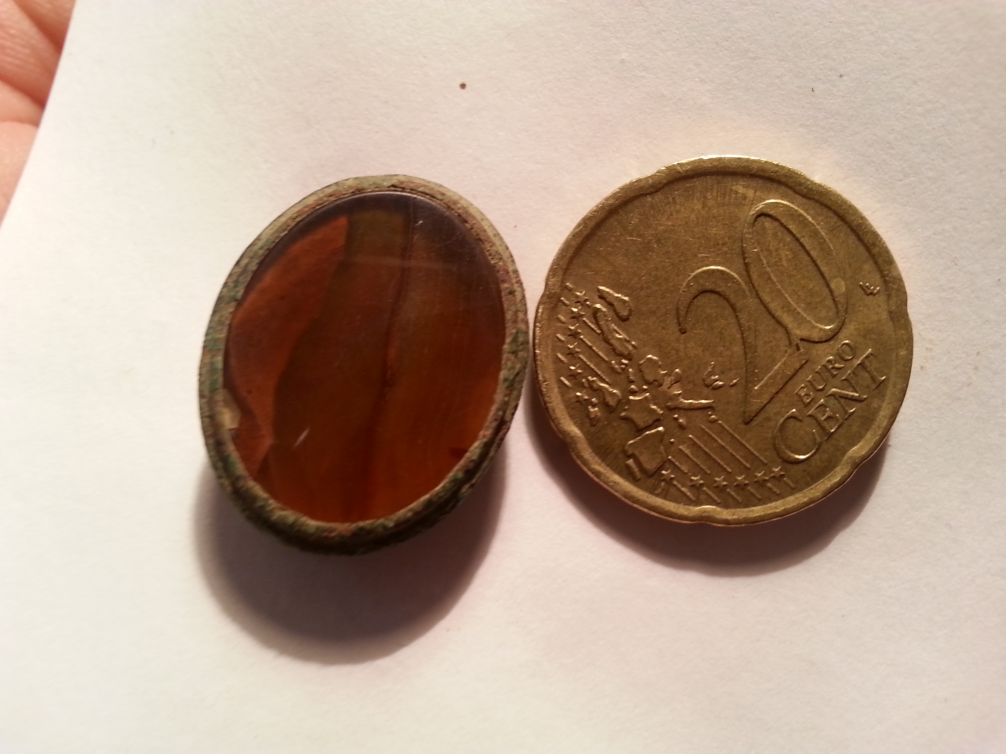 Das Schmuckstück scheint aus Kupfer zu sein und war wohl mal vergoldet. Ein Bernstein (?) ist eingefasst.