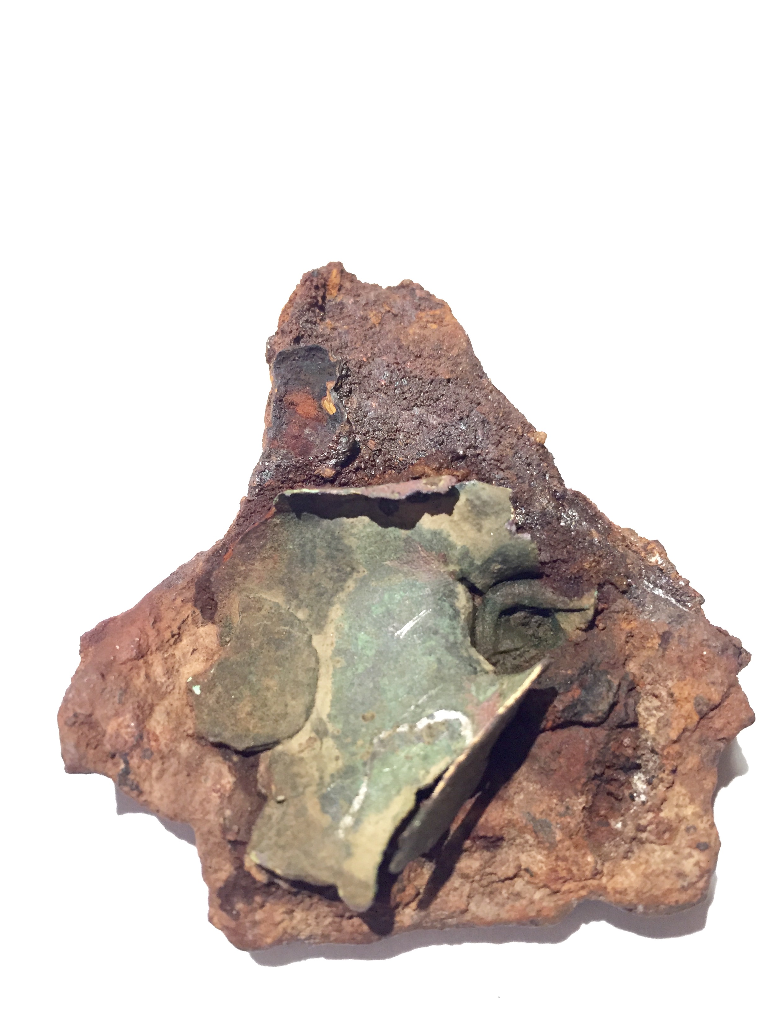 An der Vorderseite erkennt man 2 Nieten/Beschläge aus (Messing oder Kupfer ?)