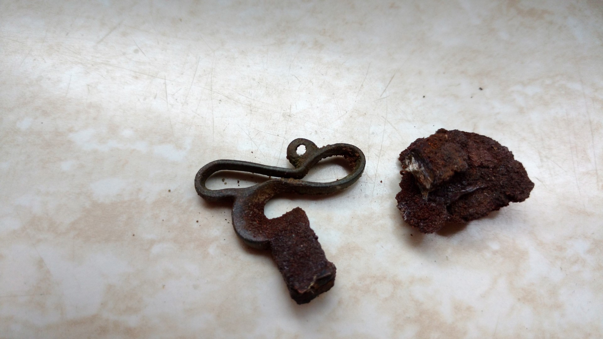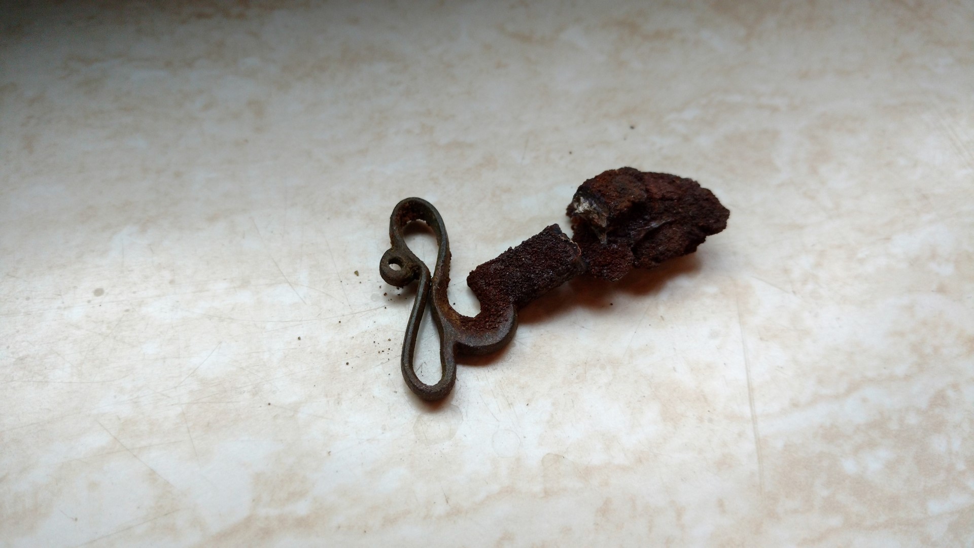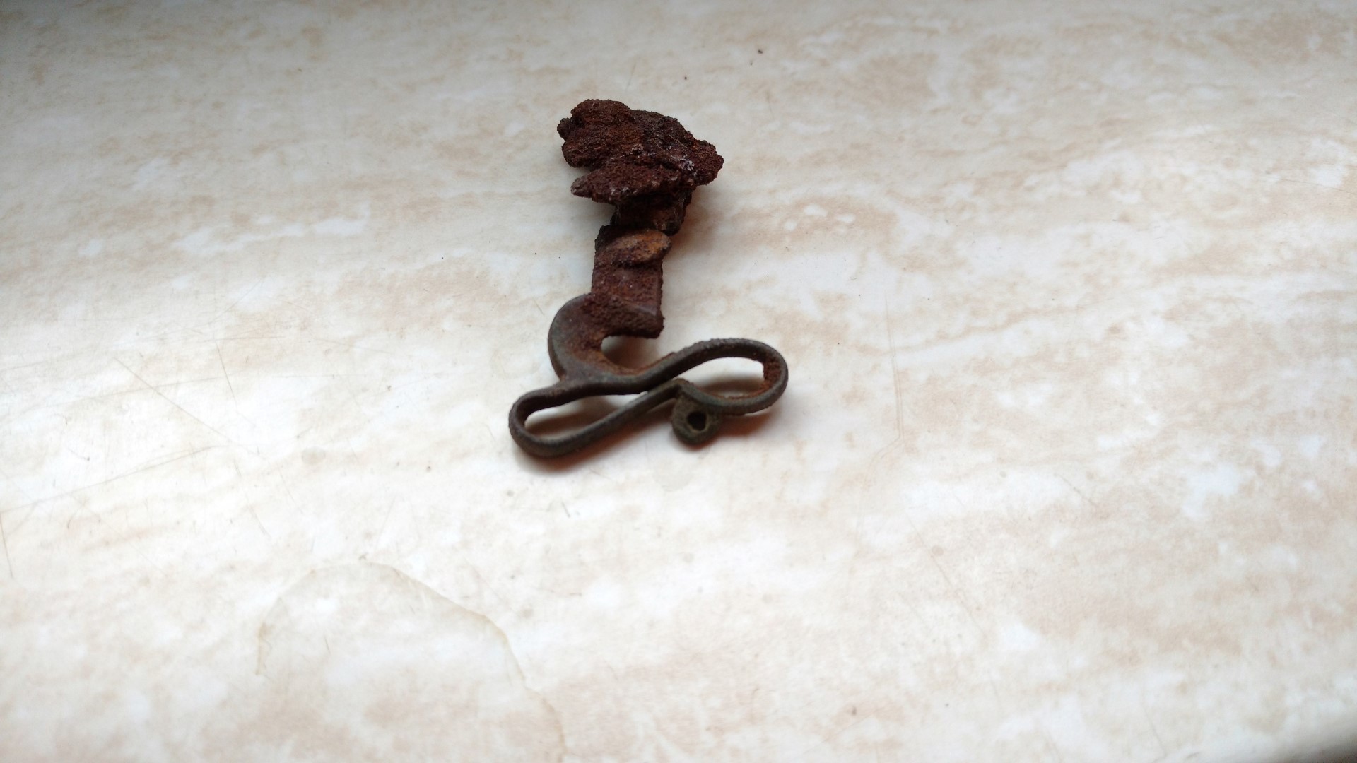 Bei dem 3. Fund bin ich absolut ratlos, es hat eine Art Öse, ist aus 2 verschiedenen Materialien, wobei das Eisen ziemlich angegriffen und bereits durchbrochen ist.