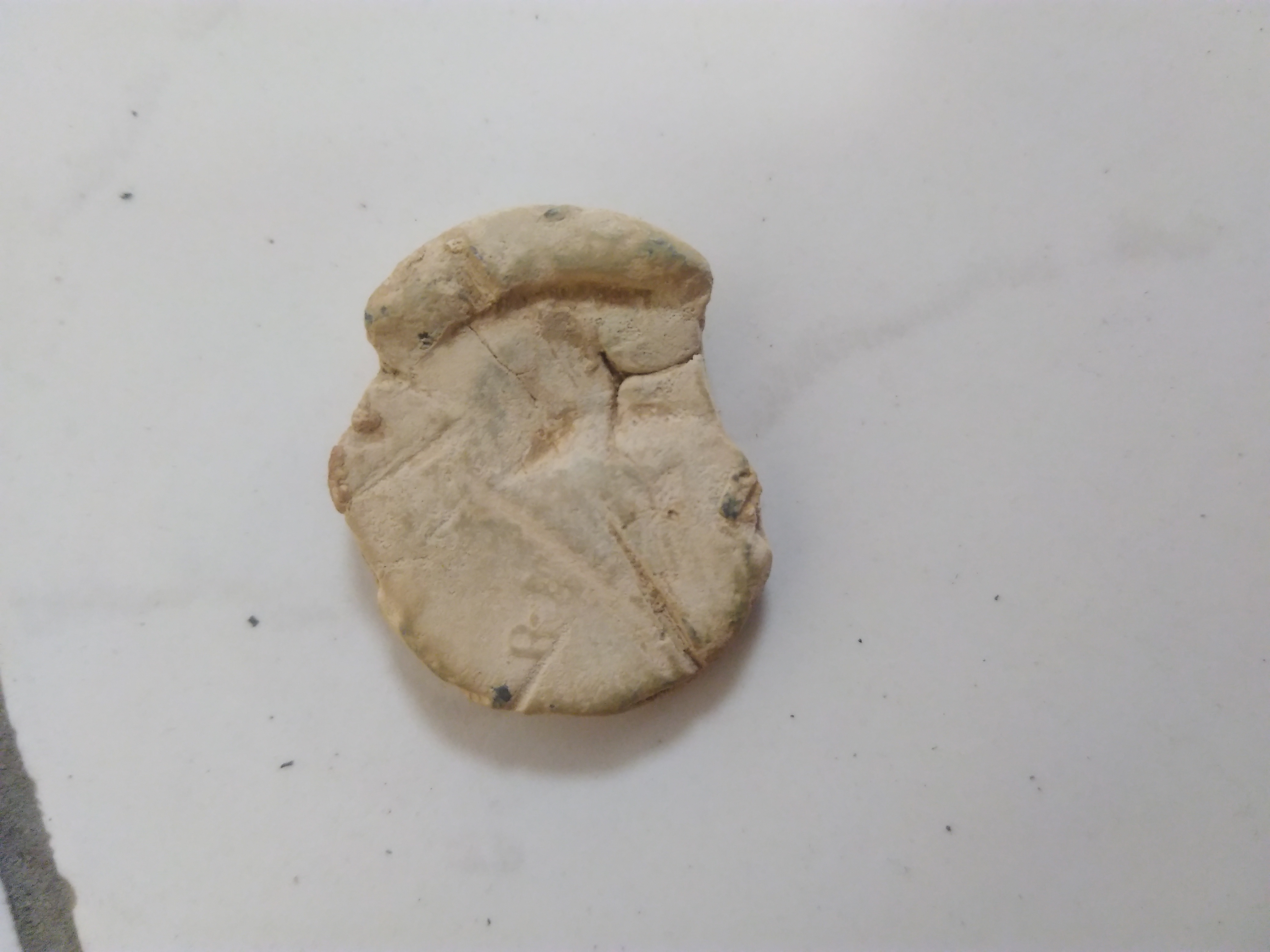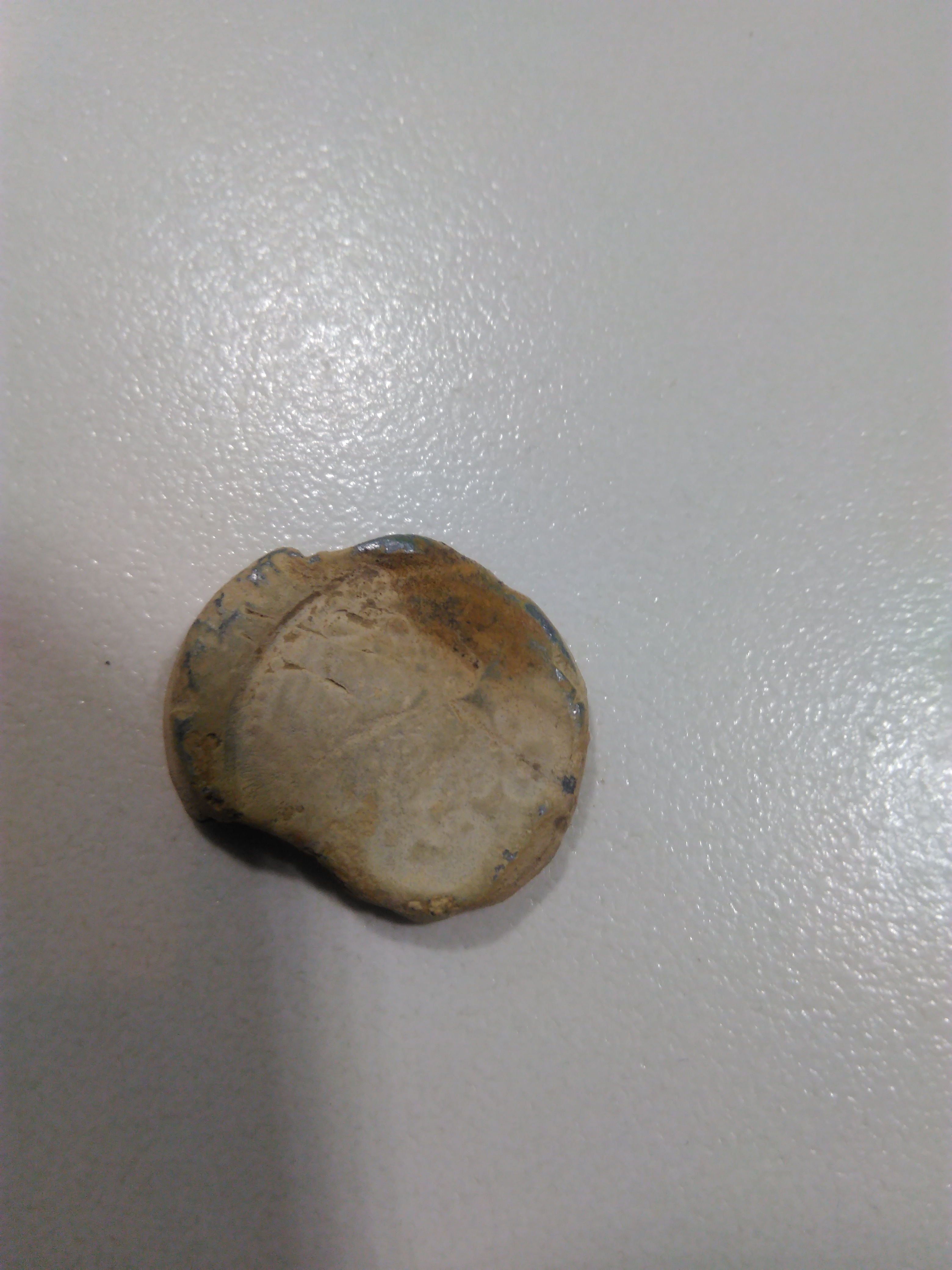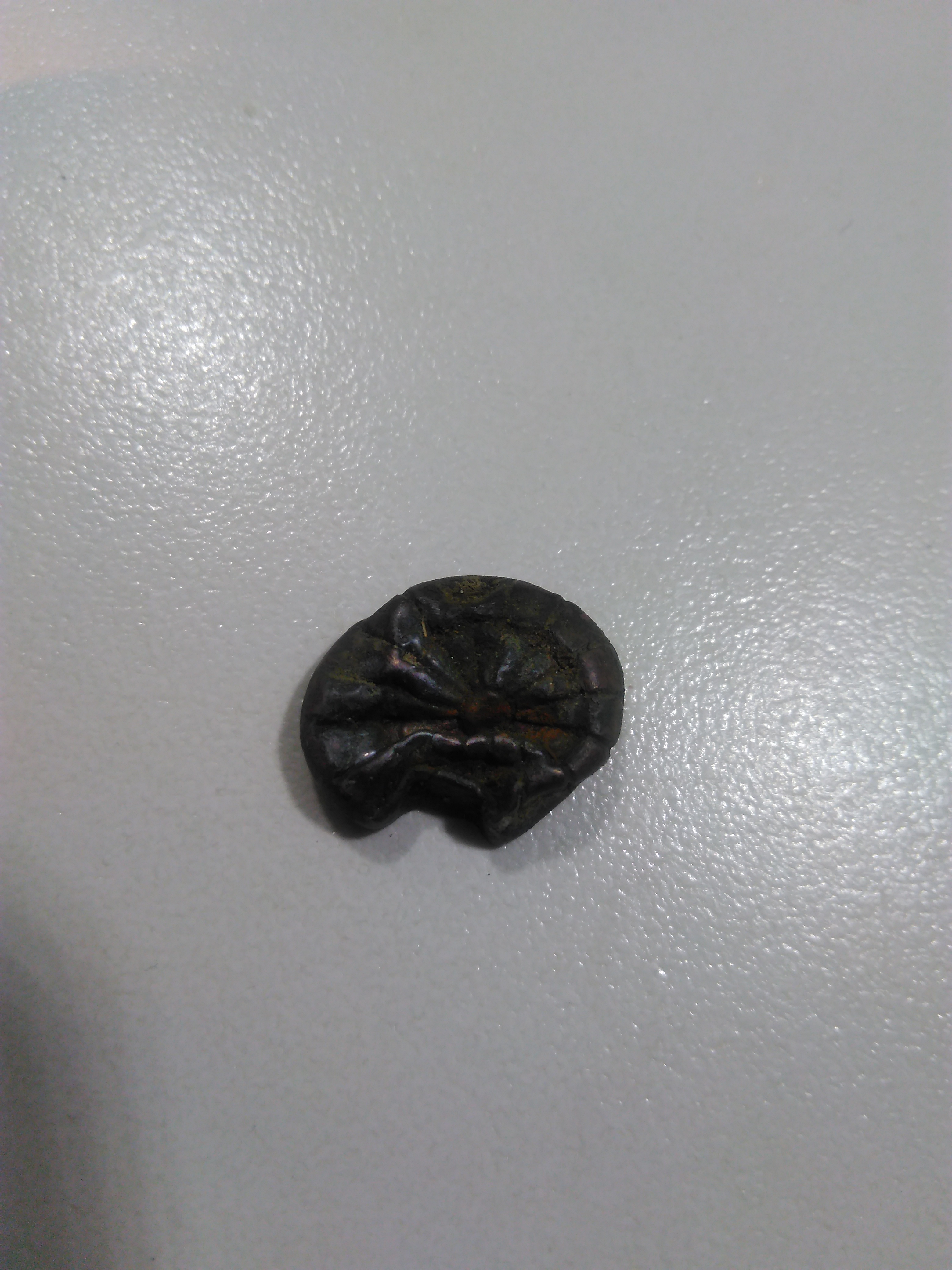 Auf der Blombe oder Münze steht etwas drauf, fängt mit R an und es sind auch irgendwelche Verzierungen zu erkennen.