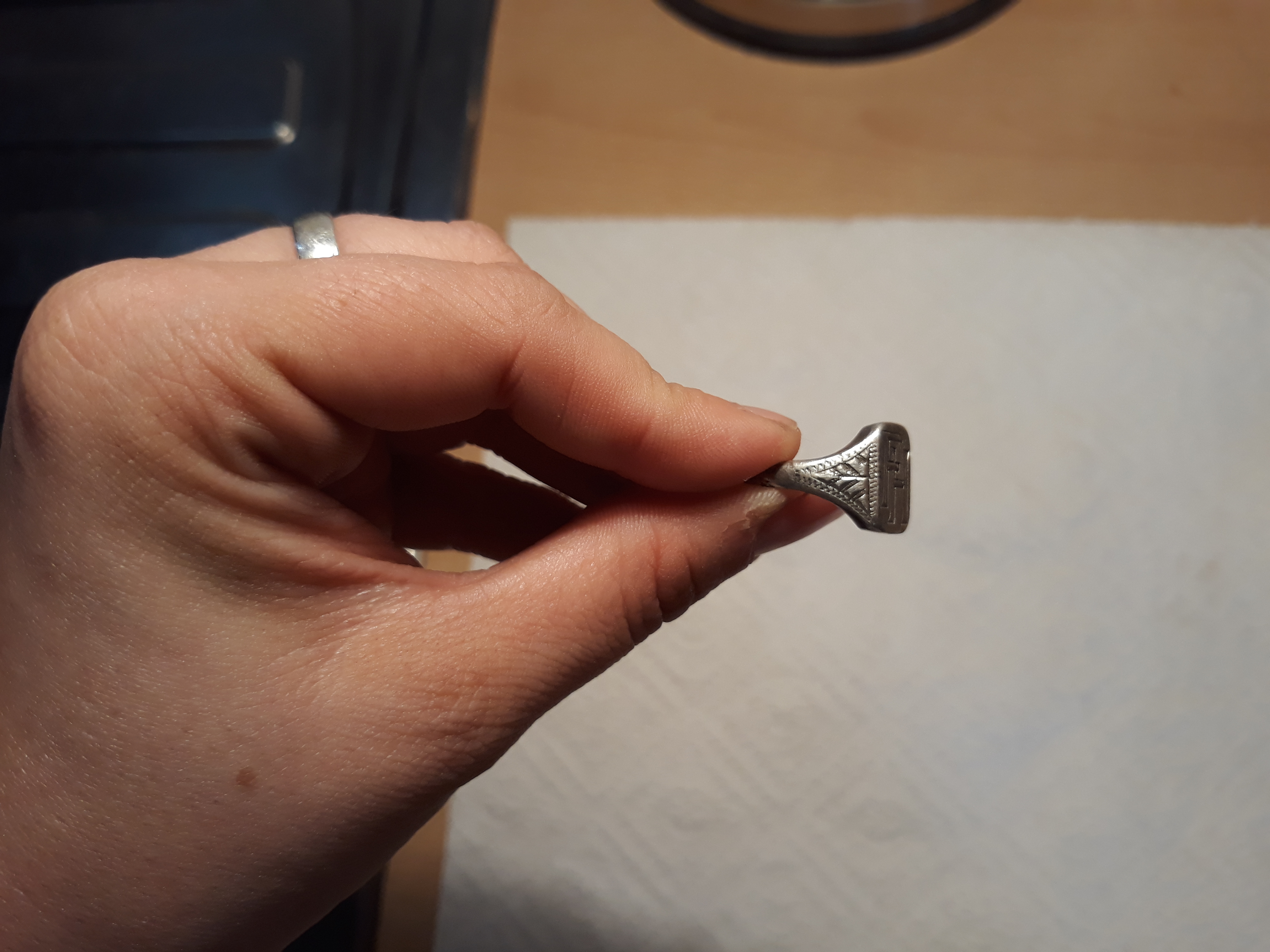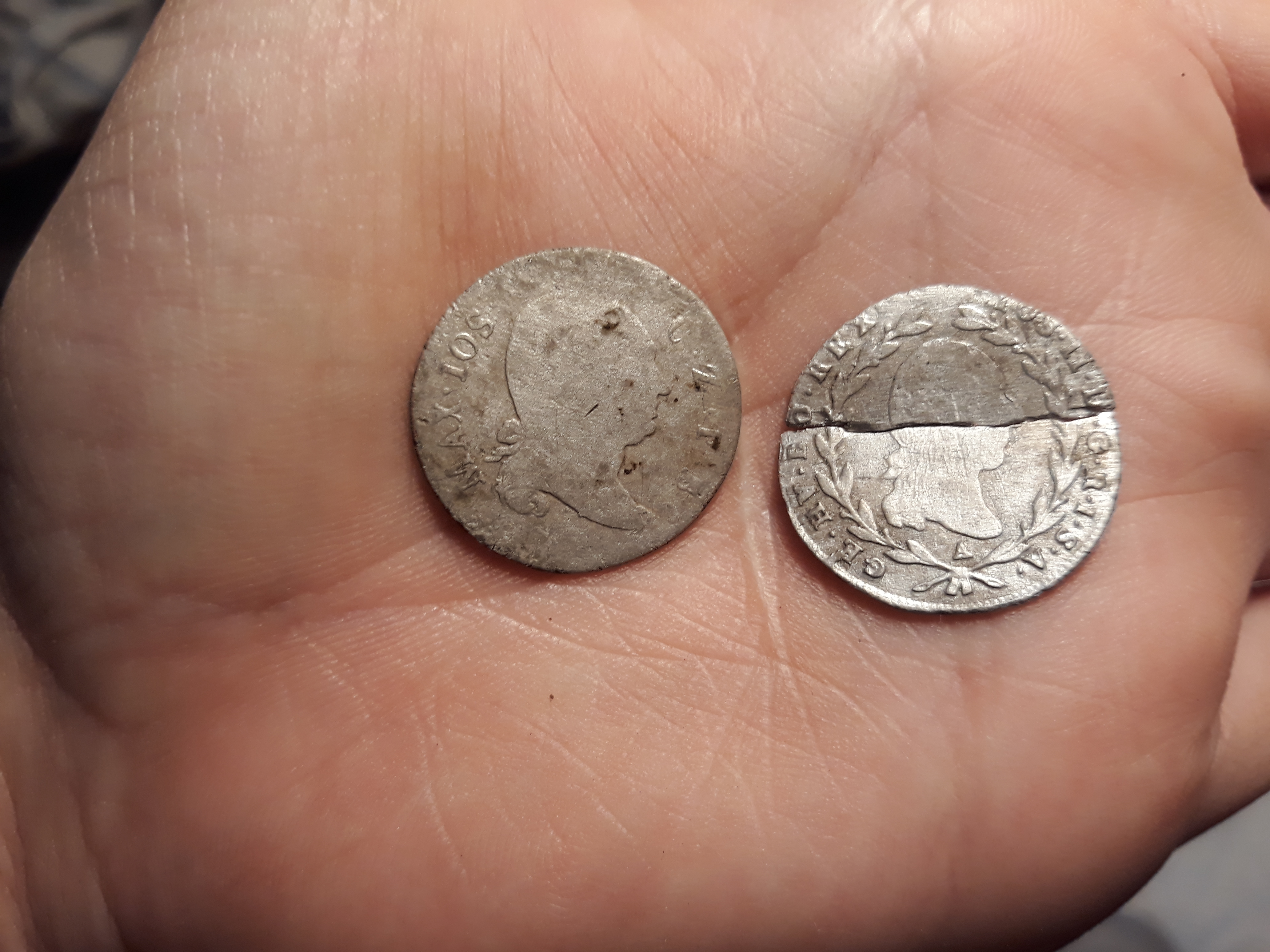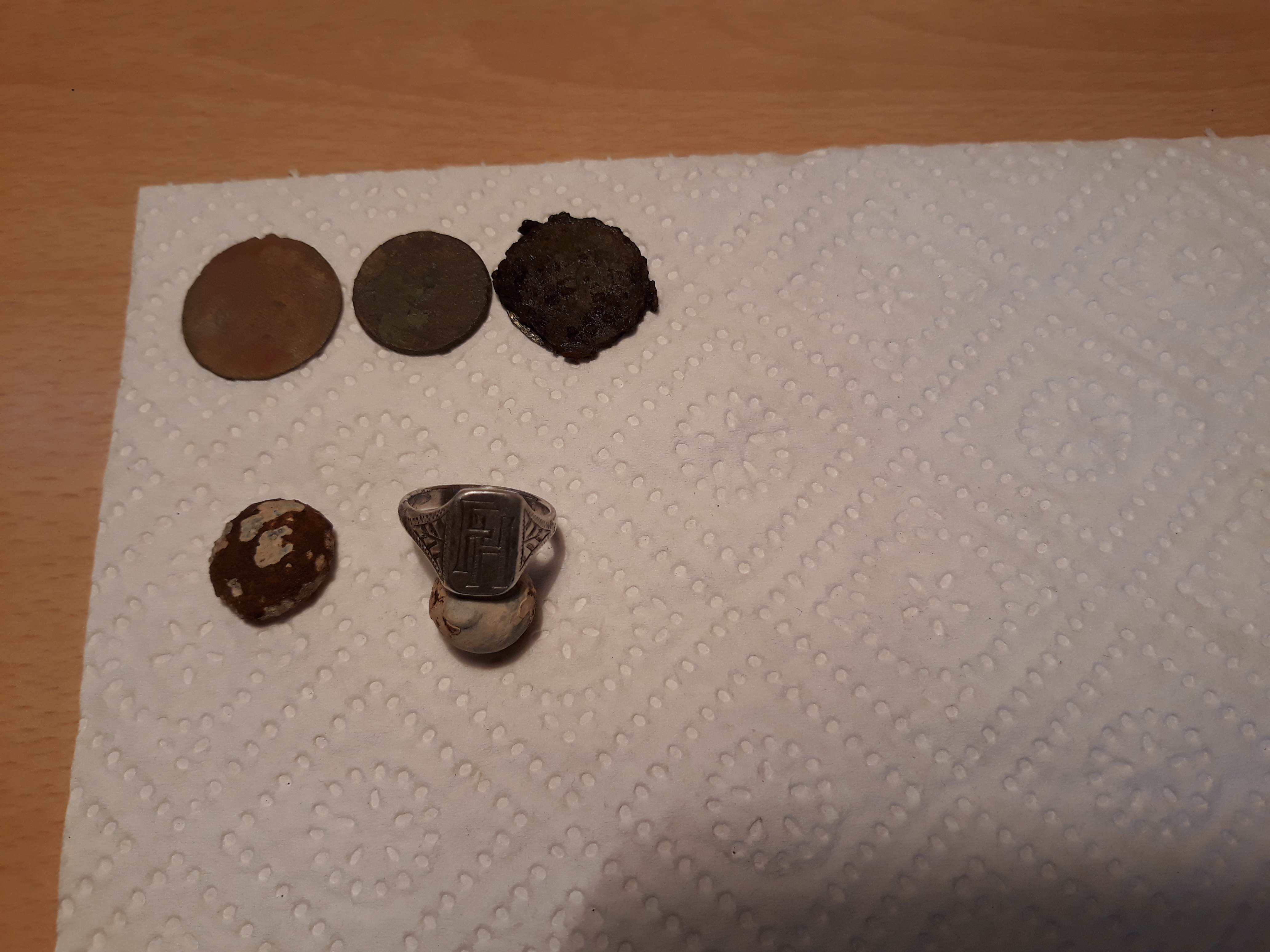 auf dem Berg der Siegelring aus Silber und ganz ganz tief im Wald plötzlich in einem Loch 3 Silbermünzen. Leider eine davon schon so dünn, dass sie bereits beim Bergen durch das Anfassen gebrochen ist, die zweite brach dann bei der Reinigung