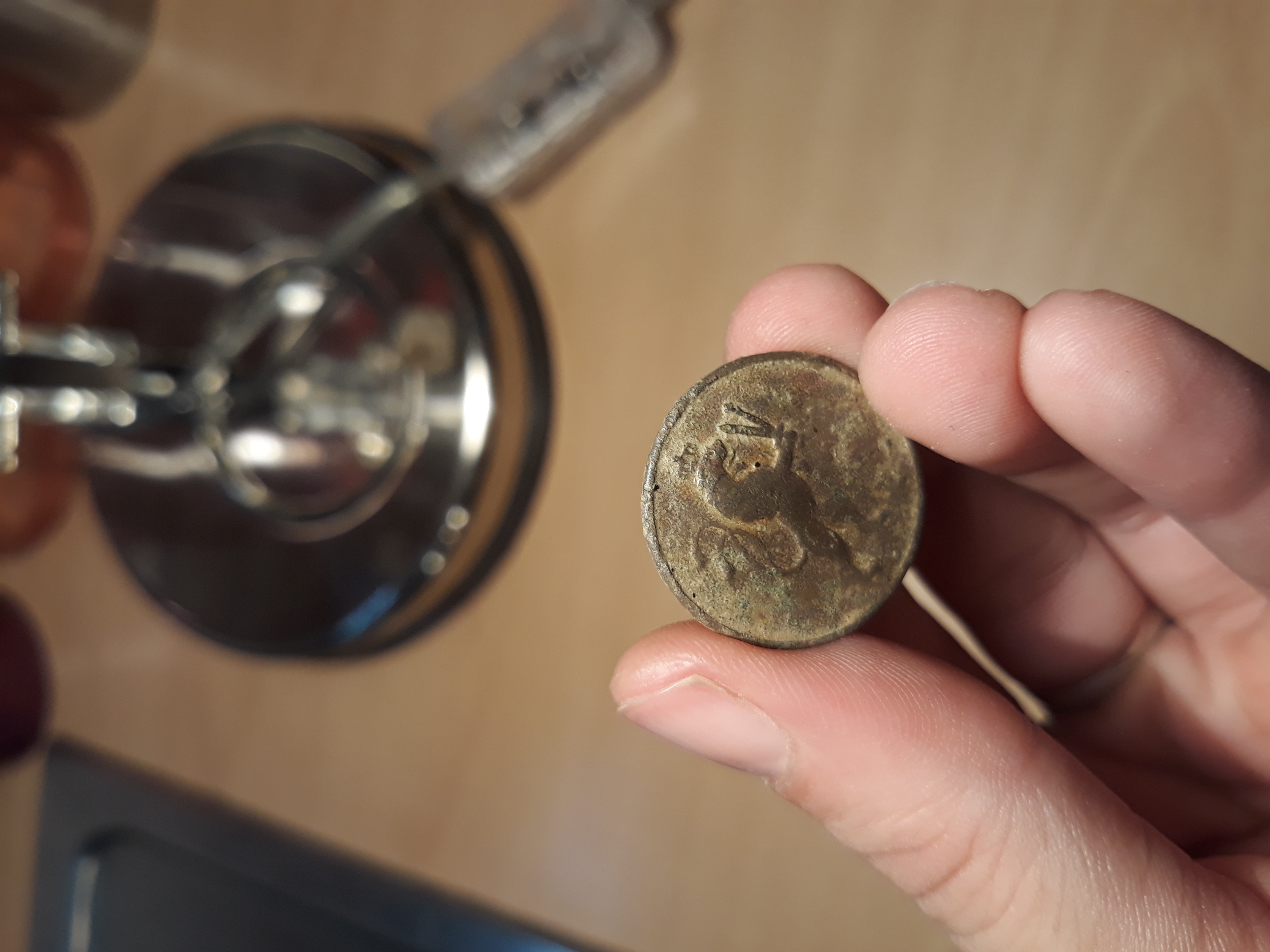 2. Knopf: aus Kupfer, eine Löwe mit Schwert und Zepter, Rückseite kann man zwar einzelne Buchstaben lesen, ergeben aber irgendwie keinen Sinn, eine Krone ist auch drauf hinten. Im Netz findet man nur bayrischer Beamtenknopf dazu, aber nix genaueres
