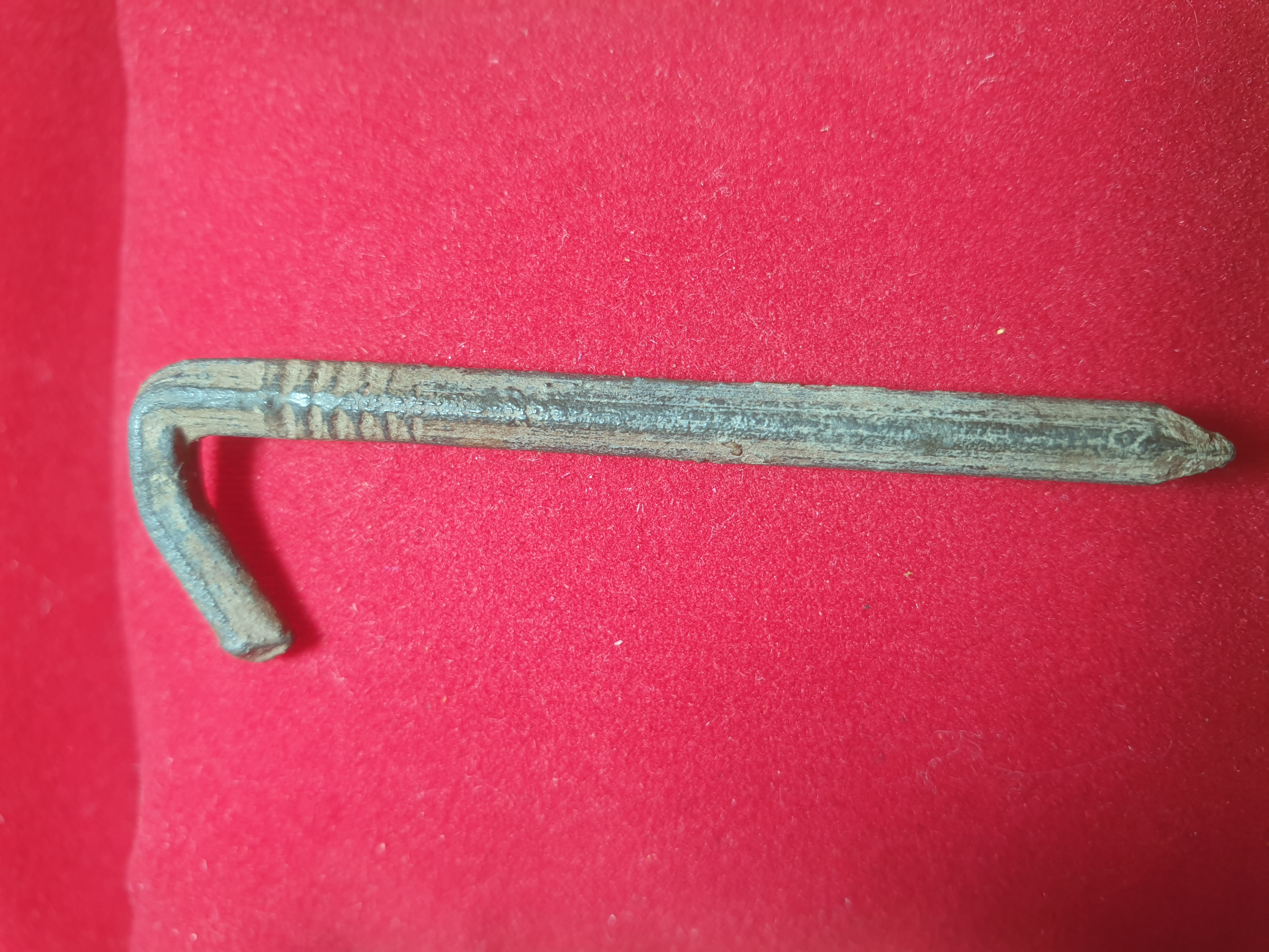 Der Haken/Hering ist 5,8cm lang und ca. 3mm stark. Er ist nicht rund gefertigt sondern eher "quadratisch". Ich hoffe man erkennt auf den Bildern ausreichend was ich damit meine. Die Patina ist mittel bis dunkelgrau, ich glaube auf den Bildern ist das Stück etwas überbelichtet.
