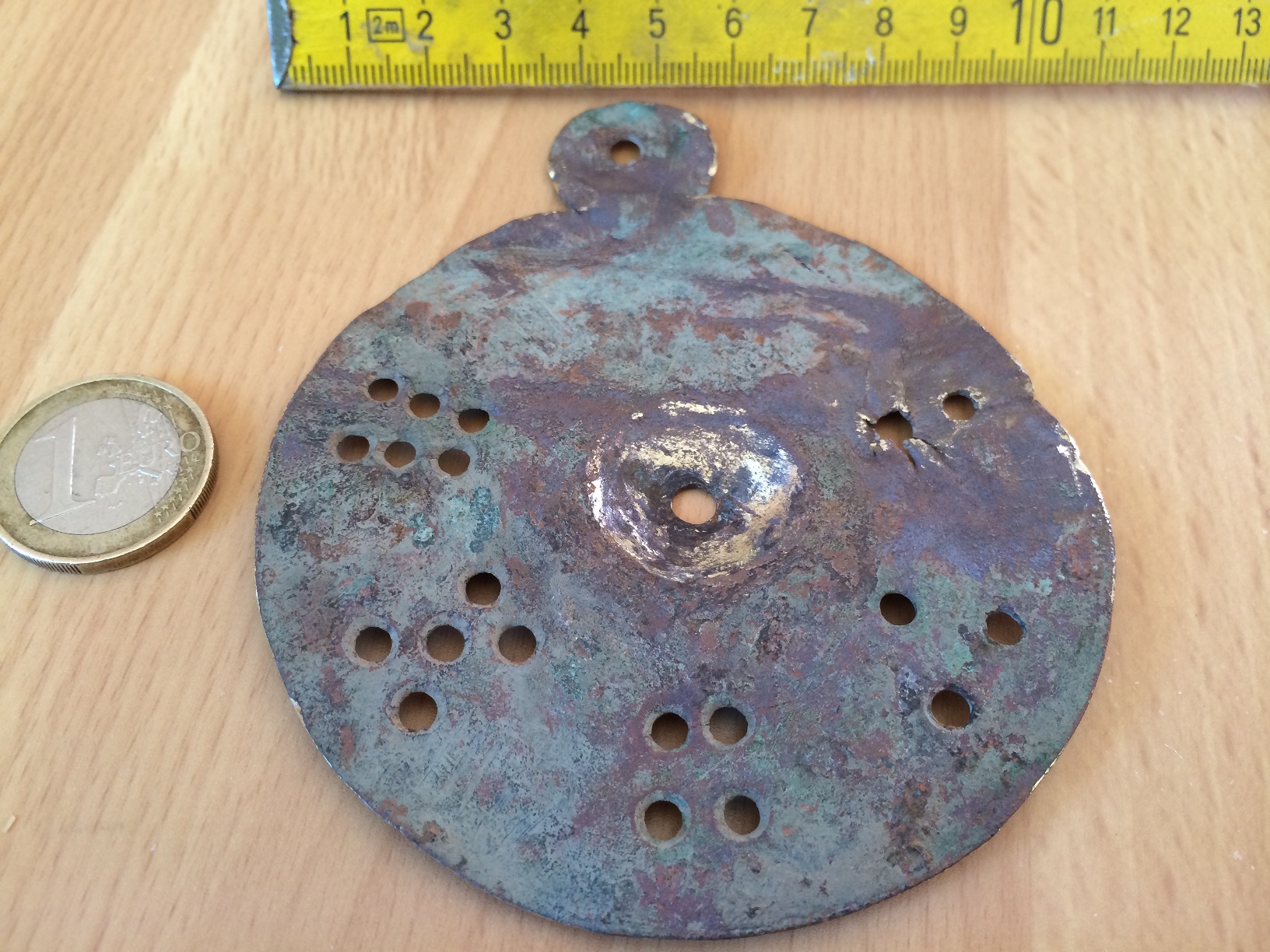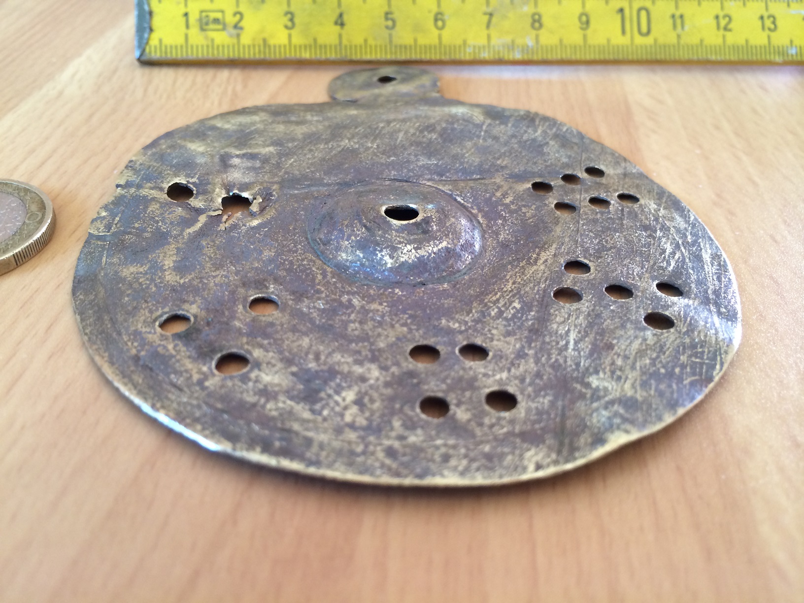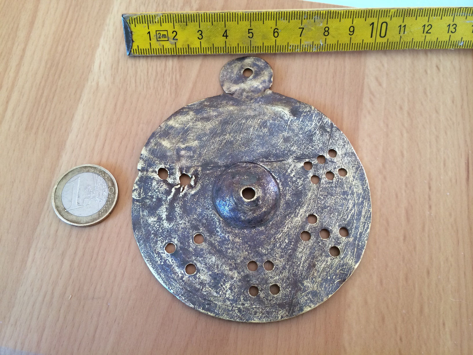 ich habe heute auf einem Acker einen Metallgegenstand aus Messing gefunden. Möglicherweise habt ihr eine Ahnung was es sein kann. Die Scheibe hat einen Durchmesser von 86 mm und ist ca 1 mm dick.
