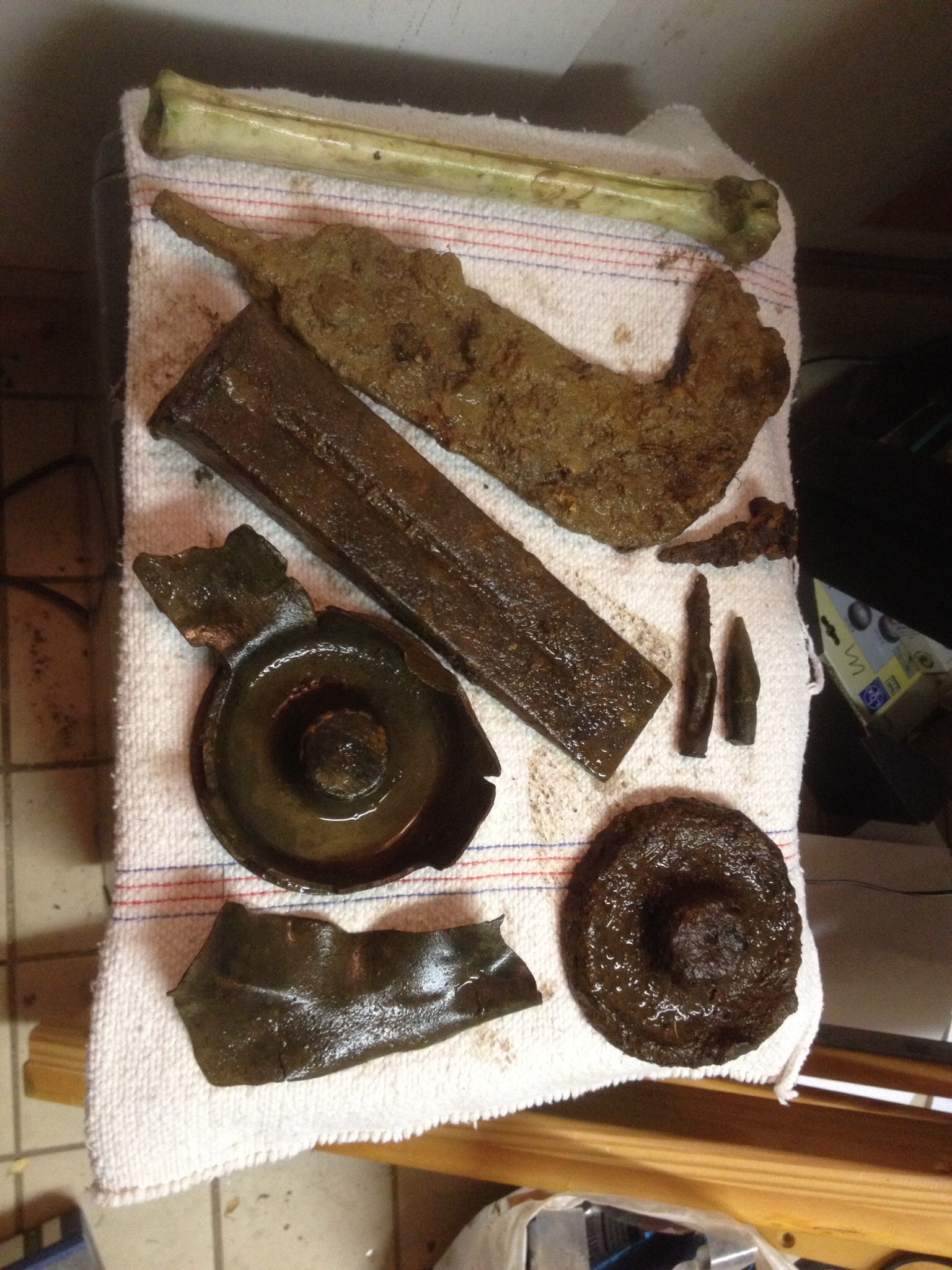 Hi Bin mir nicht sicher, hab zu wenig Ahnung vom Altertum aber das unter dem Knochen könnte Richtig alt sein ,so in Richtung Streitaxt ,Kampfbeil oder so. Kannst ja mal im Boden Fund Forum eistellen. Mfg Strulle.