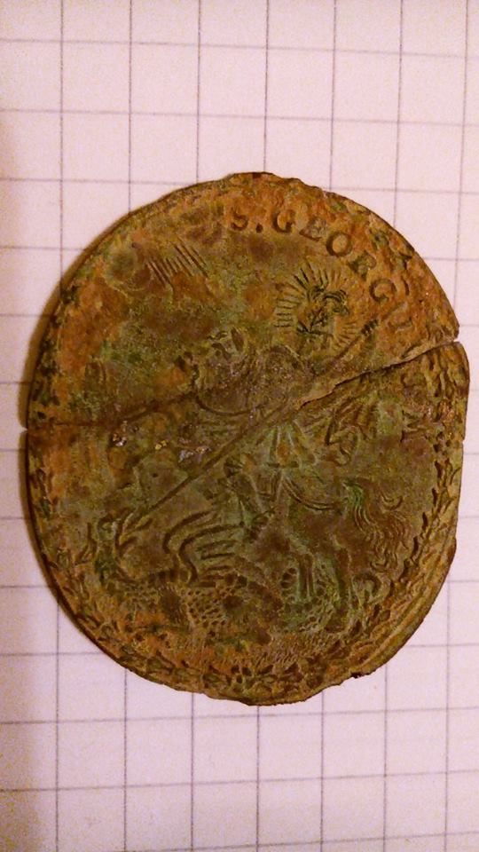 1. ovale Medaille Bronze, heiliger Georg als Drachentöter und vorne Benedict, Pestamulett und Benediktinerkreuz (ca. 1400)