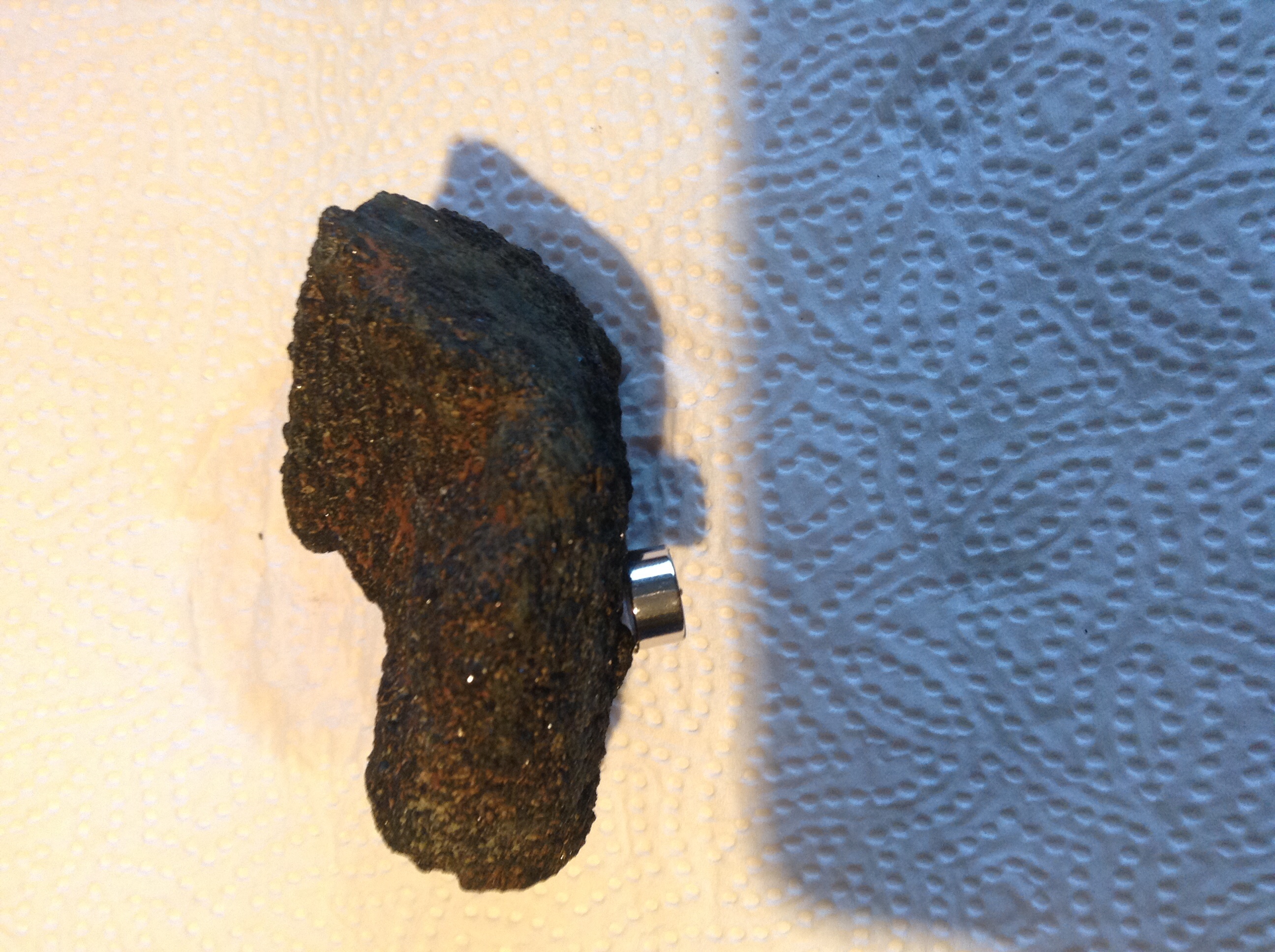 Habe heute beim sondeln einen merkwürdigen Stein an der Oberfläche entdeckt. Mein MD zeigt ihn als Metall an und er ist magnetisch. Im Licht glitzert er auch richtig doll. Er hat eine sehr raue Oberfläche.