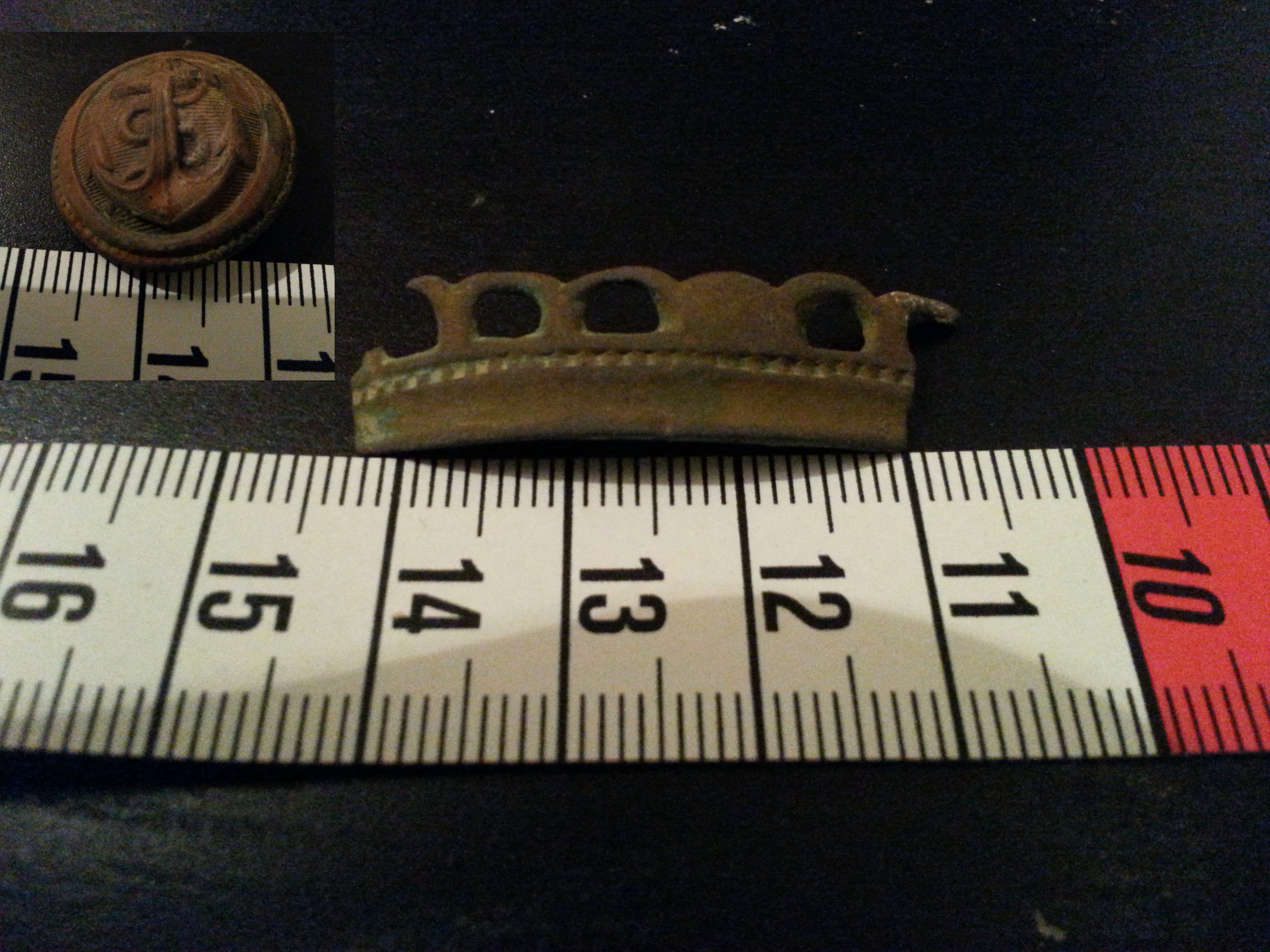 Der 3. Fund bzw 3. und 4. ,denn die Sachen lage quasi nebeneinander. Ein Marineknopf oder so und ein Stück von einem Schmuckstück,denke auch Bronze