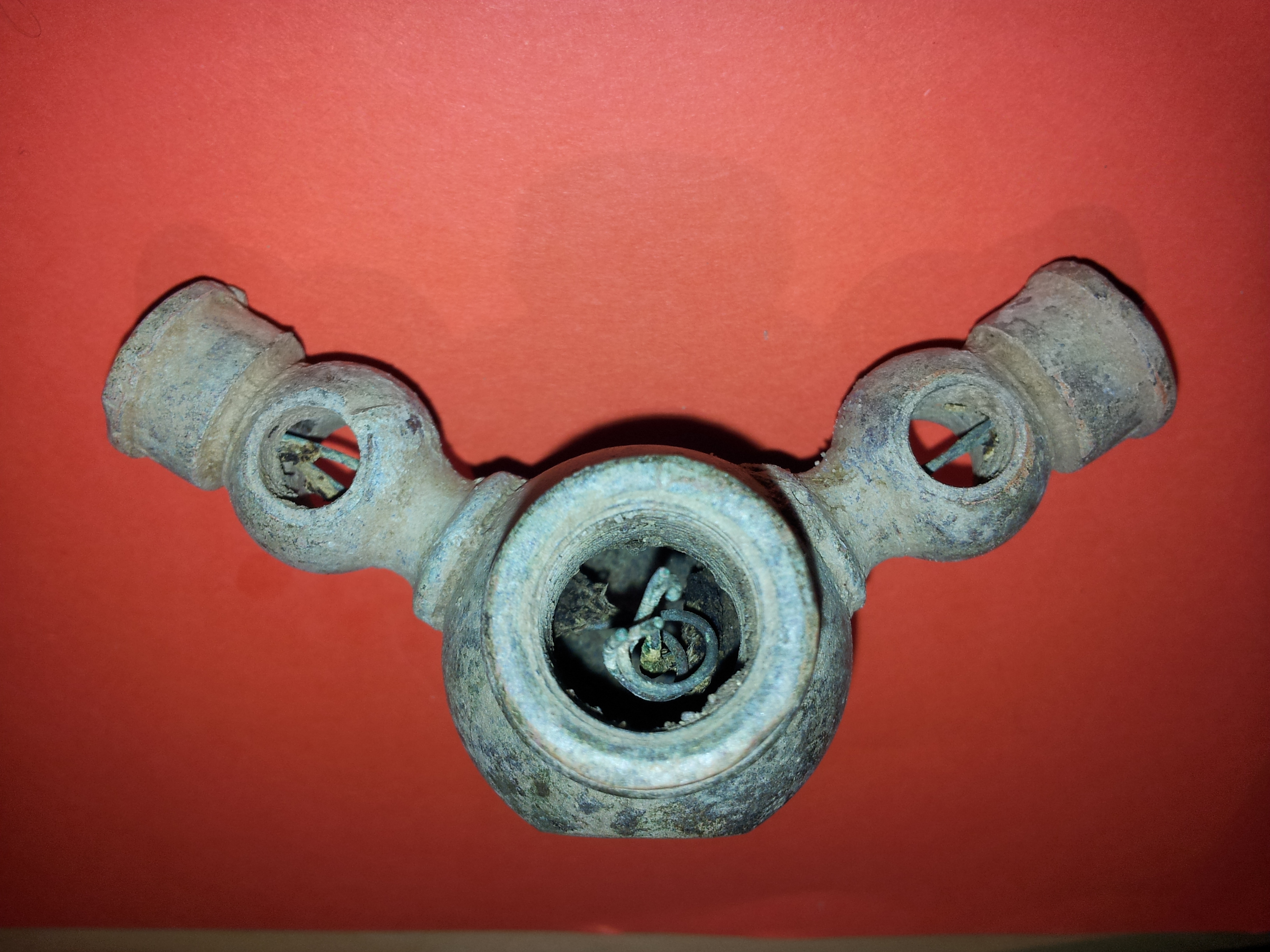 Das Teil ist aus Messing. Die beiden abstehenden teile haben ein Innengewinde. Im inneren ist ein Draht.