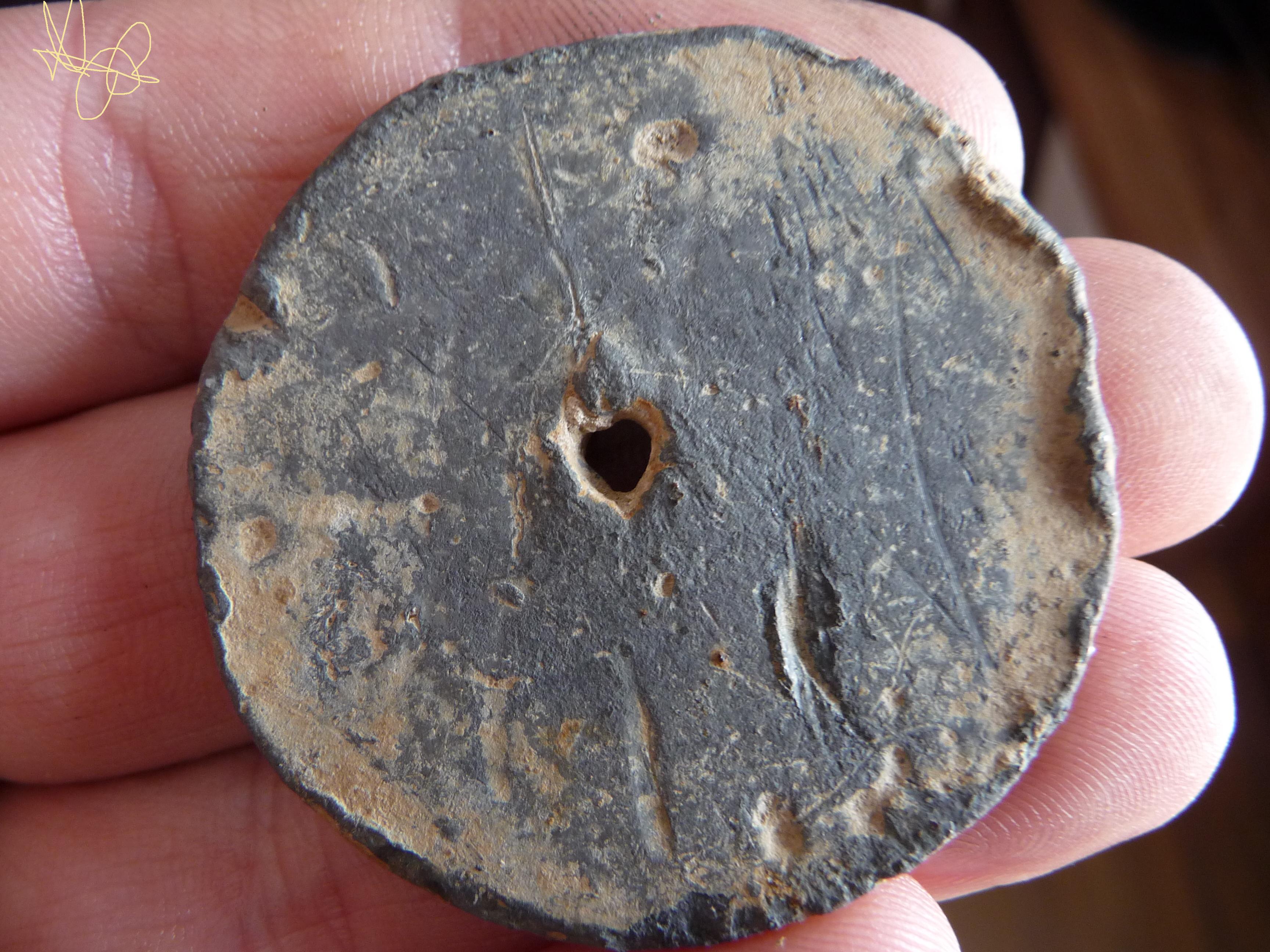 ist einfach gegossen und auf der vorderen Seite sind Initialen eingeritzt,wenn es nicht täuscht sogar doppelt und in der Mitte lässt das Loch ein Herz vermuten.