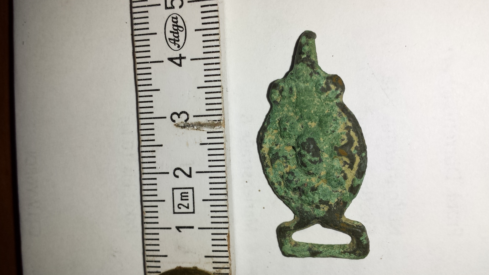 Links eine kleine Schnalle von einer Uhr, in der Mitte eine frz. Münze "Liard De Lorraine" von 1728 und rechts ein Ufo, bei dem mir jemand helfen muß. Material vermutlich Bronze. Der kleine Zapfen ist nach innen gebogen.