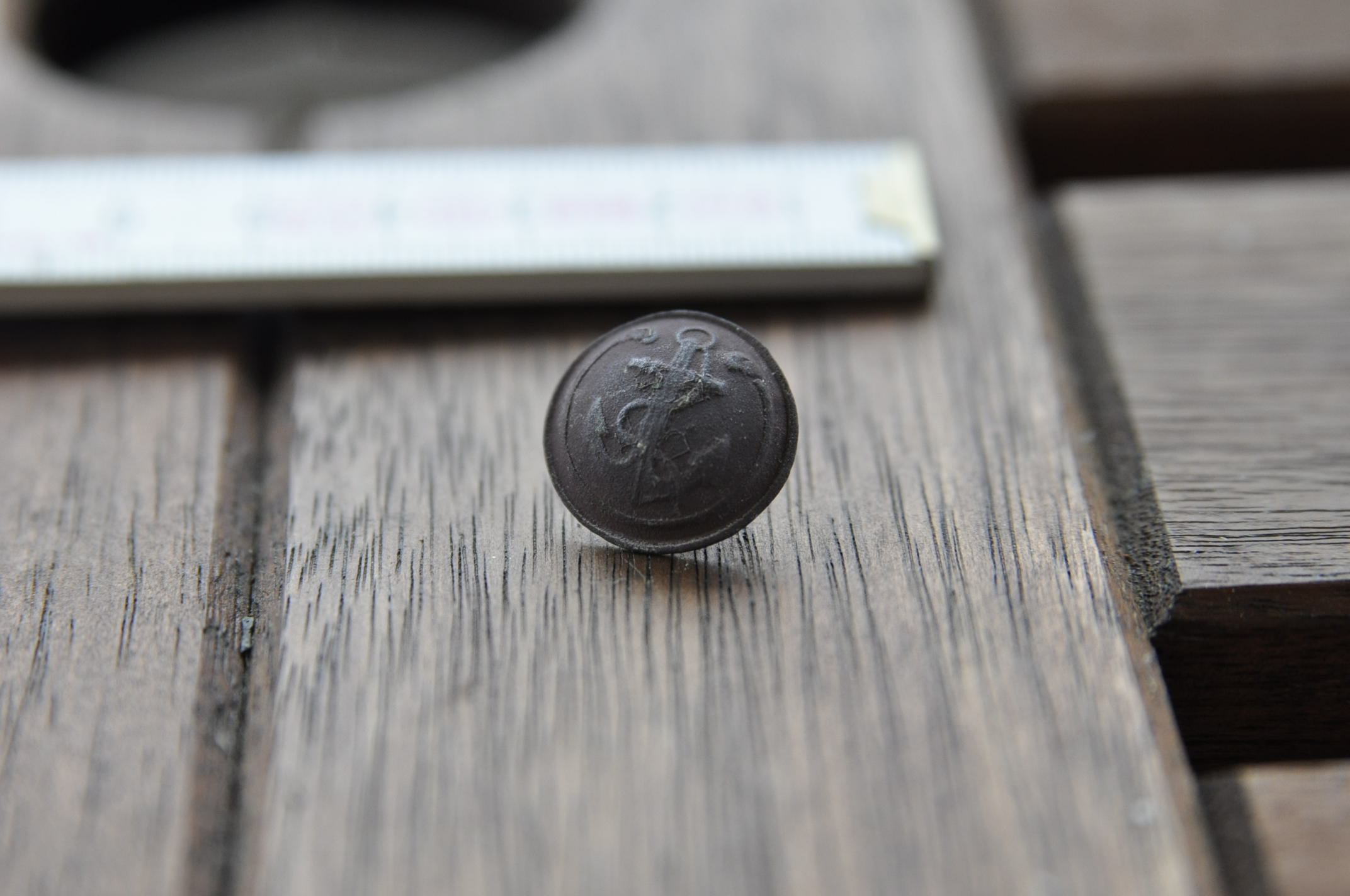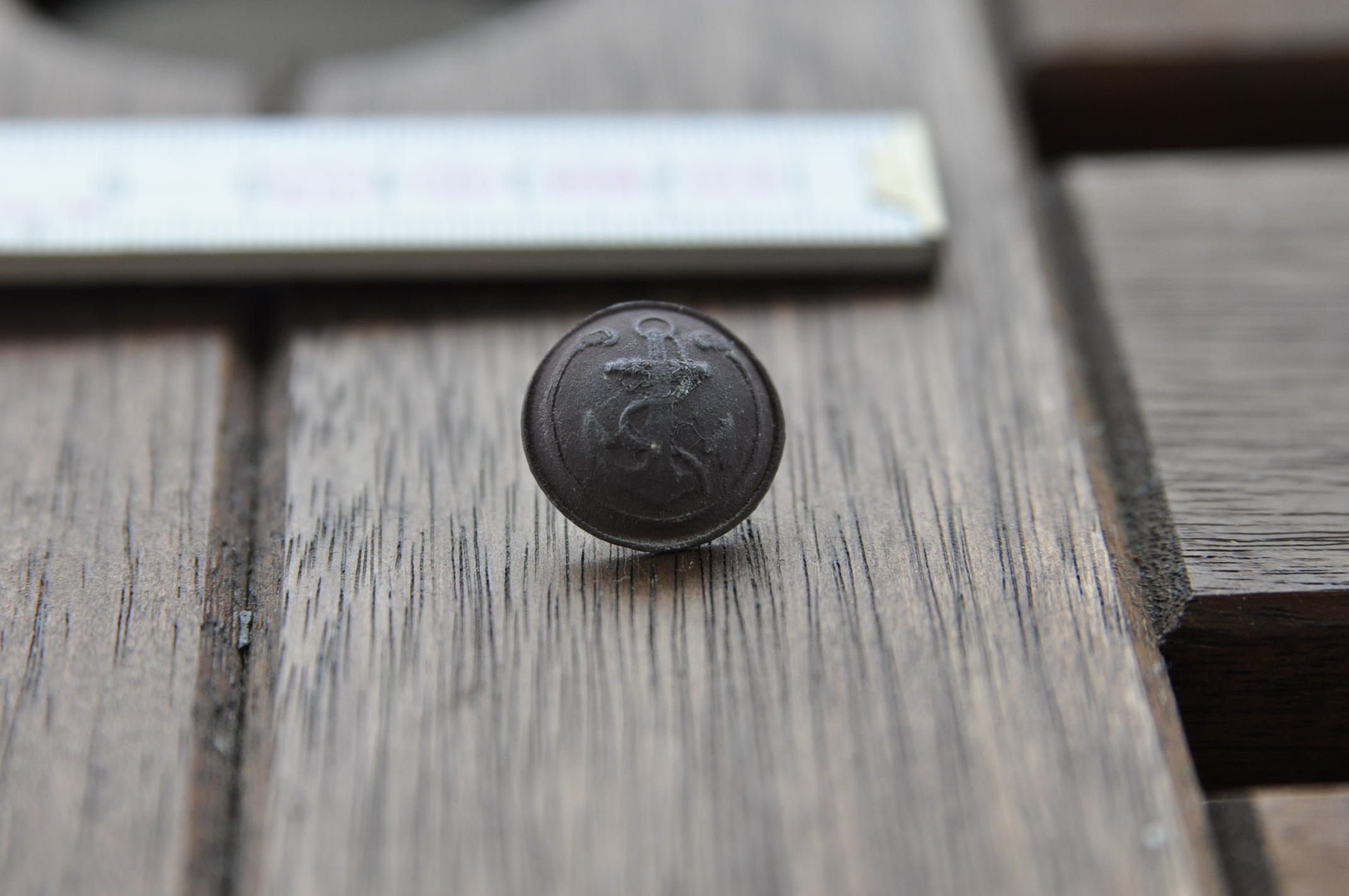 habe heute auf dem Acker diesen tollen Knopf gefunden. Der Durchmesser beträgt ca 17mm. Es gibt ja viele Knöpfe mit Anker darauf, aber ich habe keinen gefunden, der außen noch diese Ranke haben. Kann jemand sagen woher dieser stammt und wie alt er ist? Habe am Fundort auch einige Musketenkugeln gefunden. Weiter lag da noch ein Beschlag und ein Bronzeteil, welches hier auch im Forum gepostet ist.