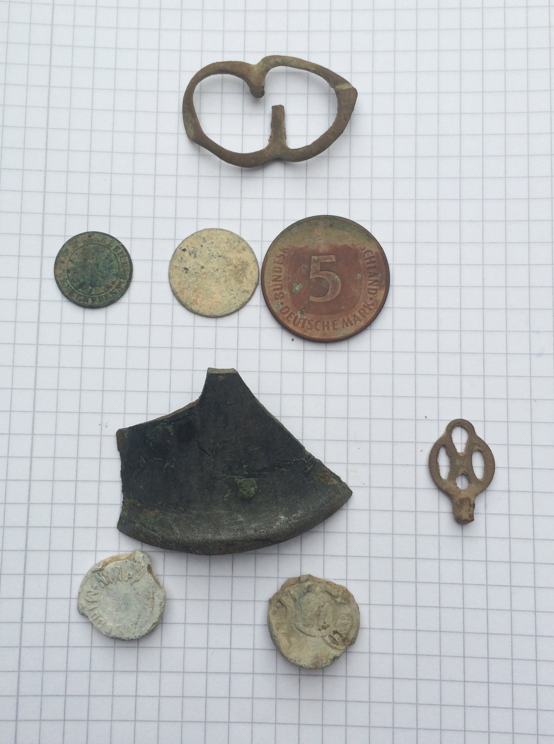 Eine Schnalle , 5 Mark , Münzleiche , ein Reichspfennig , stück Glocke ,2 Plomben und ich vermute mal ein Uhrenschlüssel.