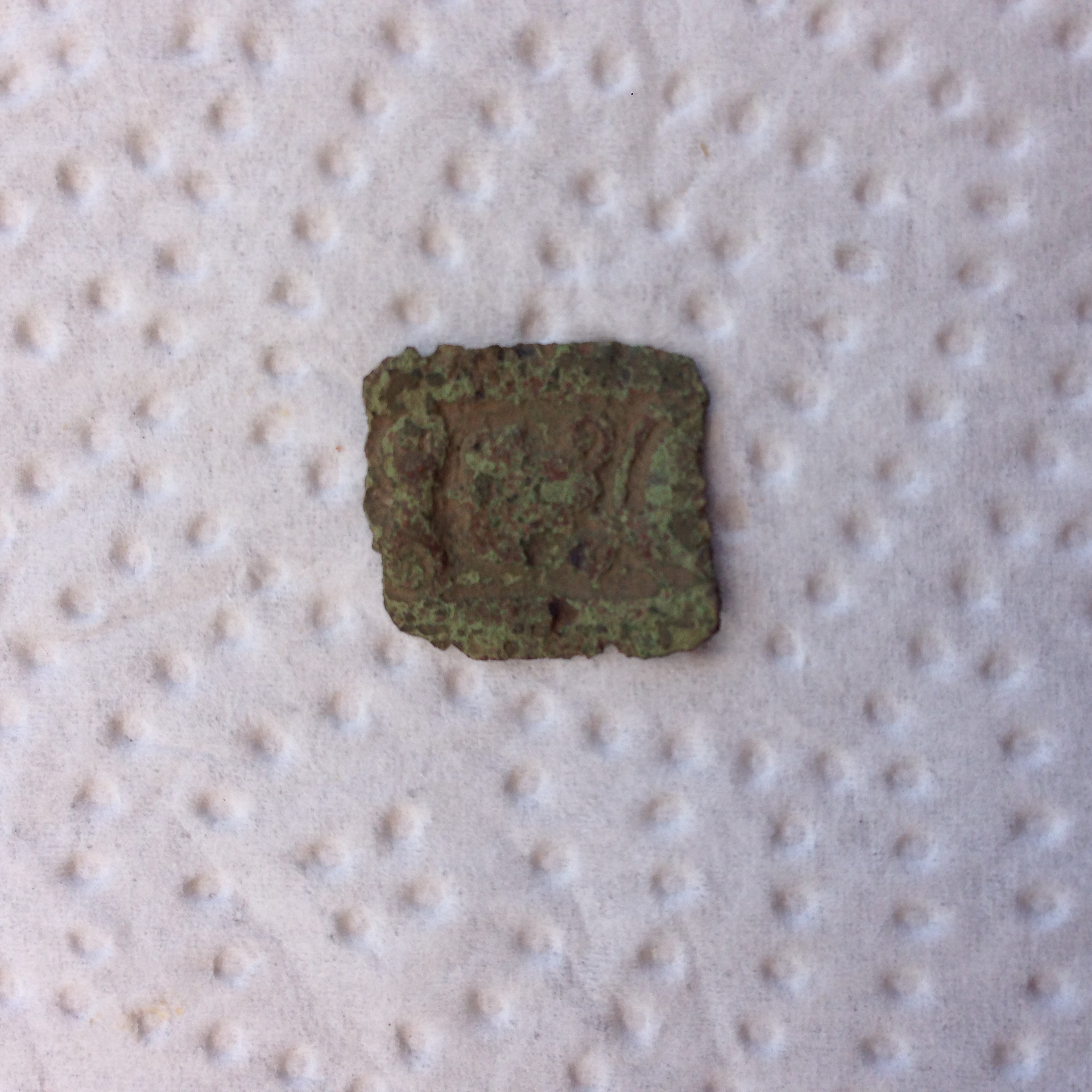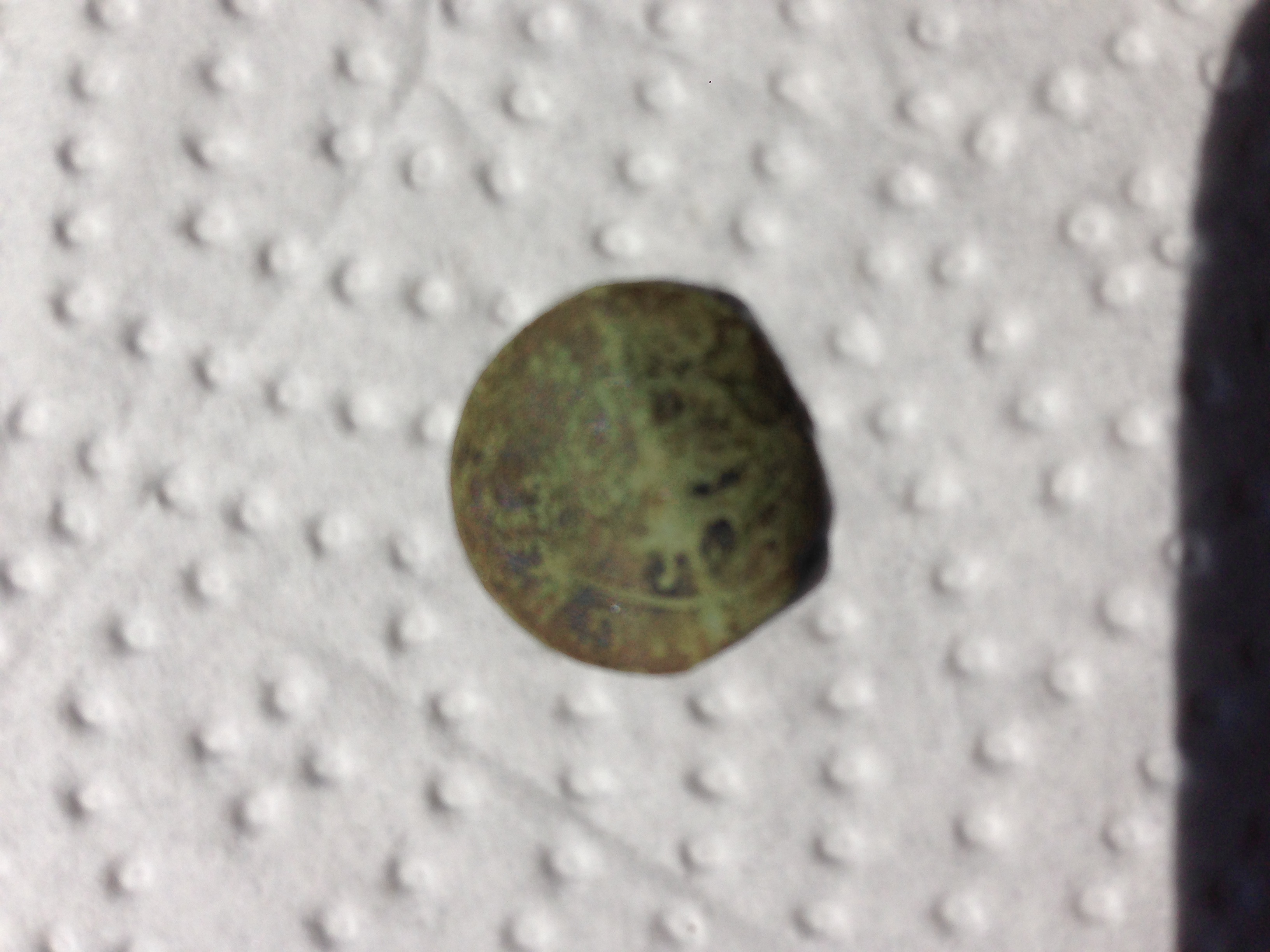 auf einem Acker habe ich diesen (ich vermute) kleinen Anhänger gefunden, ca. so gross wie ein 10 cent Stück. Grünlich angelaufen und recht stark verwittert. Ich glaube auf der Vorderseite ein ritterliches Wappen zu erkennen...kann jemand etwas dazu sagen....nicht weit weg lag eine Münze (Demi Liard von 1781) und noch eine weitere Münze...siehe Foto...unweit lag auch diese alte Knopf (Oese auf der Rückseite sah irgendwie handgeschmiedet aus). Auf dem Knopf glaube ich das Muster eines Blattes zu sehen....???