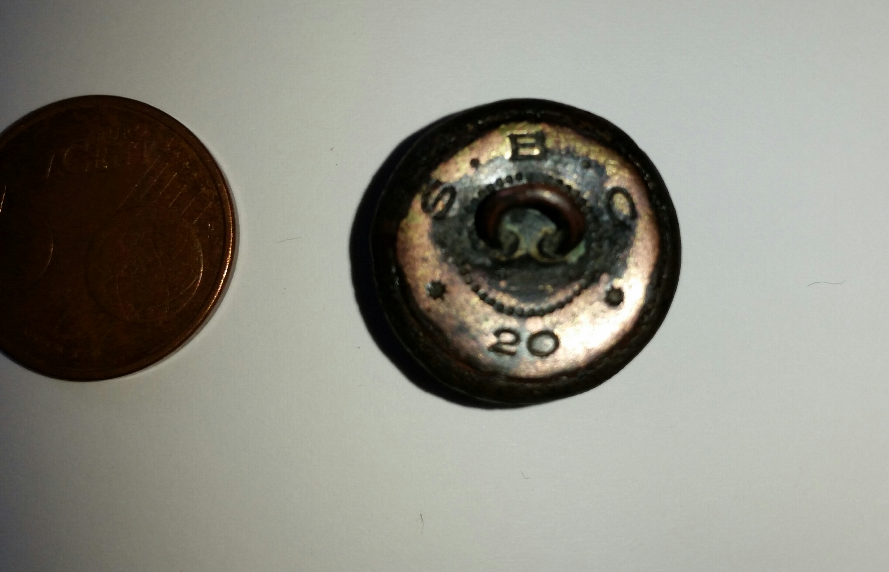 hab neulich diesen Halbkugelknopf/Uniformknopf gefunden und hätte gerne gewusst wie alt er ist. Mit der Bezeichnung auf der Rückseite habe ich im Netz nichts gefunden. Das Unterteil ist aus Messing das Oberteil ist aus Eisen.