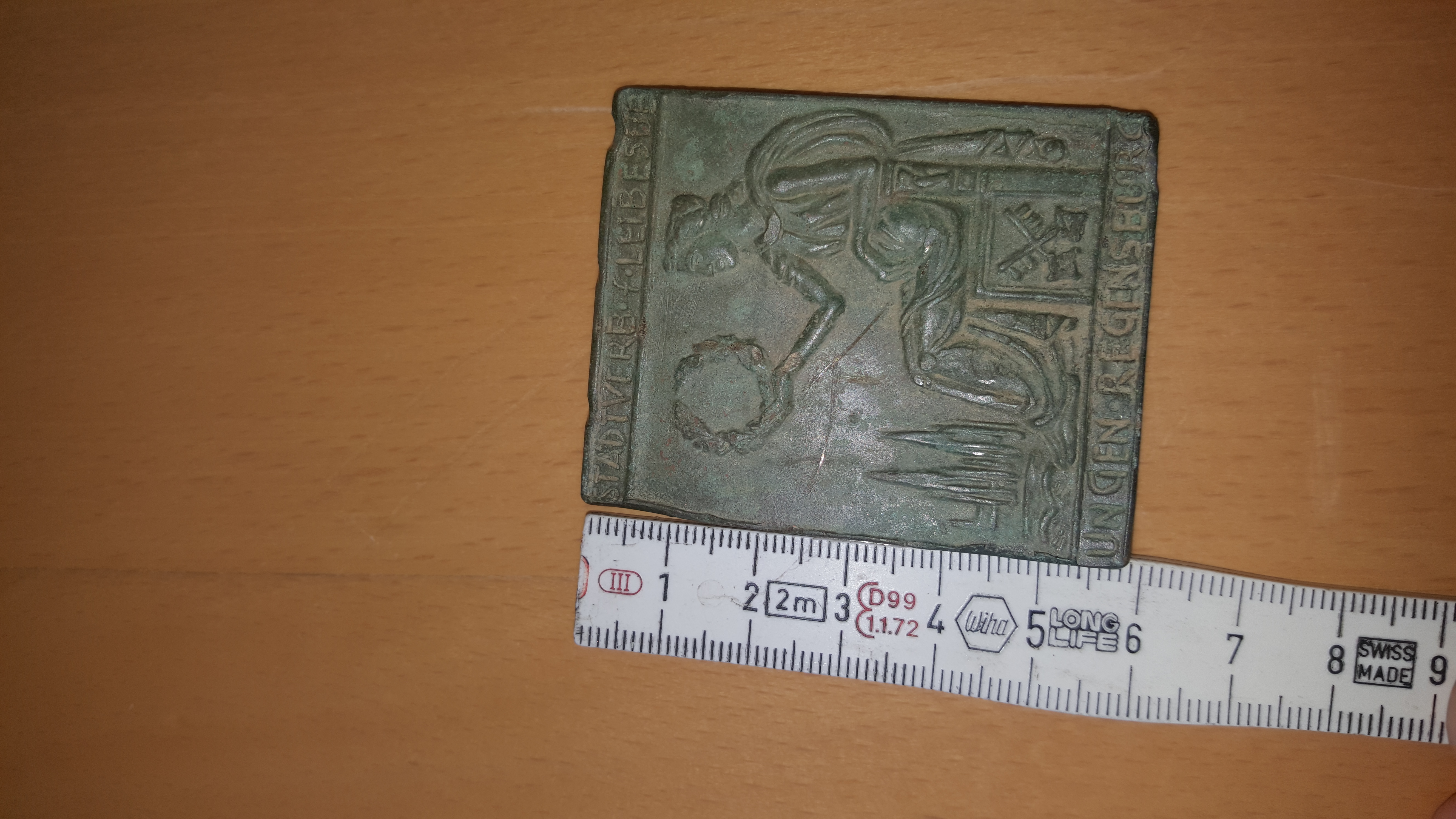 DHS hat geschrieben:Also, hier wird es sich um eine Ehrenplakette des Stadtverbandes für Leibesübungen der Stadt Regensburg handeln, der Stadtverband galt als Hauptverband der einzelnen Stadtteilen, ähnlich der DFB etc. Diese dürfte vermutlich einem Geehrten Mitglied einer Teilorganisation gehört haben. Material Bronze? Rückseite?
