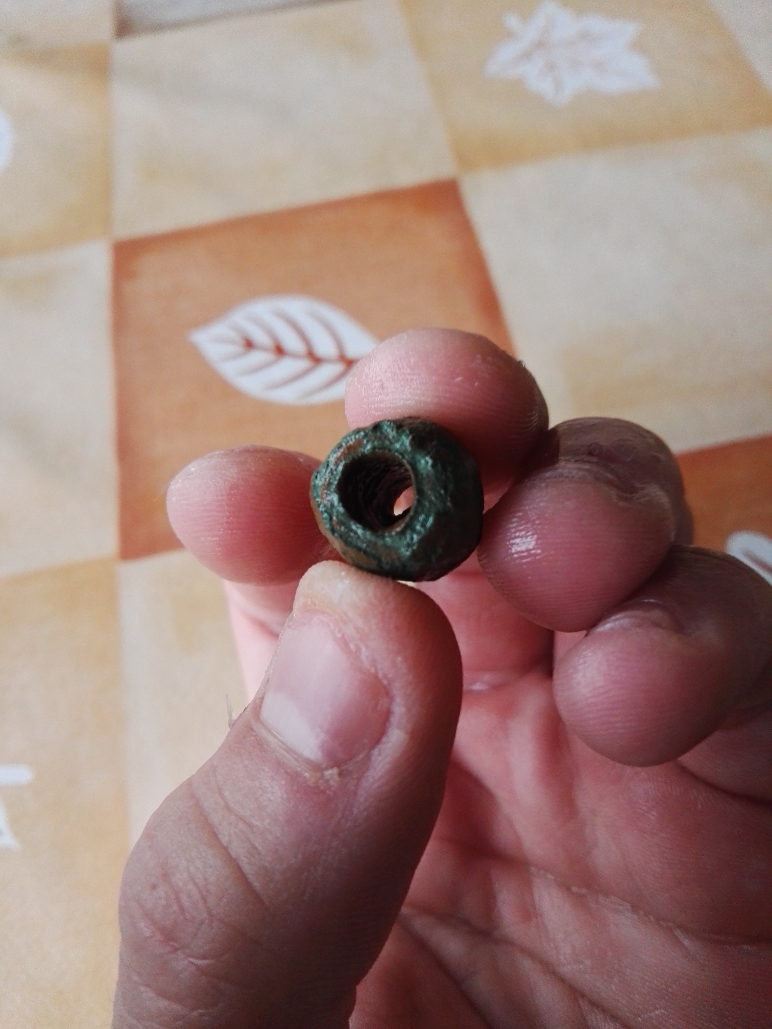 Das untere loch ist größer als das obere! Aber denkt ihr nicht an haarperle oder halsschmuck? Ist definitiv aus bronze